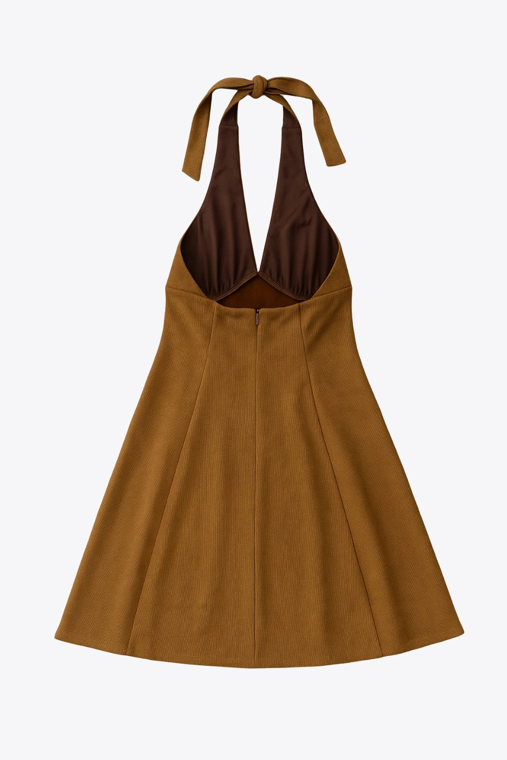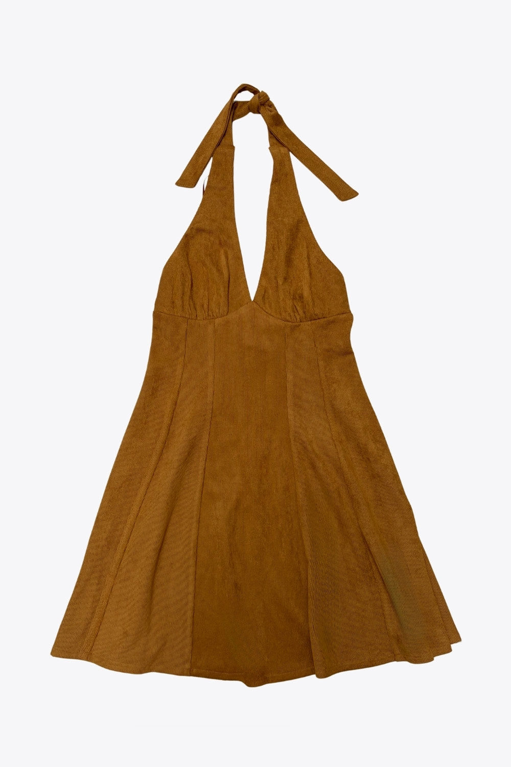 Vestido corto de gamuza, cuello halter con lazo amarrable posterior, escote v con cortes y plisados decorativos, costuras frontales, corte en a y escote en espalda. Cierre posterior con cremallera oculta.