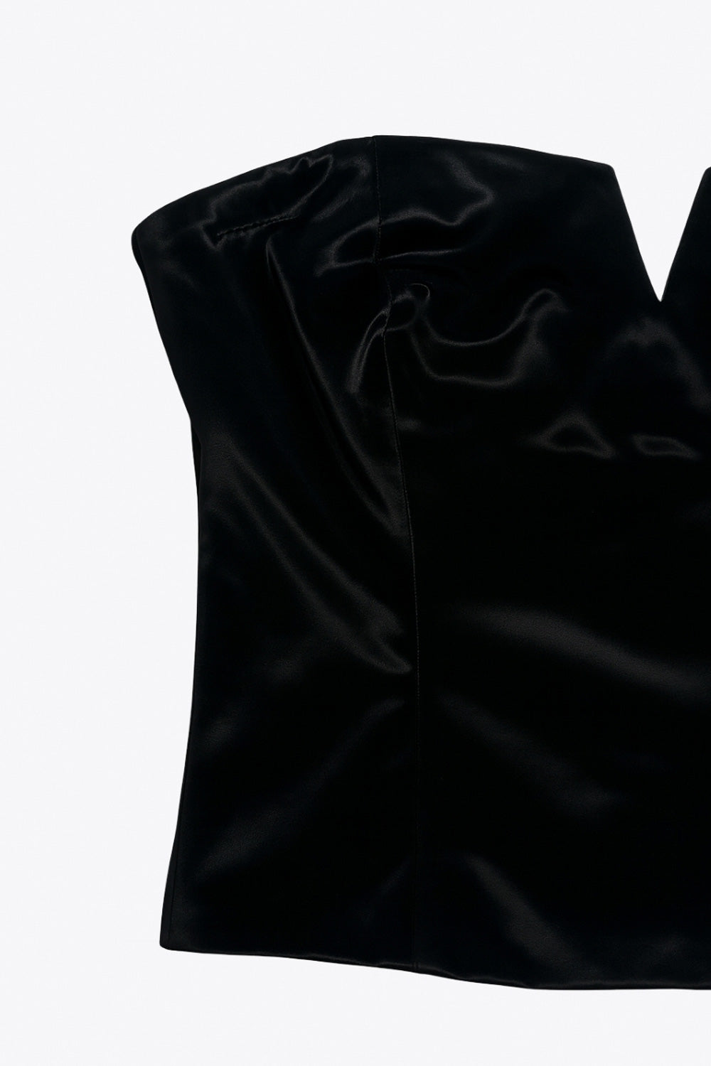 Top tubo corto de fit ajustado, efecto piel, escote corazón con corte decorativos frontales y cierre posterior con cremallera visible en contraste.