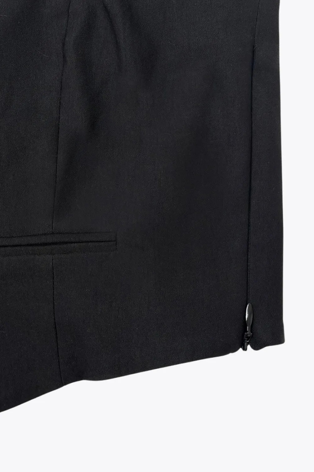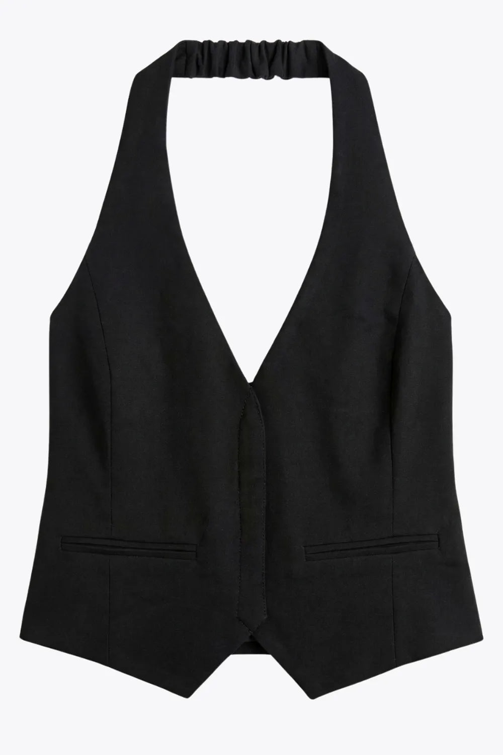 Chaleco corto cuello halter, fit ajustado, escote v, cierre frontal con hilera oculta de botones, vivos decorativos frontales y bajo v frontal. Escote en espalda y detalle de trabilla ajustable posterior.
