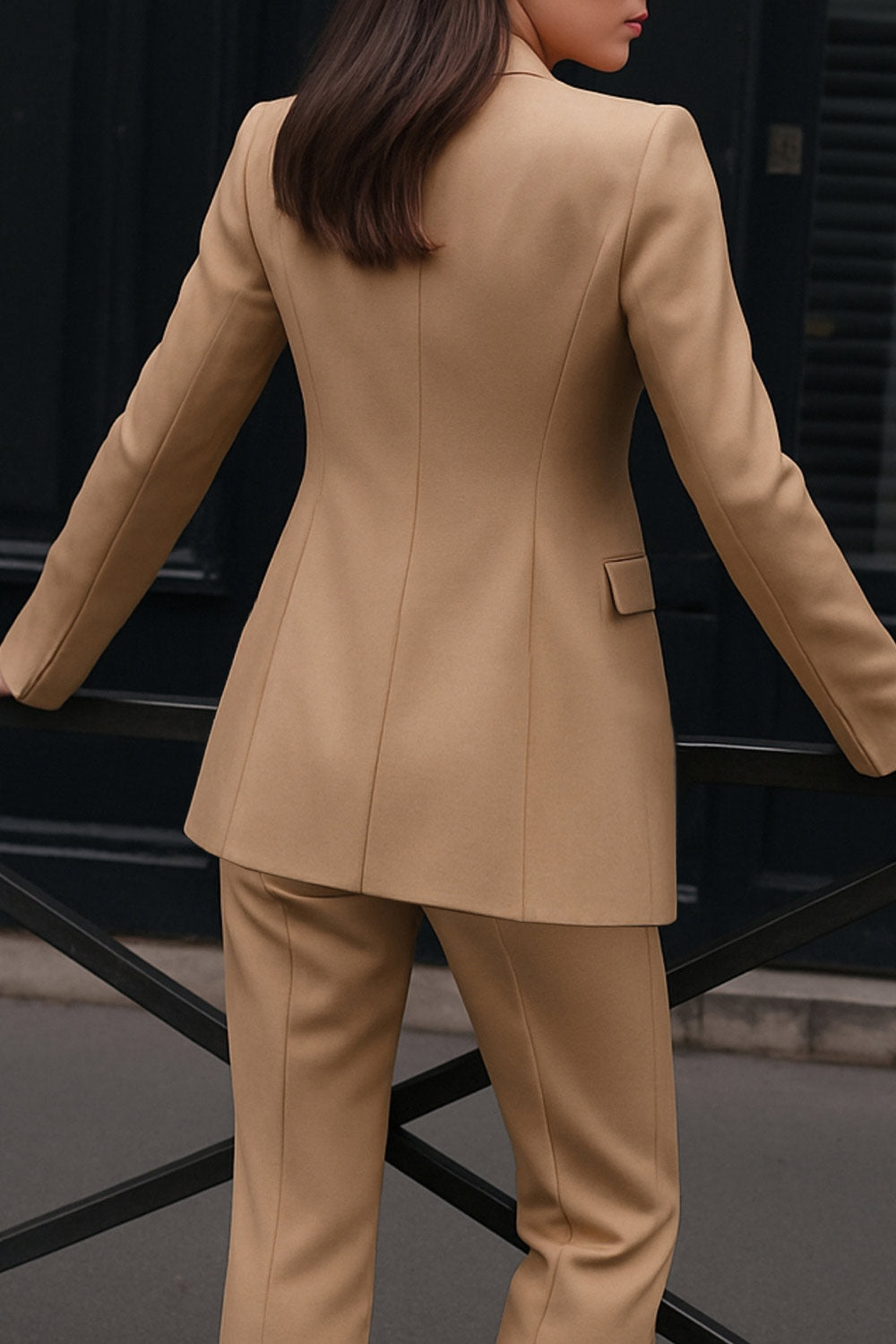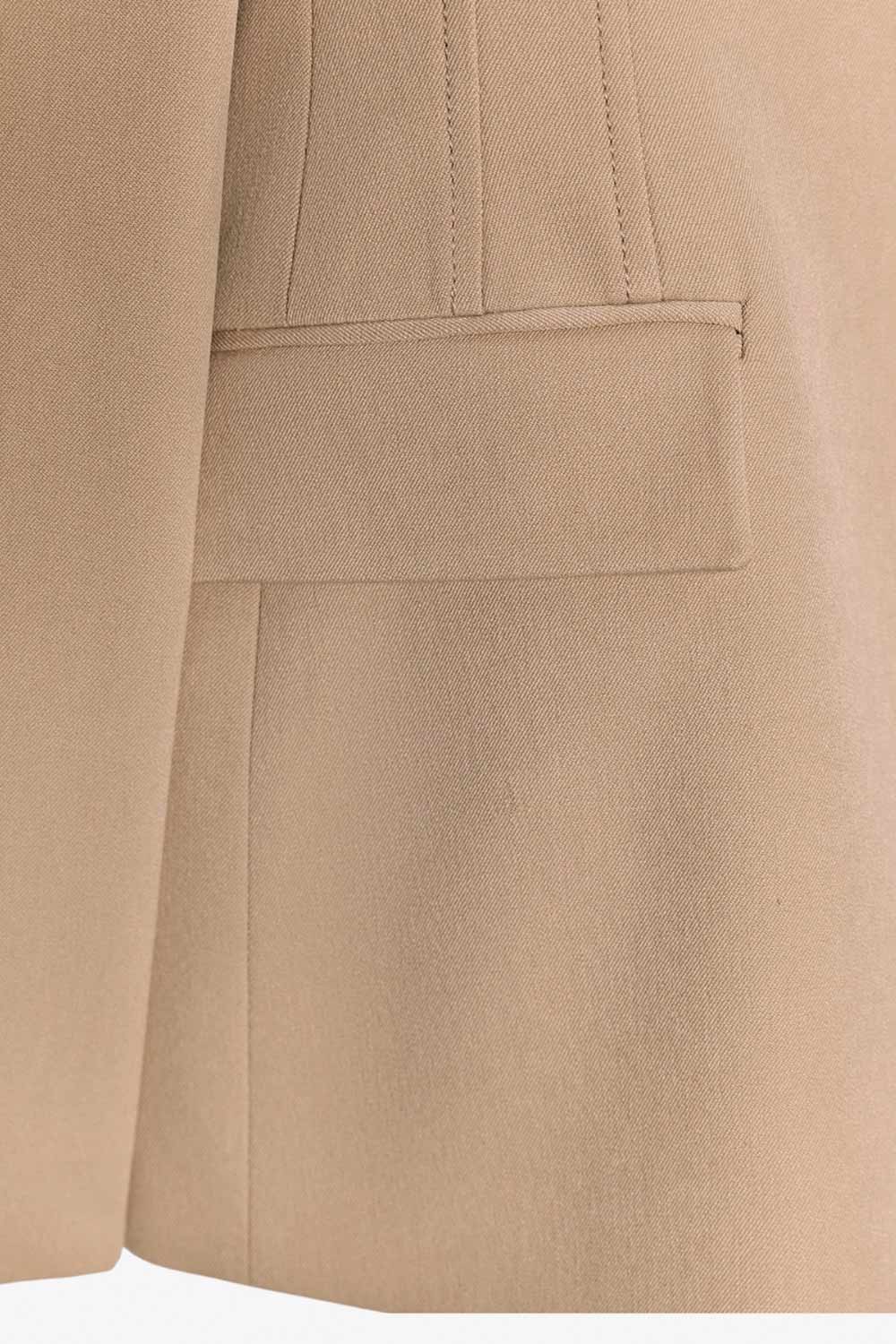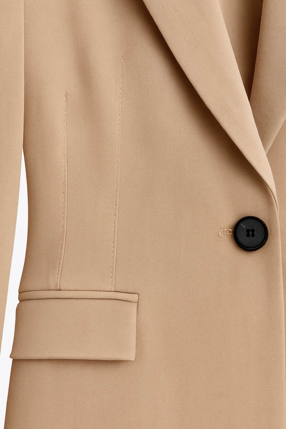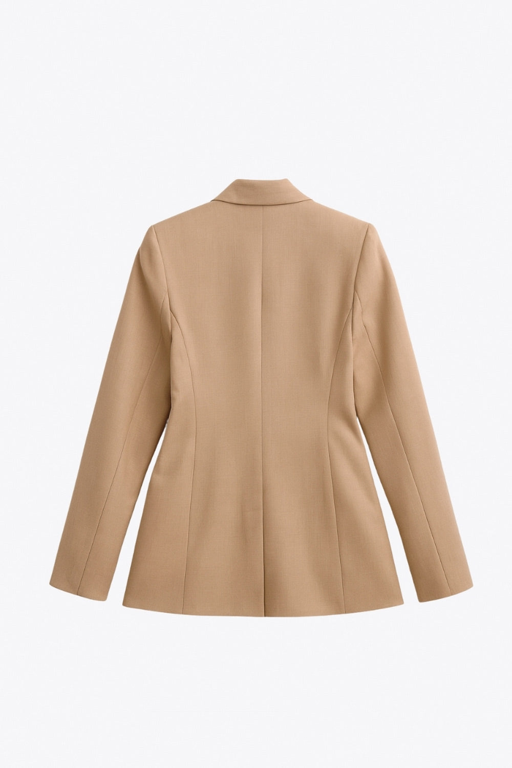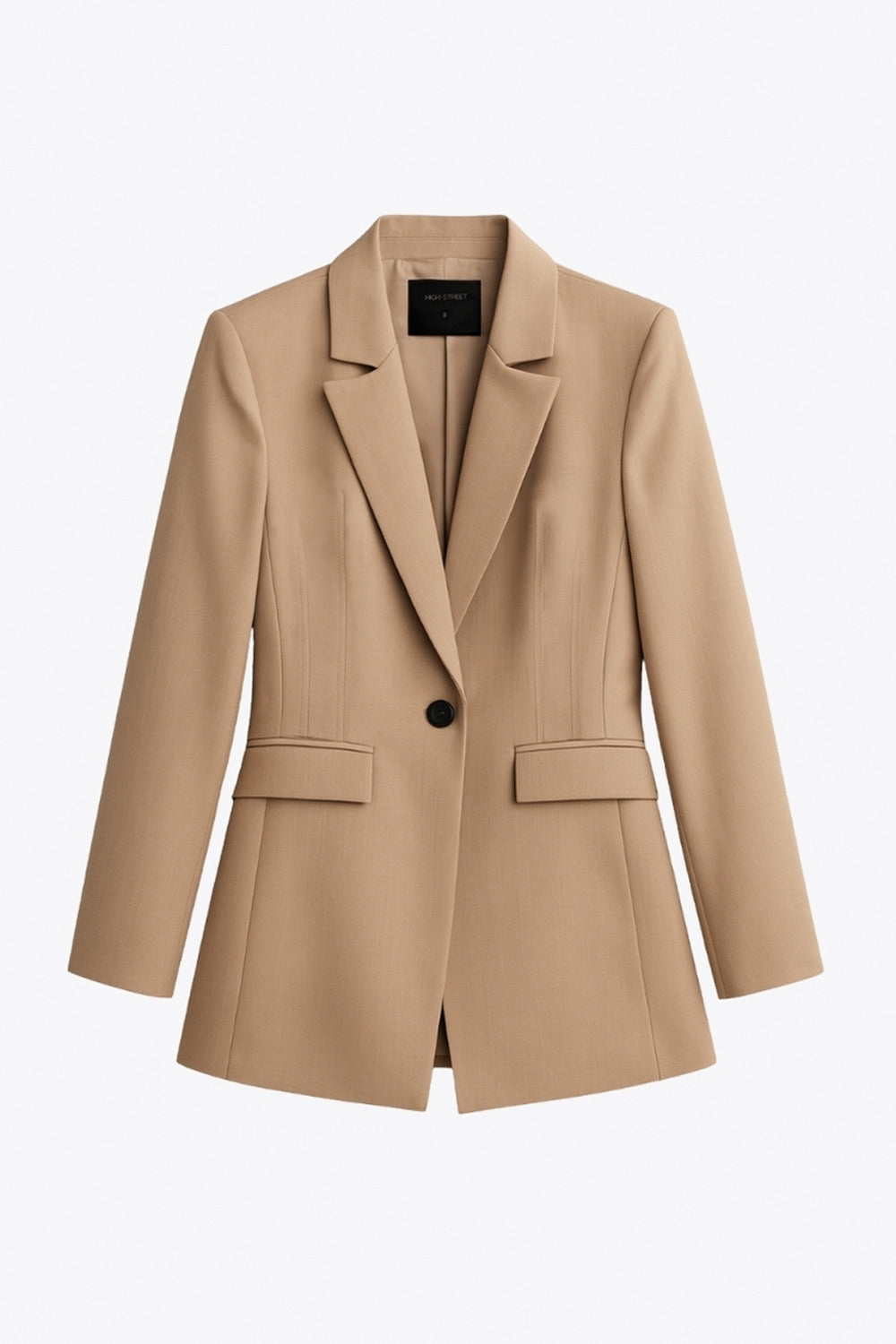 Blazer de fit ajustado, manga larga, pinzas frontales, bolsillos delanteros con cartera, solapa y hombreras. Cierre frontal con botón en contraste.