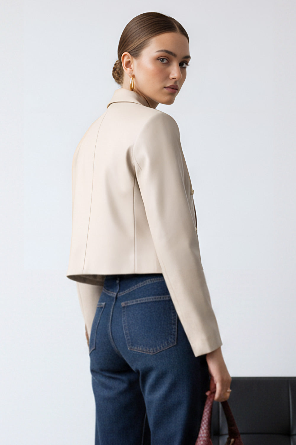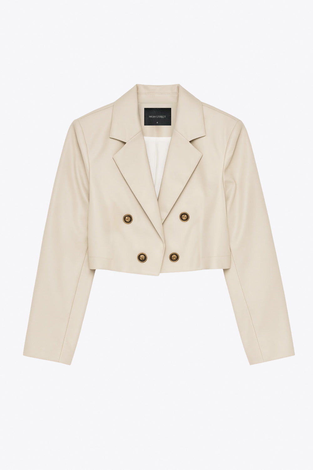 Blazer corto abierto de efecto piel, fit recto, con hombreras y solapa, manga larga y botones decorativos frontales en contraste.