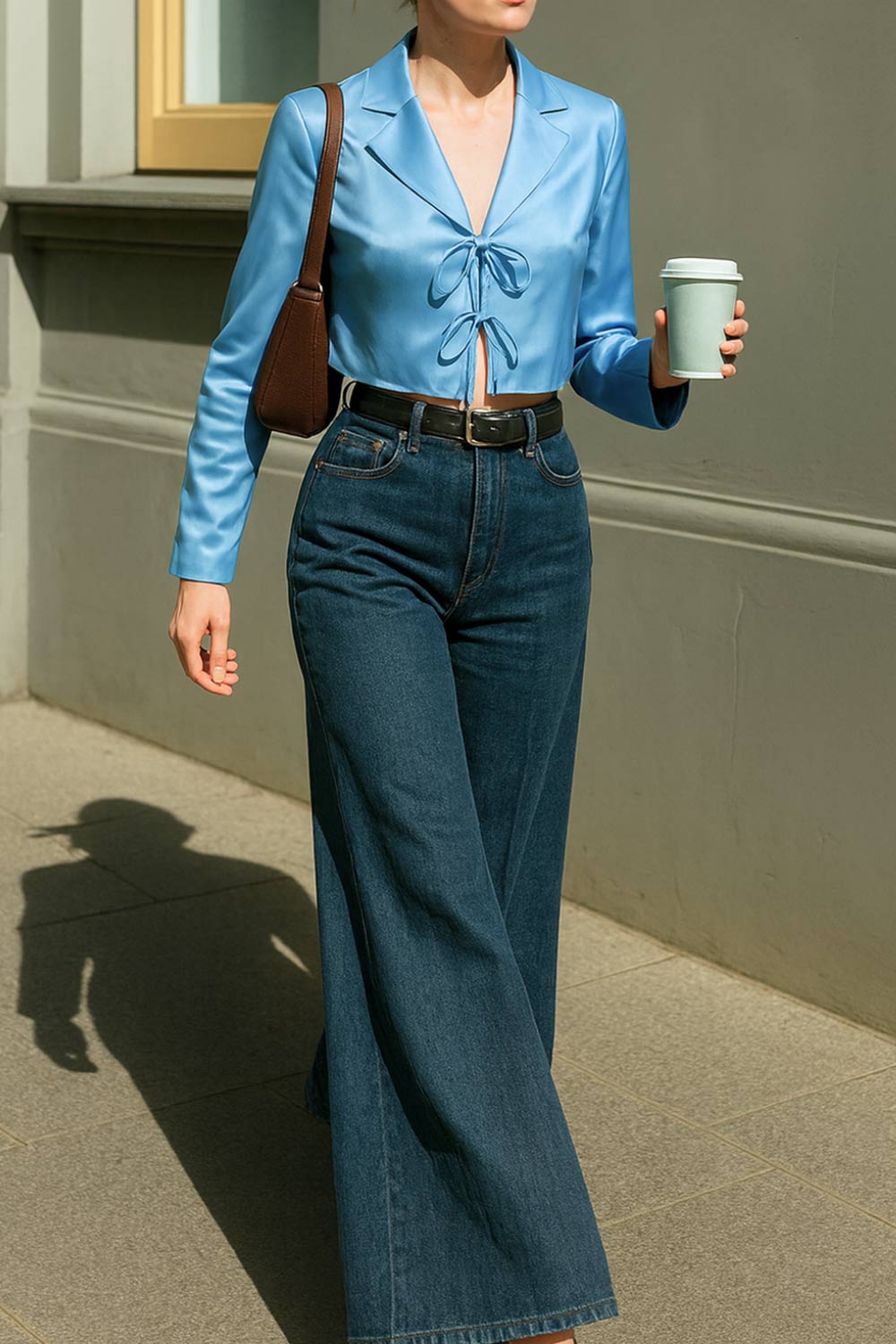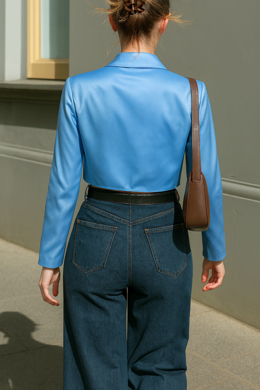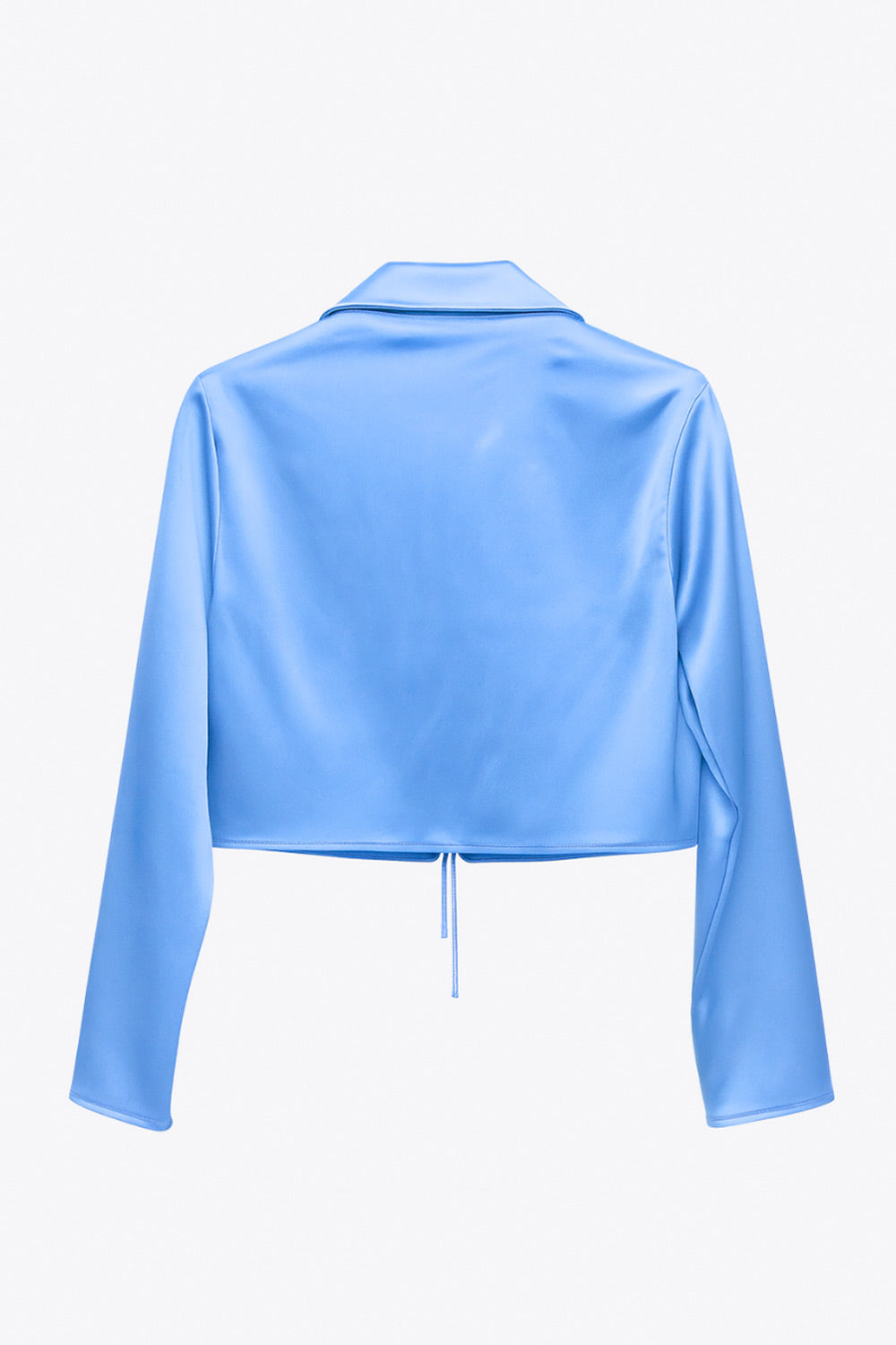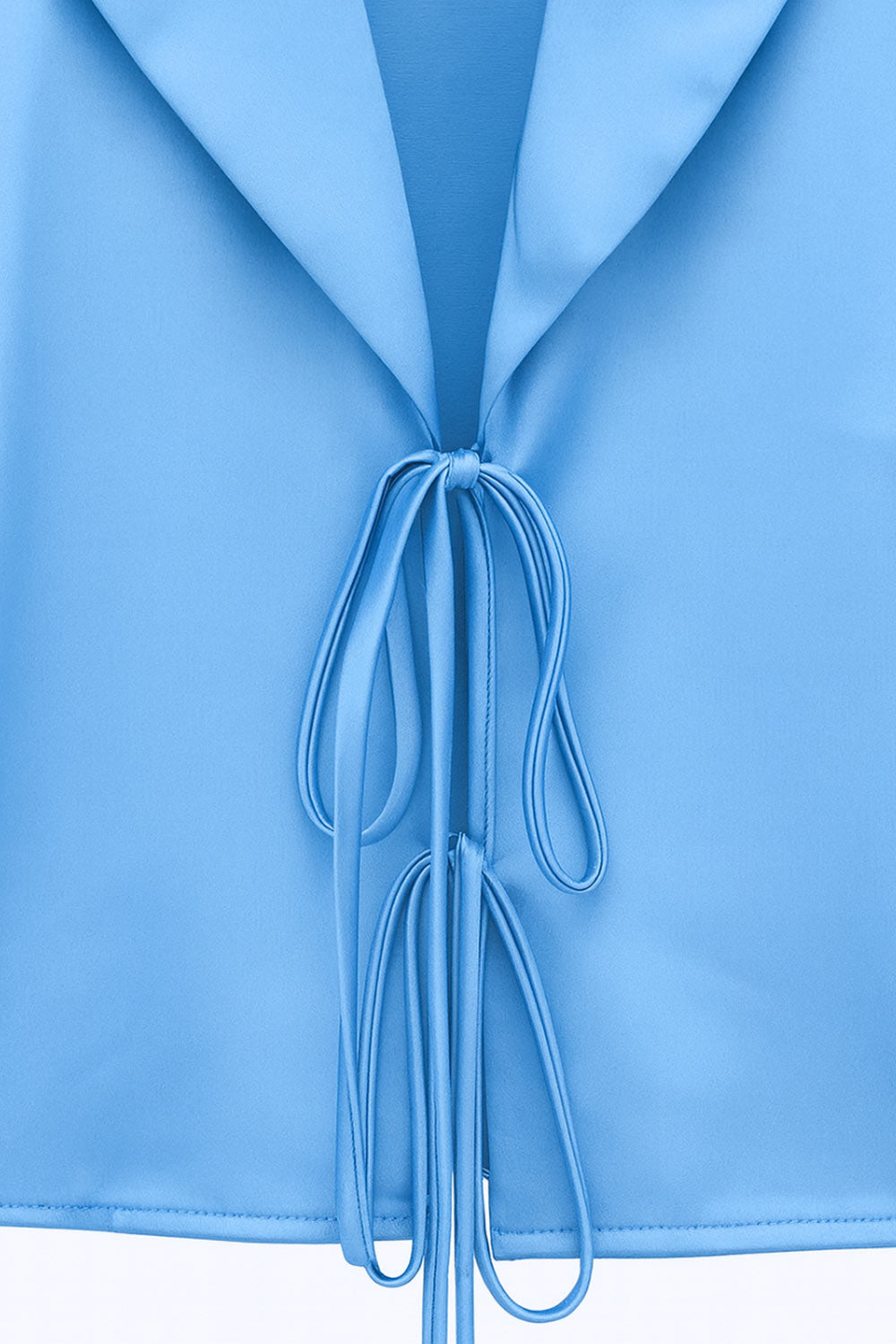 Blazer corto satinado de fit recto, manga larga, con solapa y cierre frontal con doble lazo amarrable.