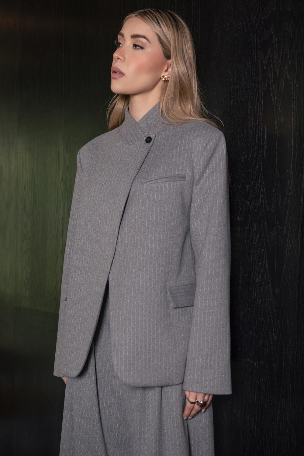 Blazer cruzado de fit oversized, estampado rayas, con cuello solapa cruzado y hombreras, manga larga, vivo frontal, bolsillos delanteros con cartera. Cierre frontal con botón.