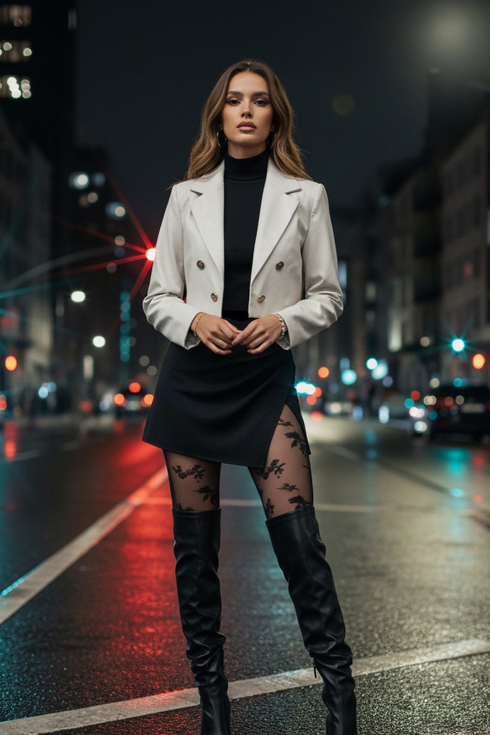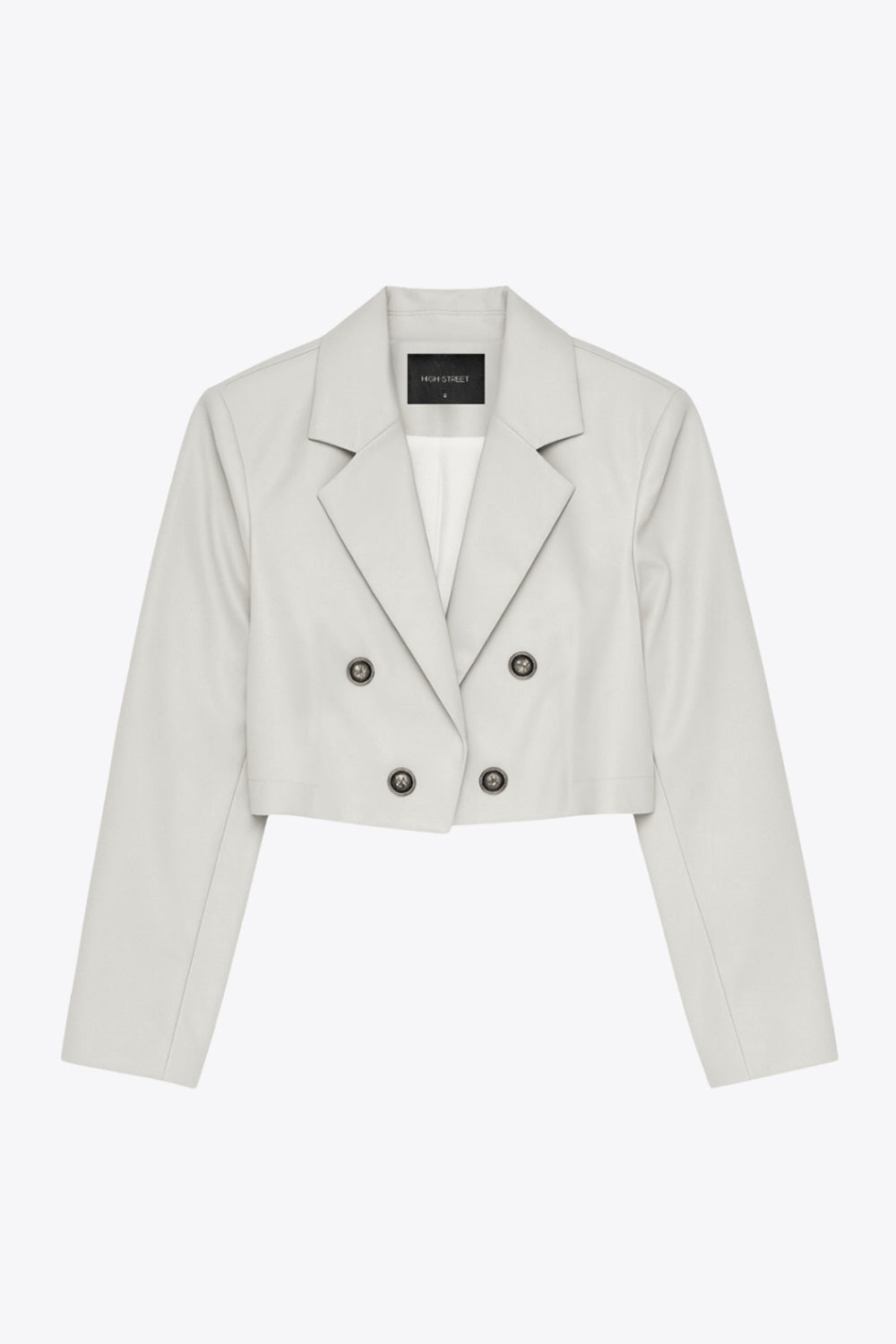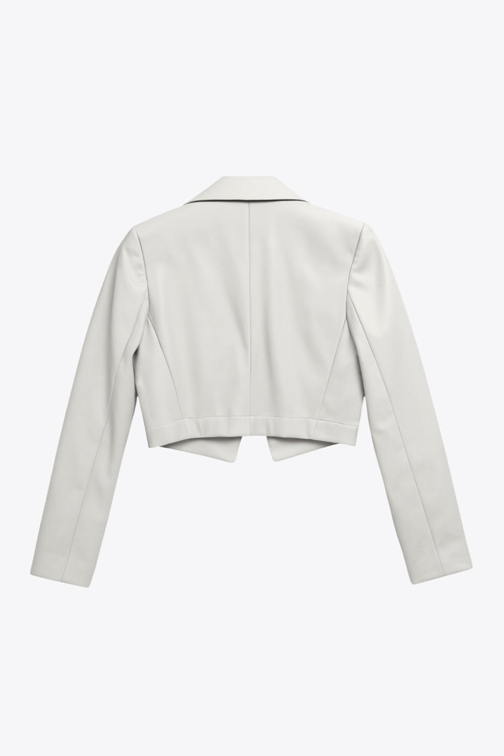Blazer corto abierto de efecto piel, fit recto, con hombreras y solapa, manga larga y botones decorativos frontales en contraste.