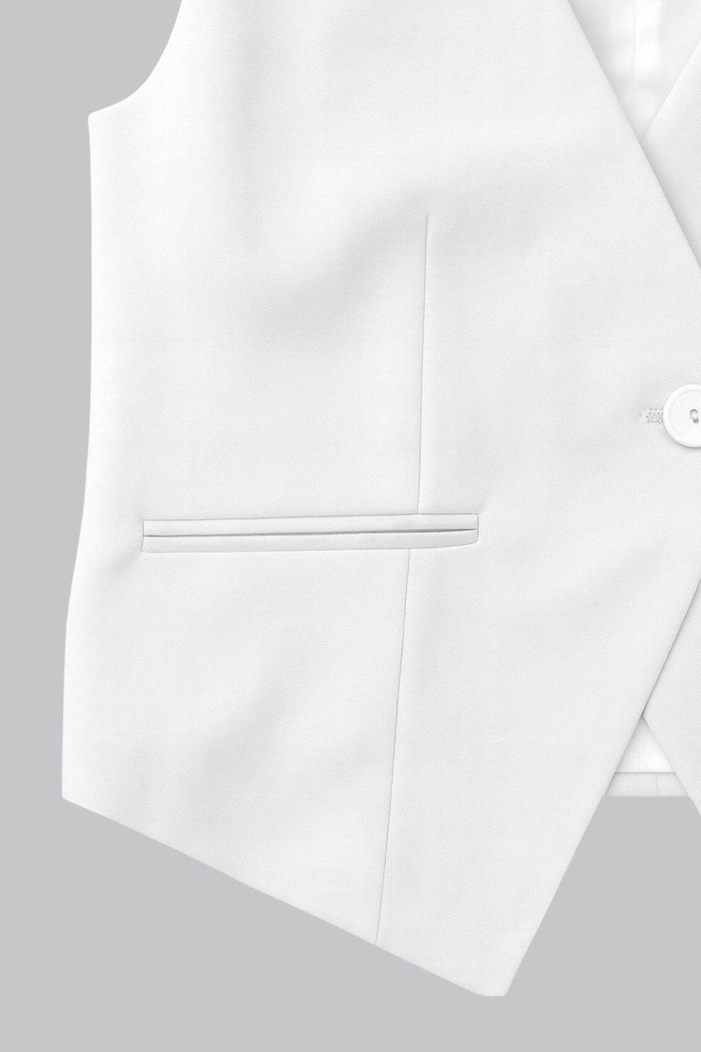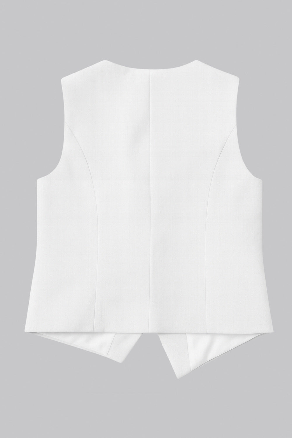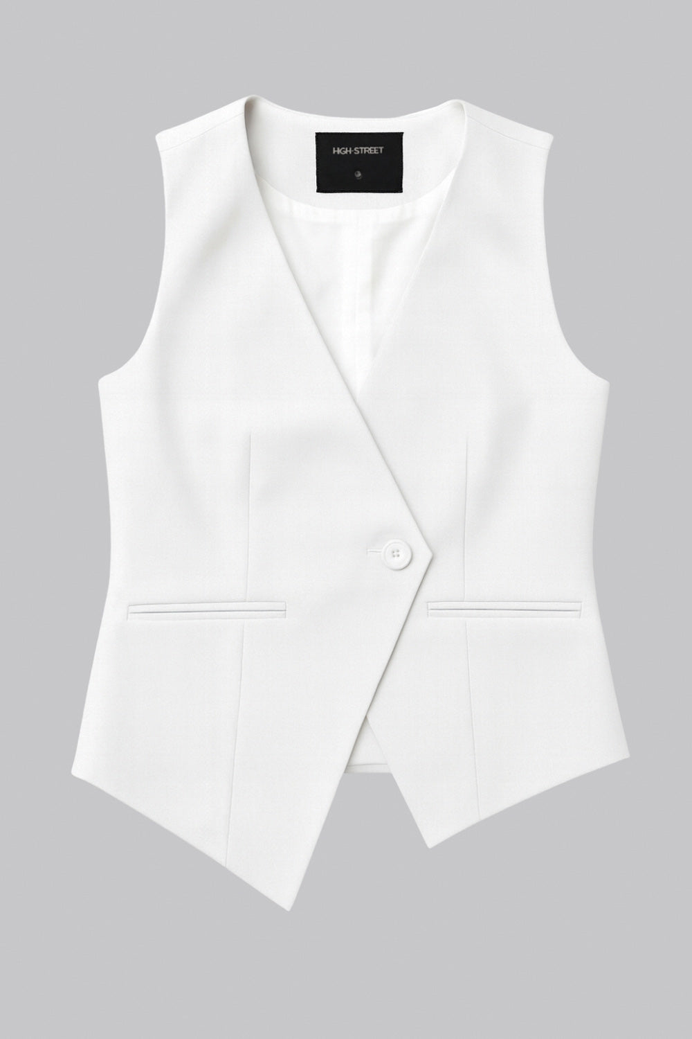 Chaleco asimétrico de fit ajustado, escote v, vivos decorativos frontales y cierre frontal con botón en contraste y bajo asimétrico.