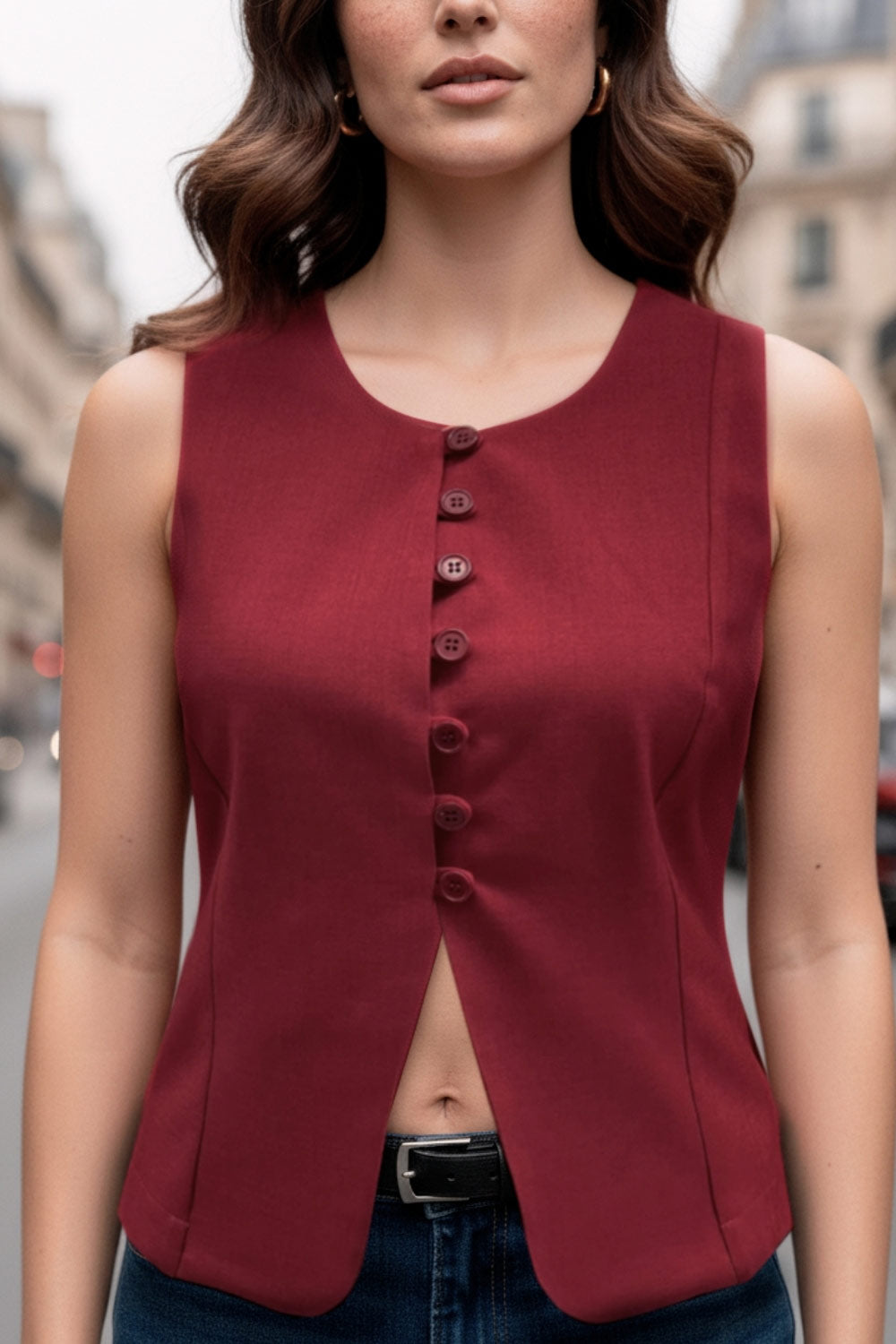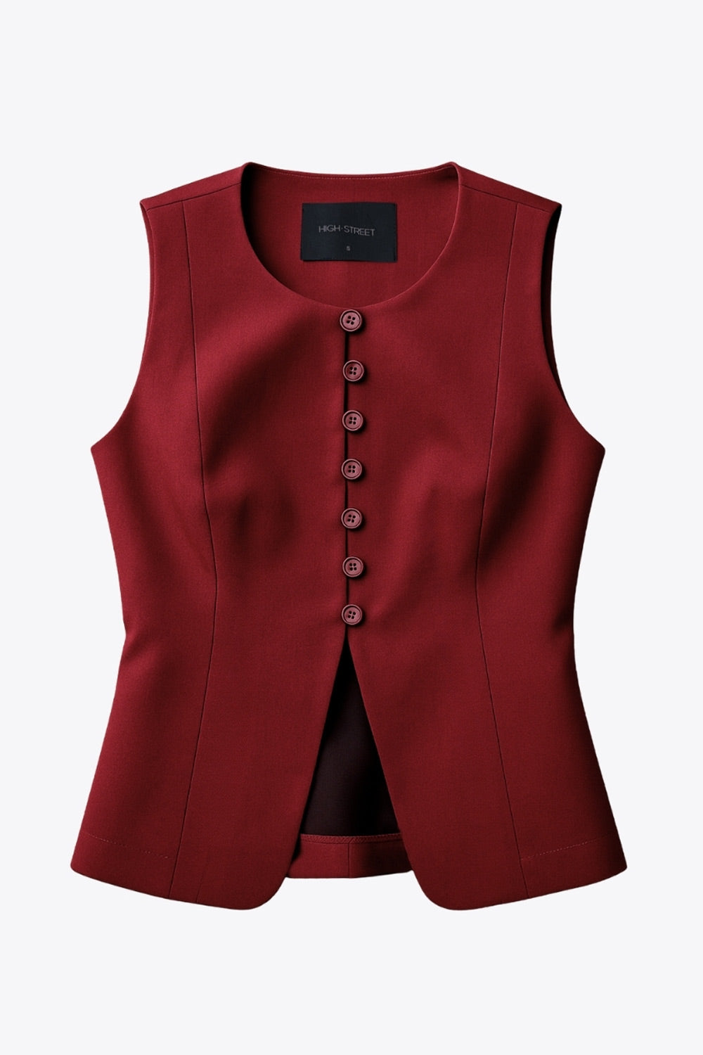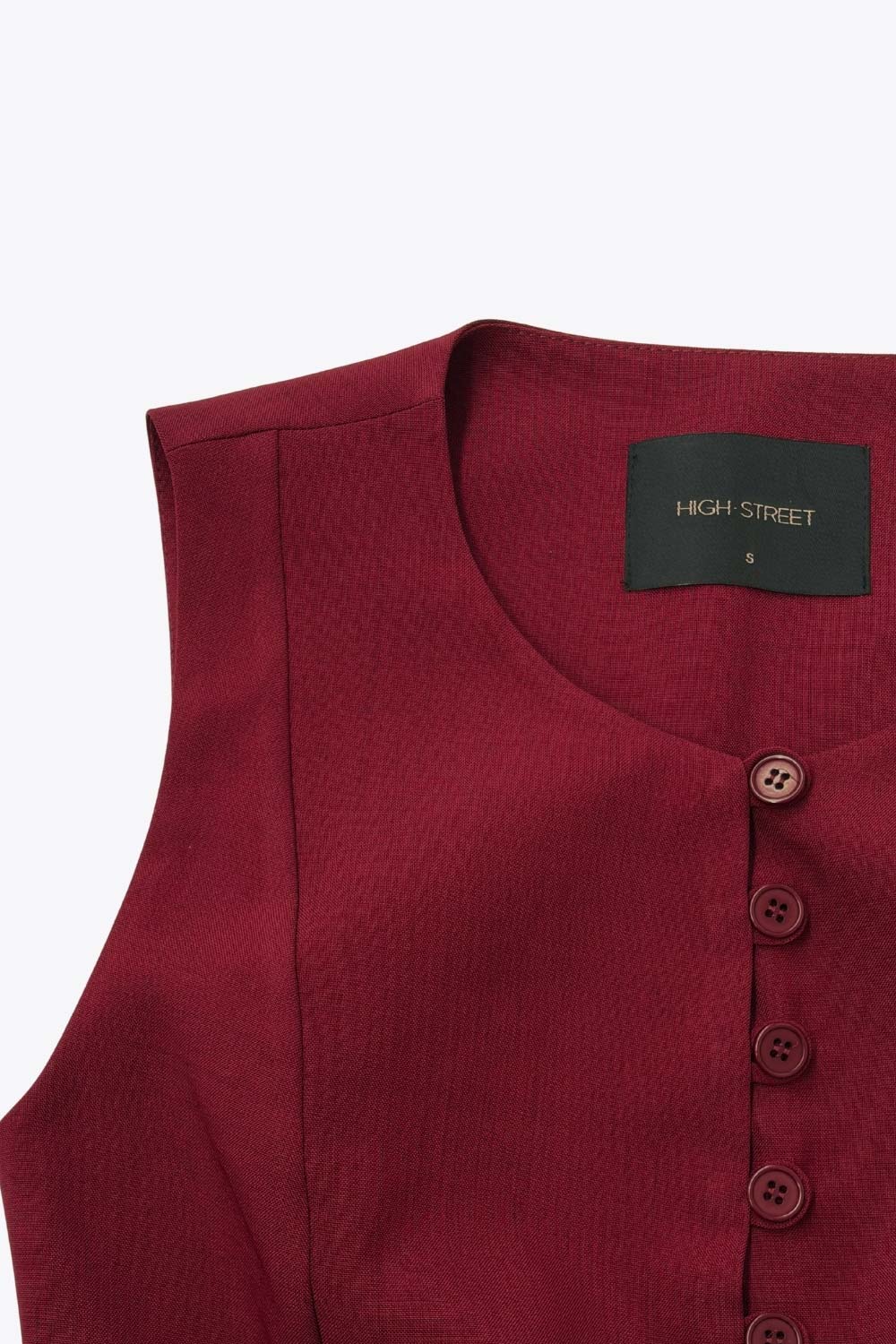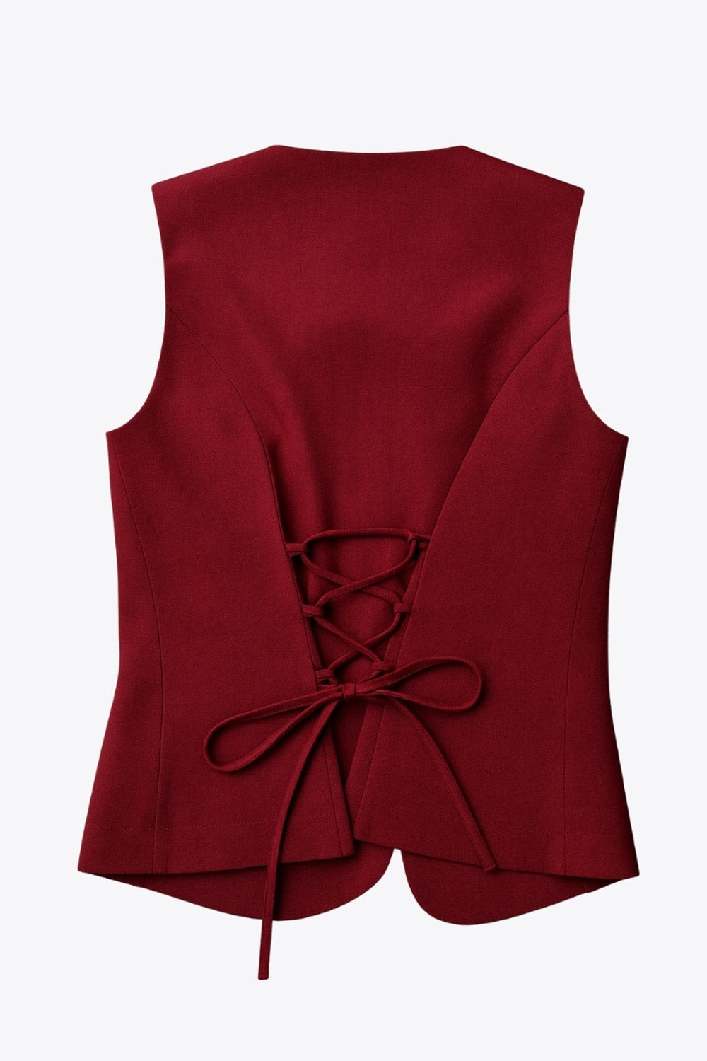 Chaleco ajustado de cuello redondo, pinzas frontales, fit recto, cierre frontal con hilera de botones en contraste, abertura frontal en bajo y lazado ajustable posterior.