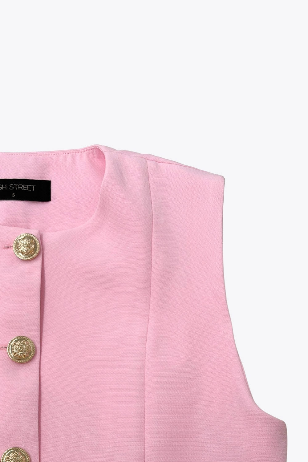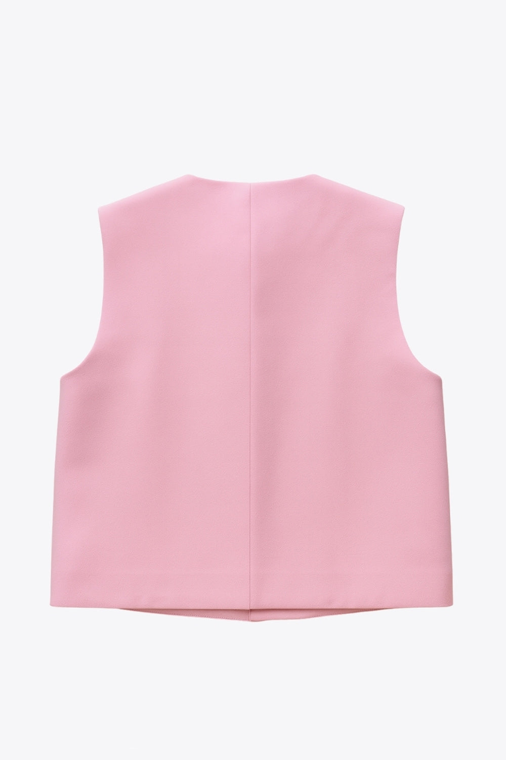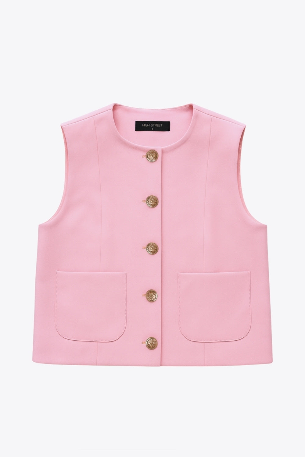 Chaleco corto de fit recto, cuello redondo, pinzas frontales, bolsillos delanteros de parche y cierre frontal con hilera de botones en contraste.