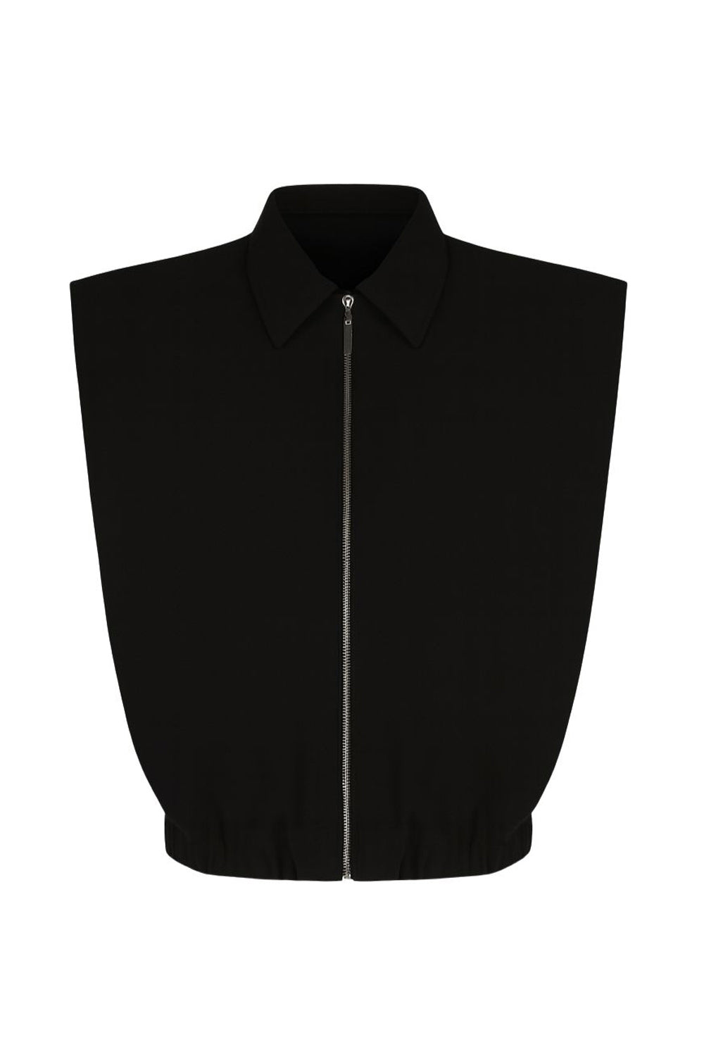 Chaleco corto de fit abullonado, con hombreras, cuello sport y cierre frontal con cremallera visible en contraste.
