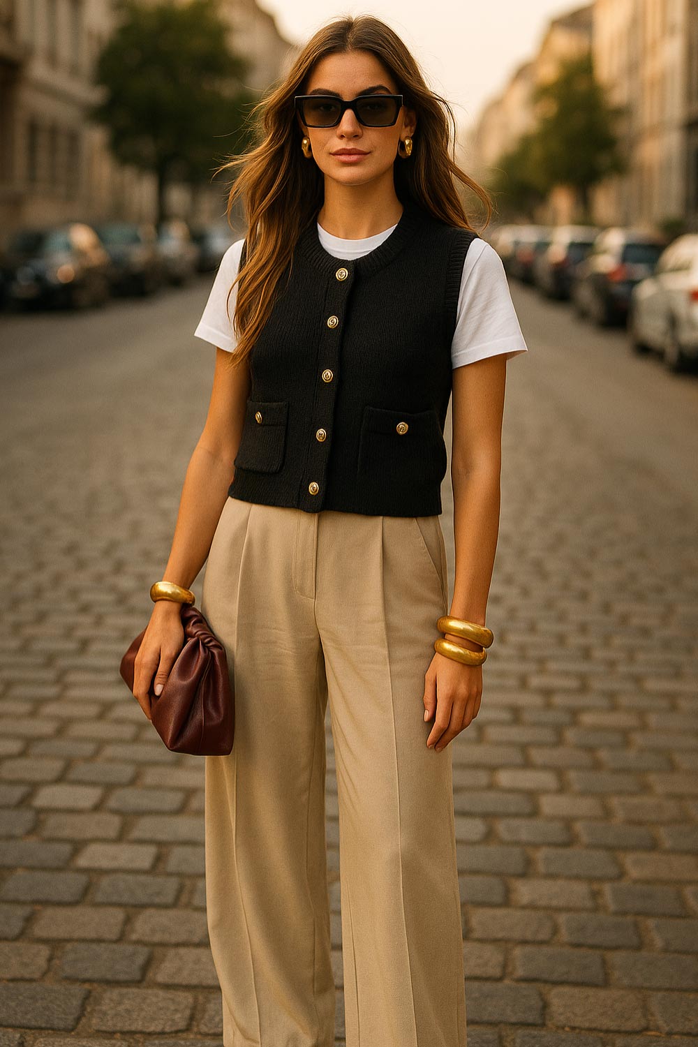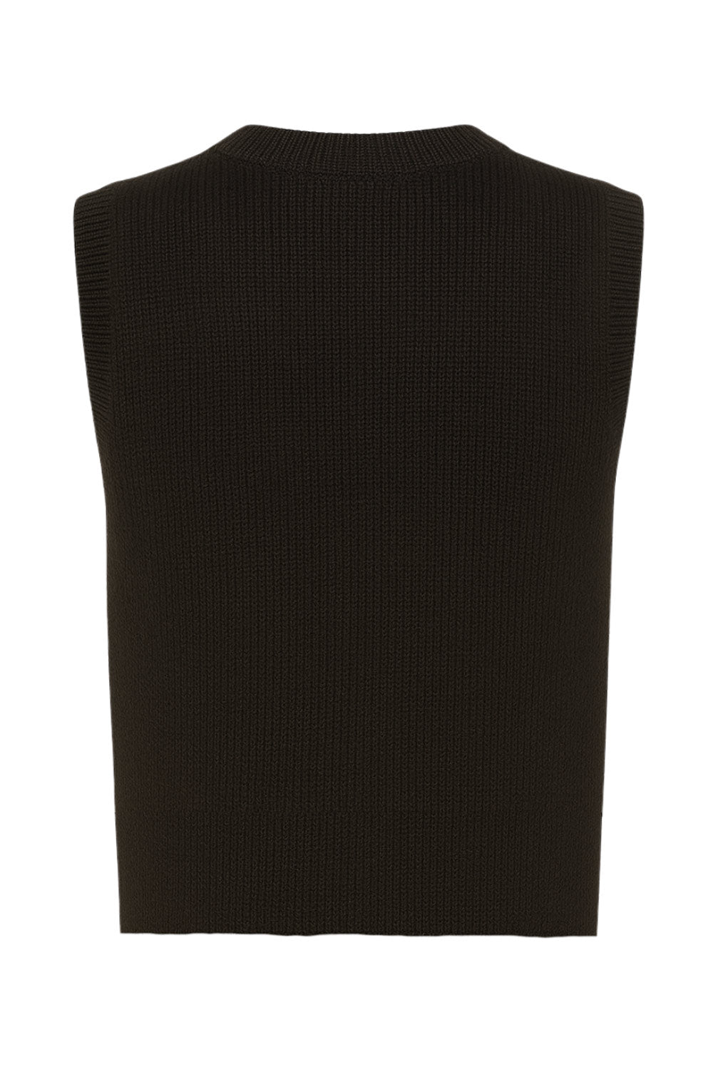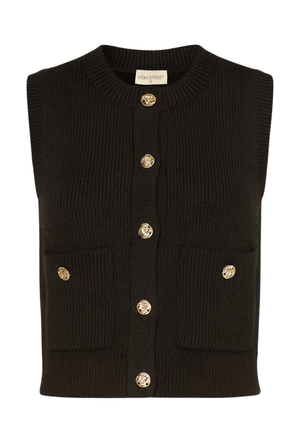 Chaleco corto de punto, fit recto, bolsillos frontales con botón, rib en puños, bajo y cuello redondo. Cierre frontal con hilera de botones en contraste.