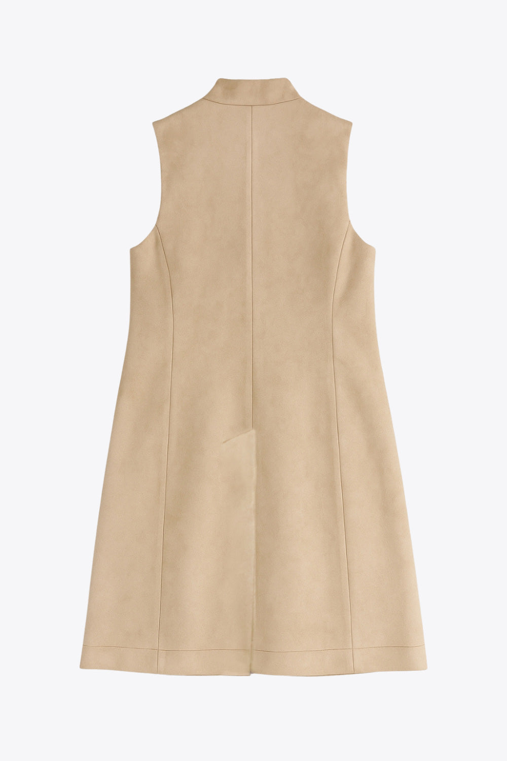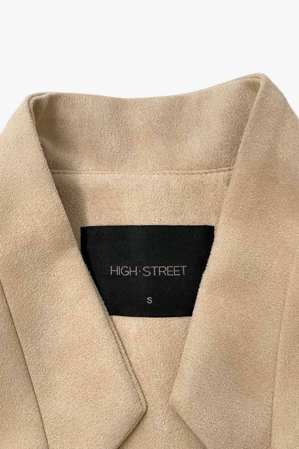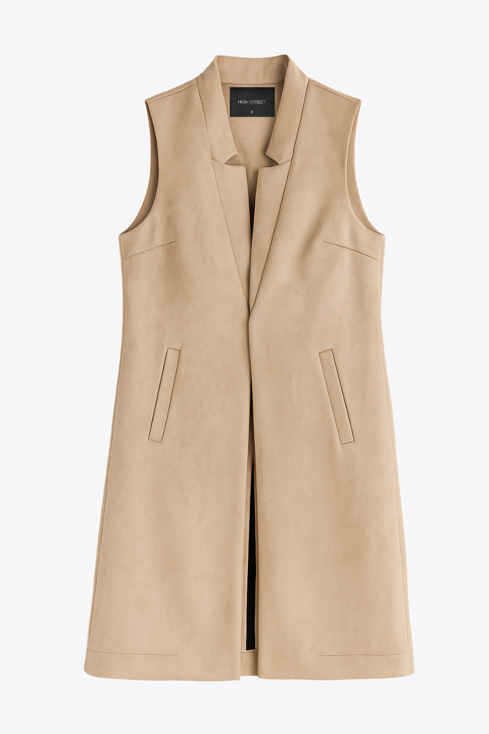 Chaleco largo abierto de fit recto, con solapa y bolsillos delanteros con vivos. Detalle de abertura posterior en bajo.