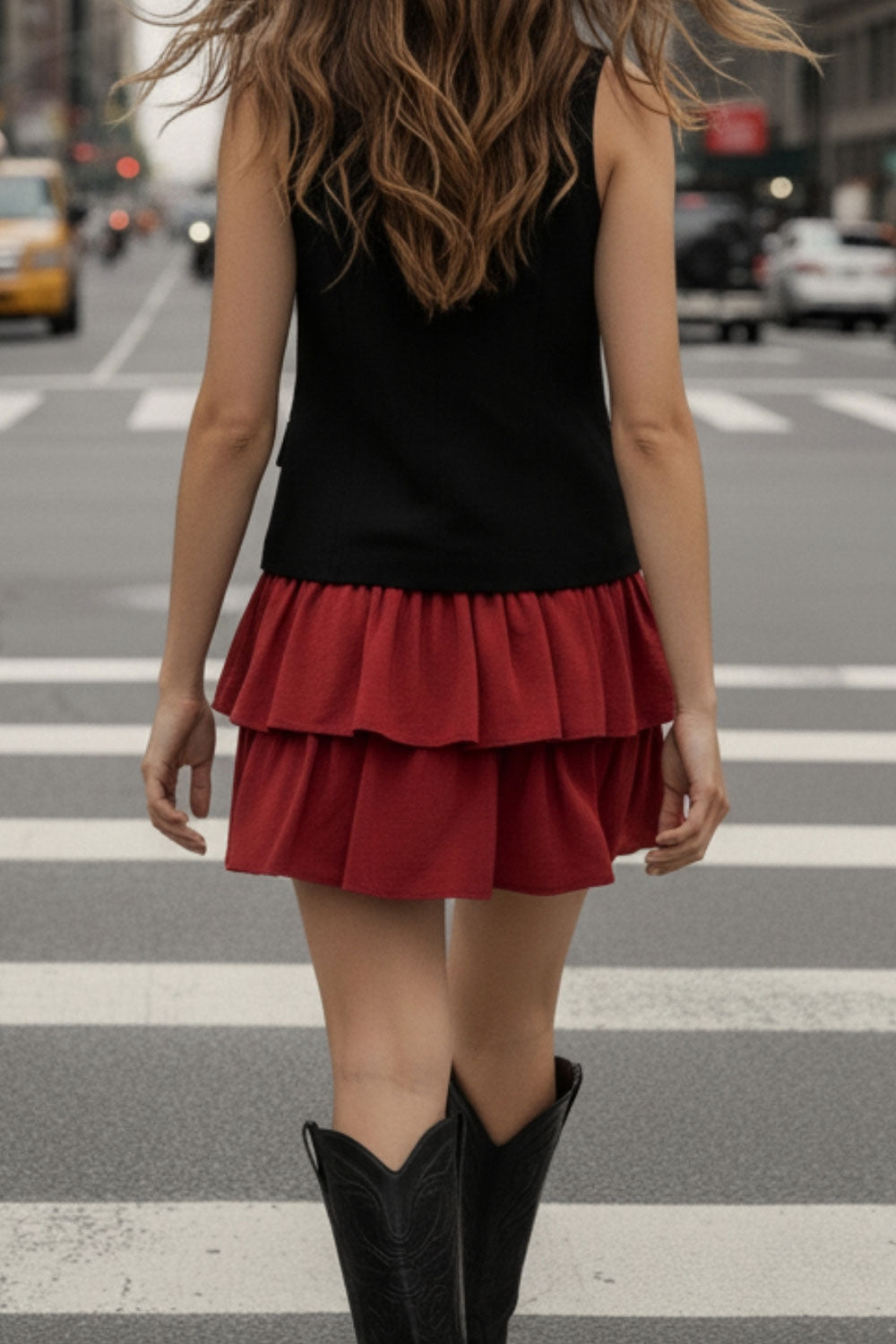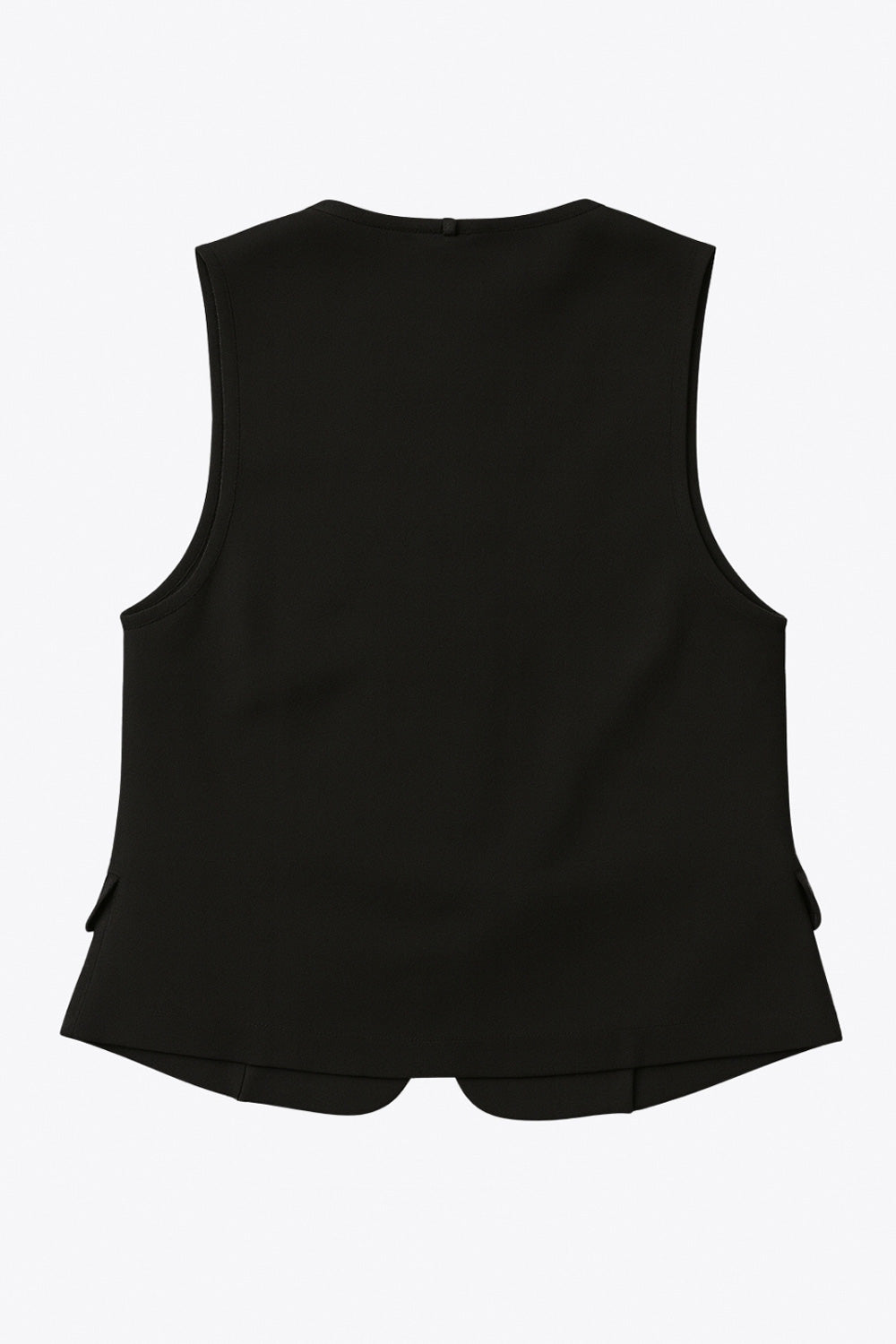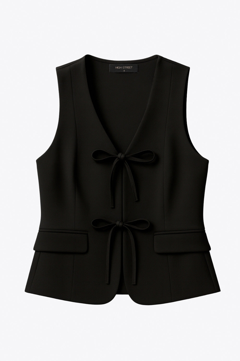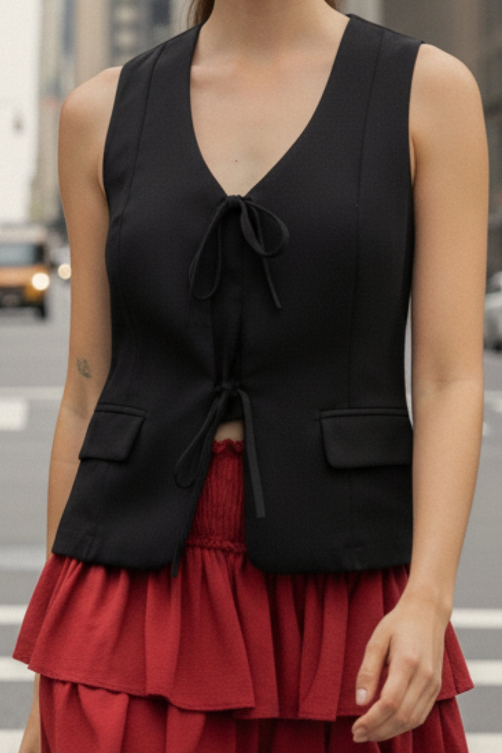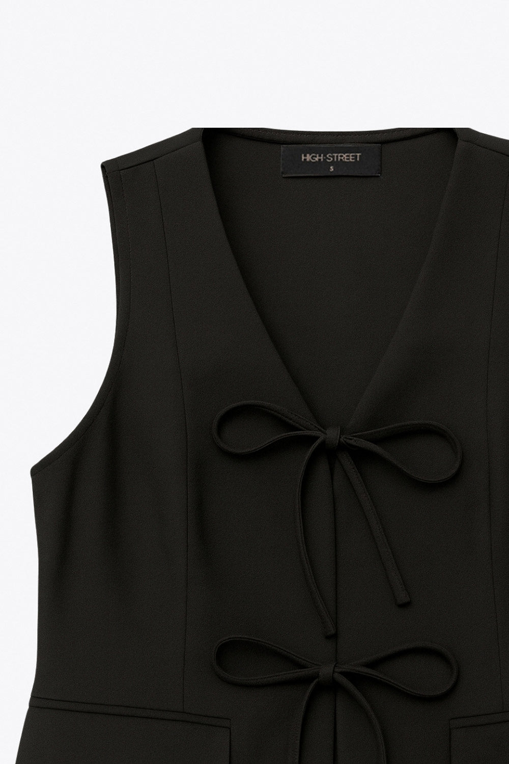 Chaleco de fit recto, escote v redondeado, pinzas frontales, bolsillos delanteros con cartera y cierre frontal con lazado amarrable.