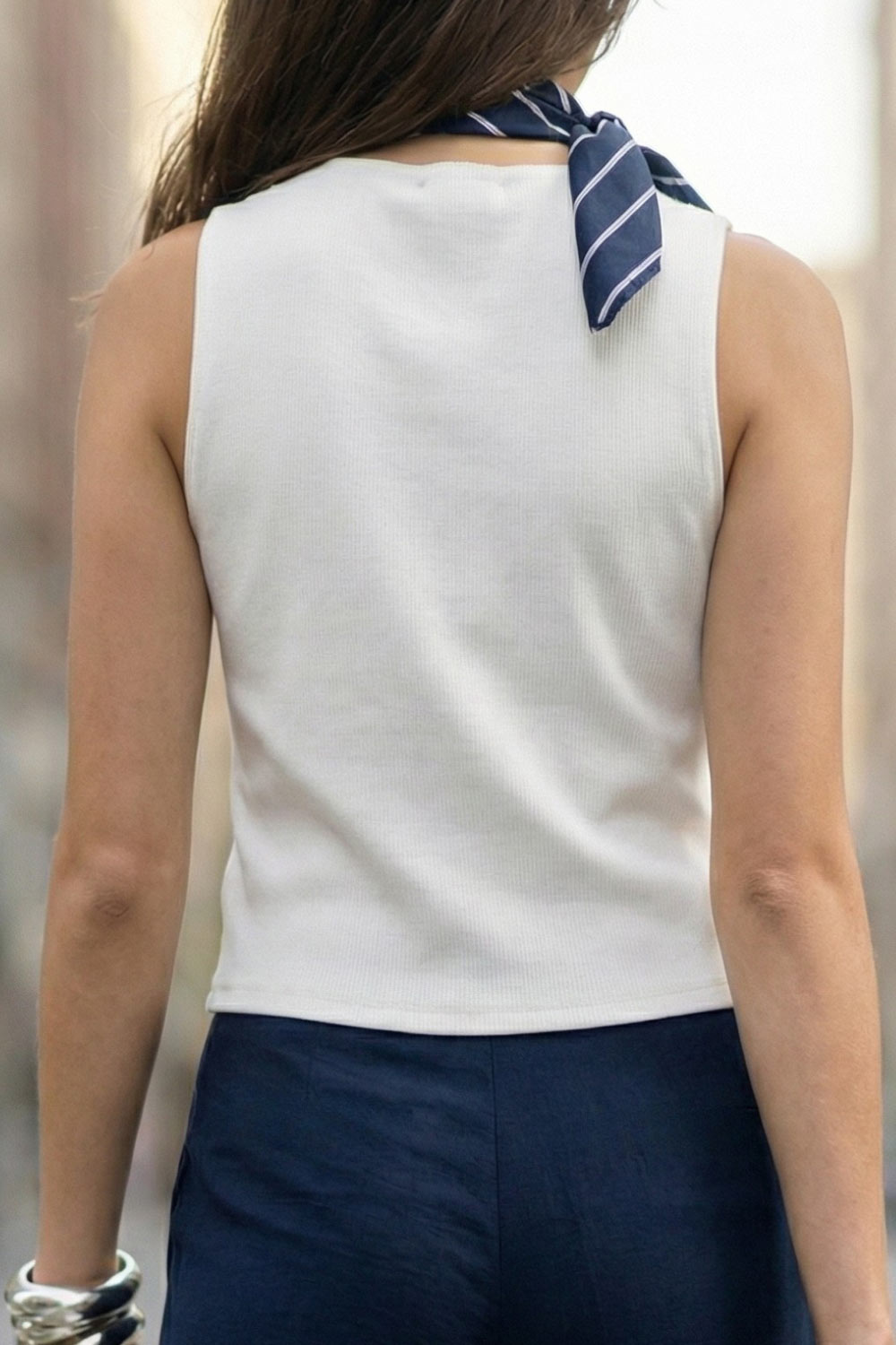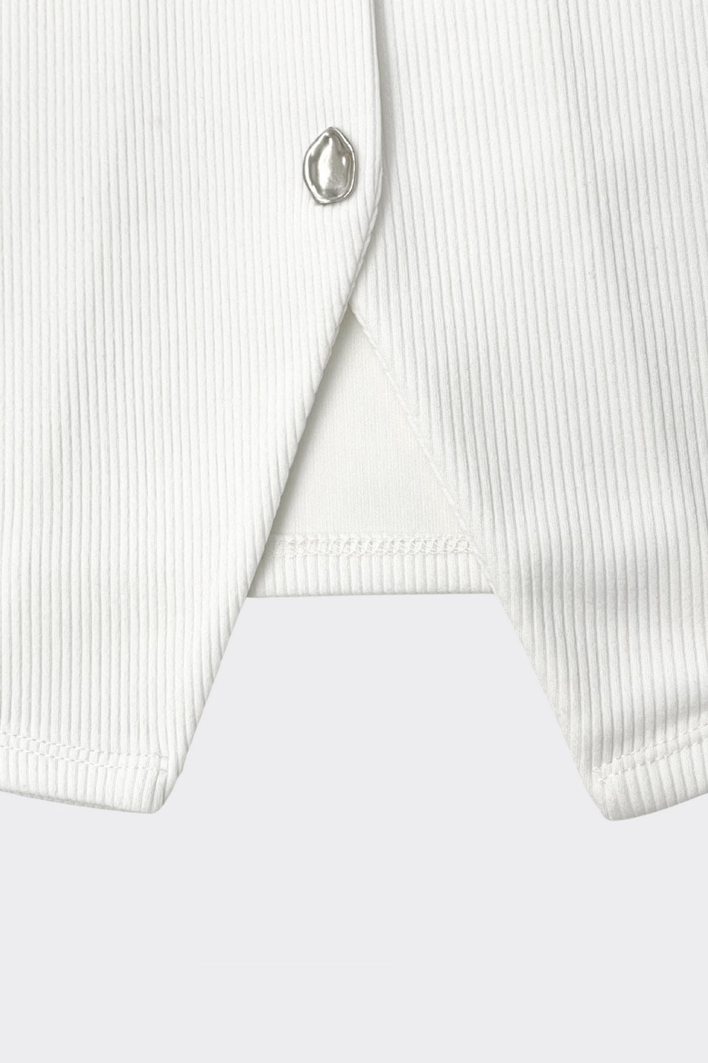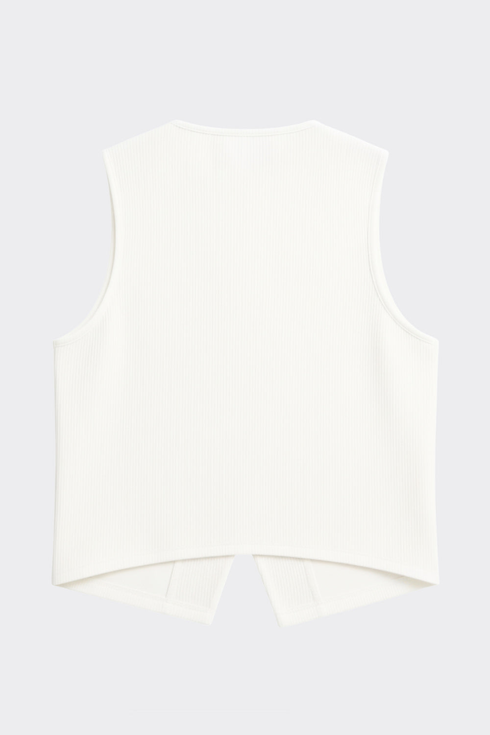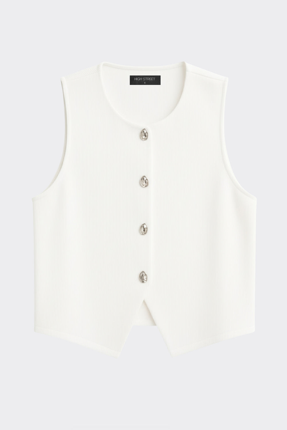 Chaleco canalé de punto, fit ajustado, escote redondo y cierre frontal con hilera de botones en contraste. Detalle de bajo v frontal.