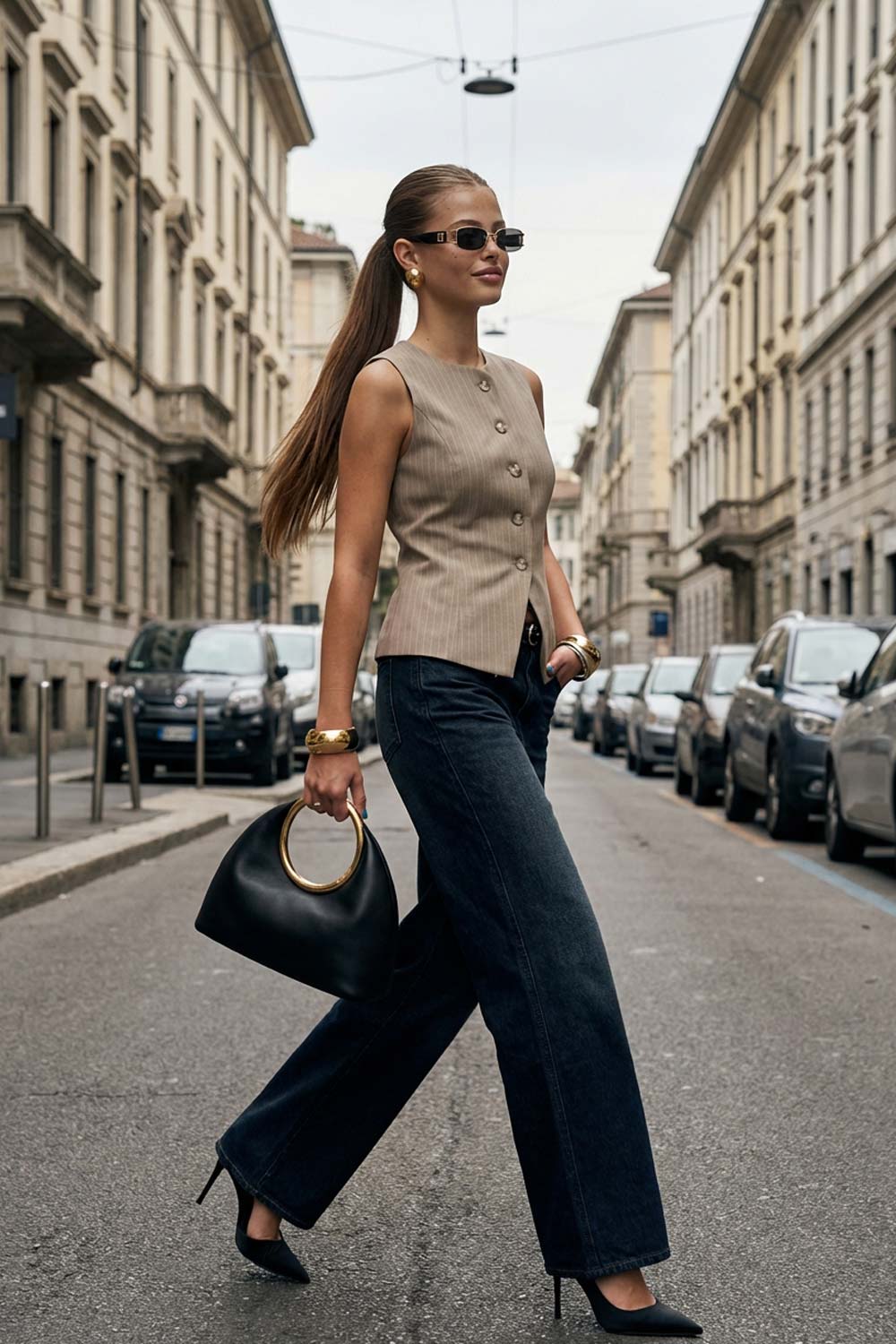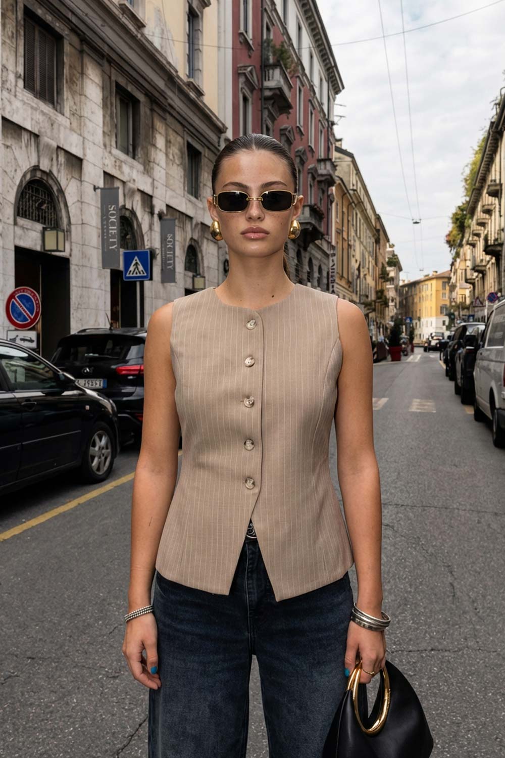 Chaleco corto de fit ajustado, estampado rayas, pinzas frontales, cuello redondo y abertura v en bajo. Cierre frontal con hilera de botones en contraste.