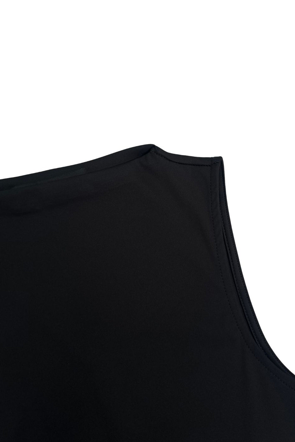Top asimétrico de fit recto, cuello barco, sin mangas, bajo asimétrico diagonal con abertura lateral y lazo amarrable decorativo.