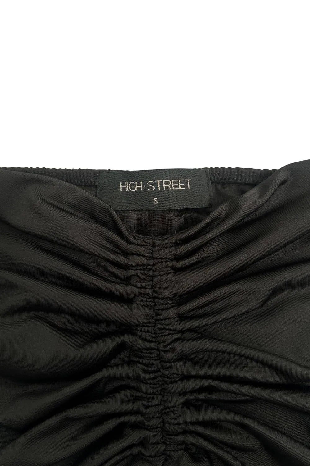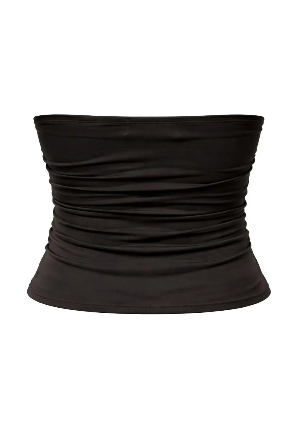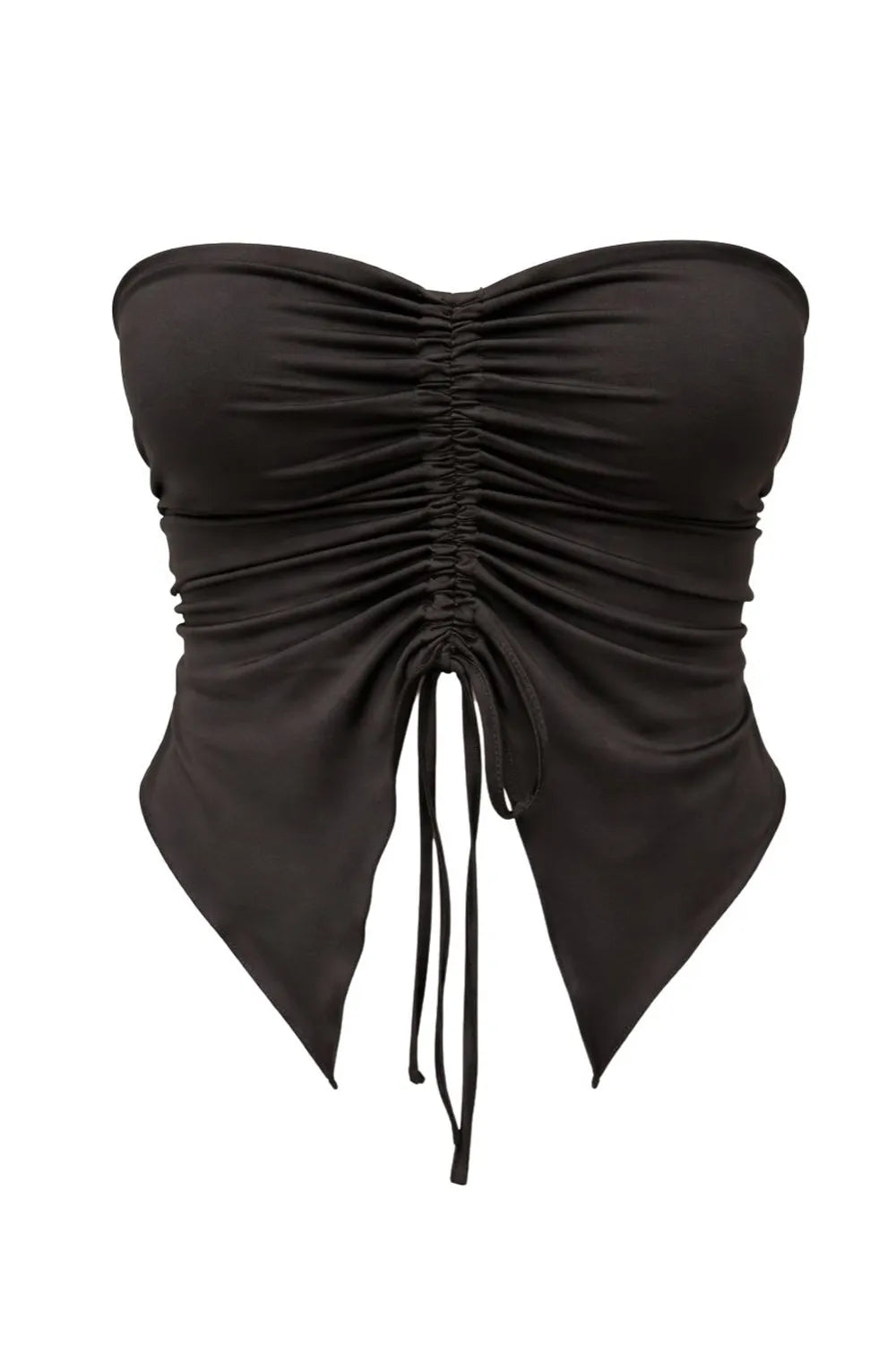 Top corto strapless de escote corazón con jareta frontal ajustable, plisados y abertura frontal con bajo asimétrico. Rib rizado en borde de bajo.