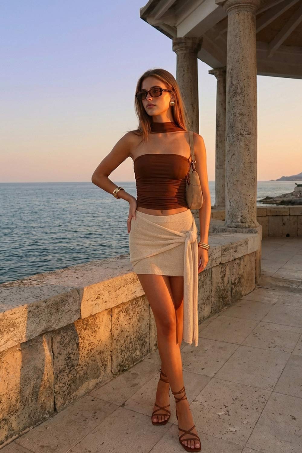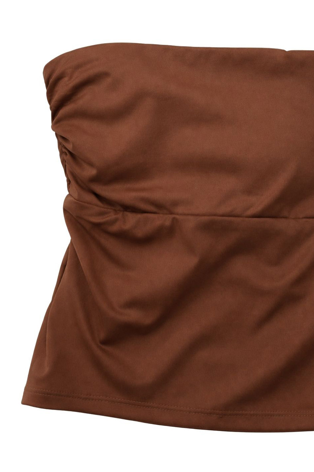 Top tubo de fit ajustado, escote recto, plisados en costados y detalle decorativo posterior de choker.
