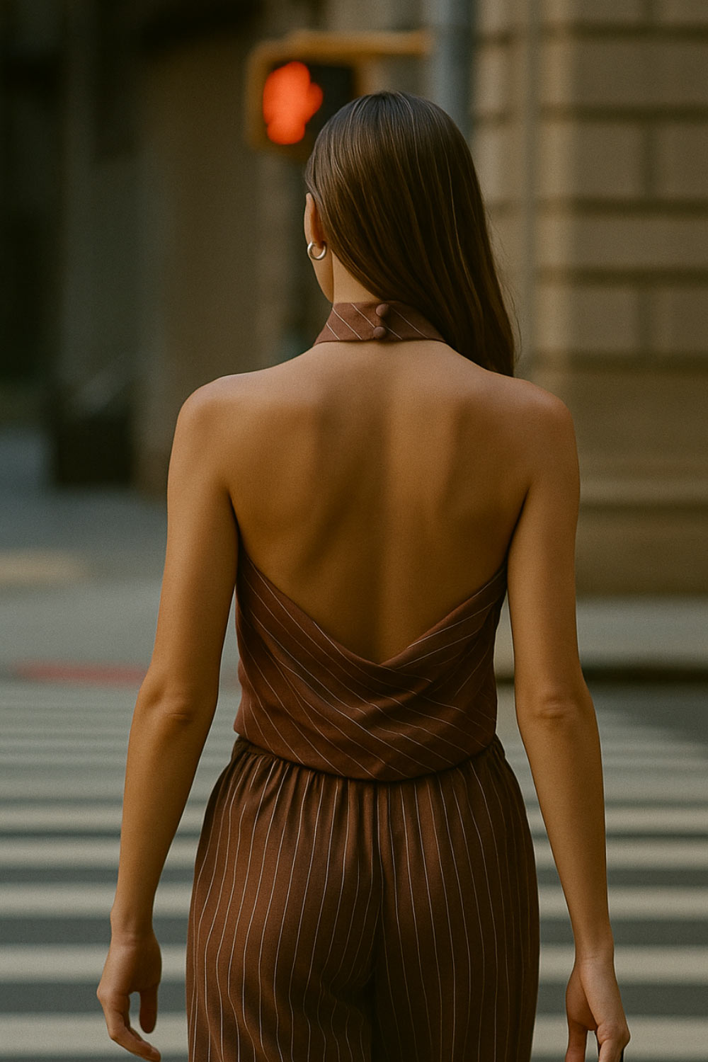 Blusa corta de lino, fit recto, estampado rayas, halter con cuello fluido, sin mangas, escote en espalda, cierre posterior con botón y ojal.