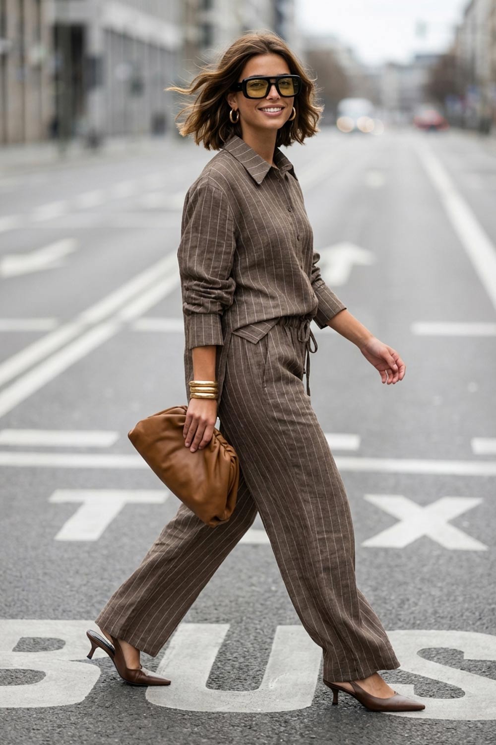 Camisa de rayas, ligeramente oversized, cuello camisero, manga larga con puño abotonado. Cierre frontal con hilera de botones.