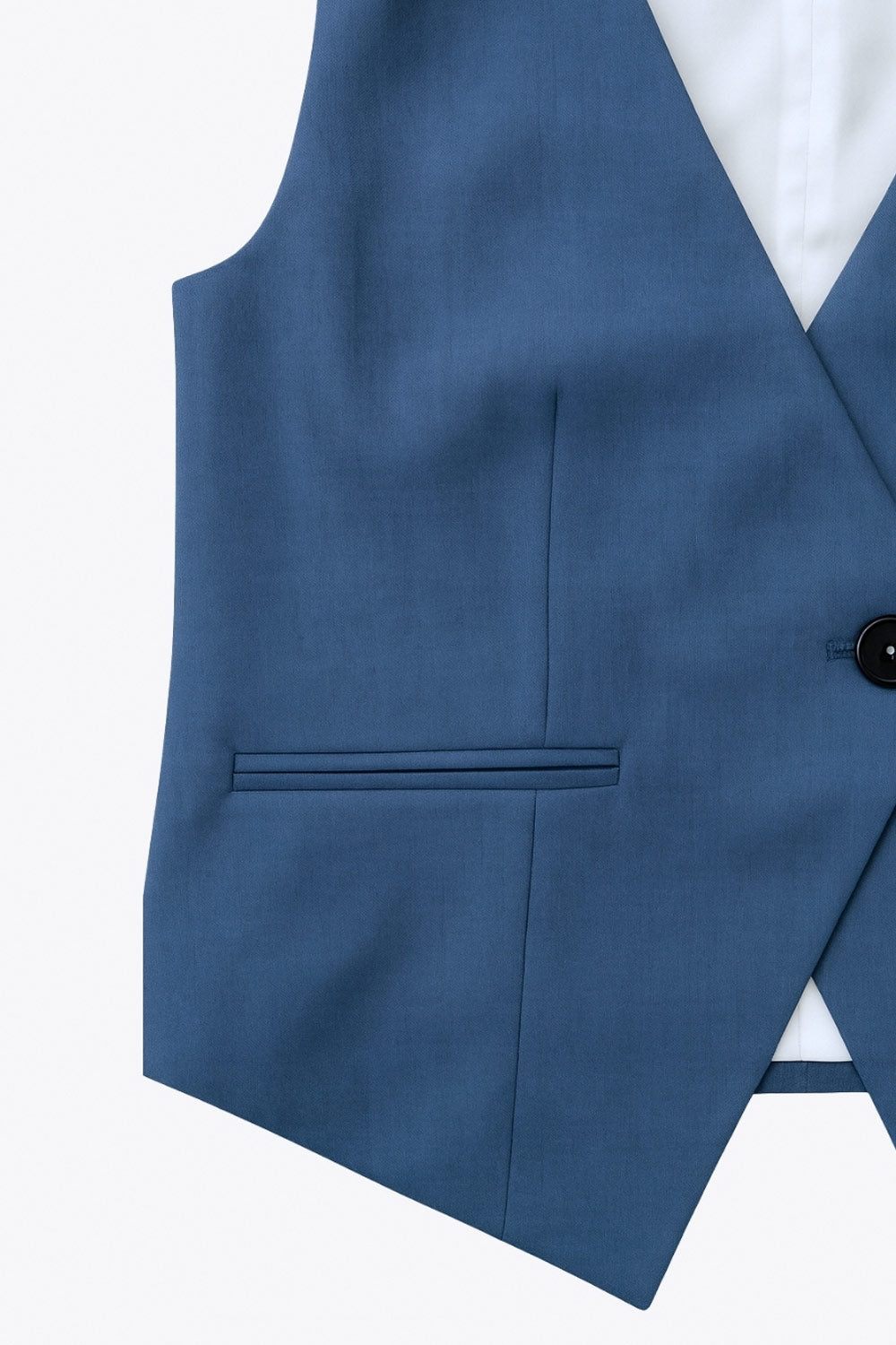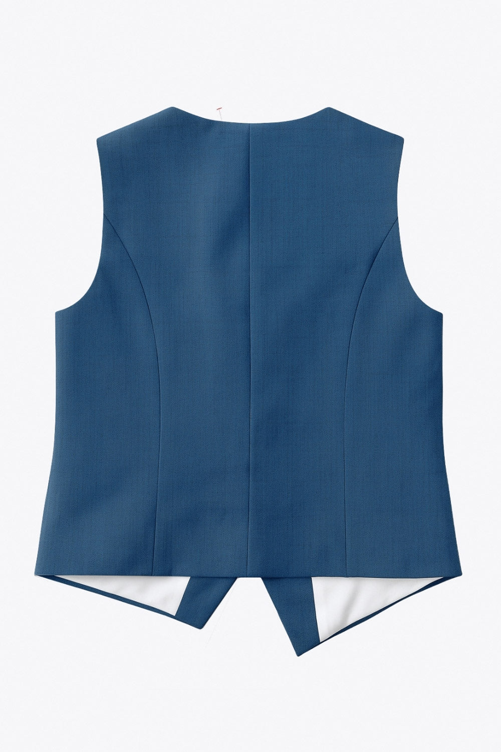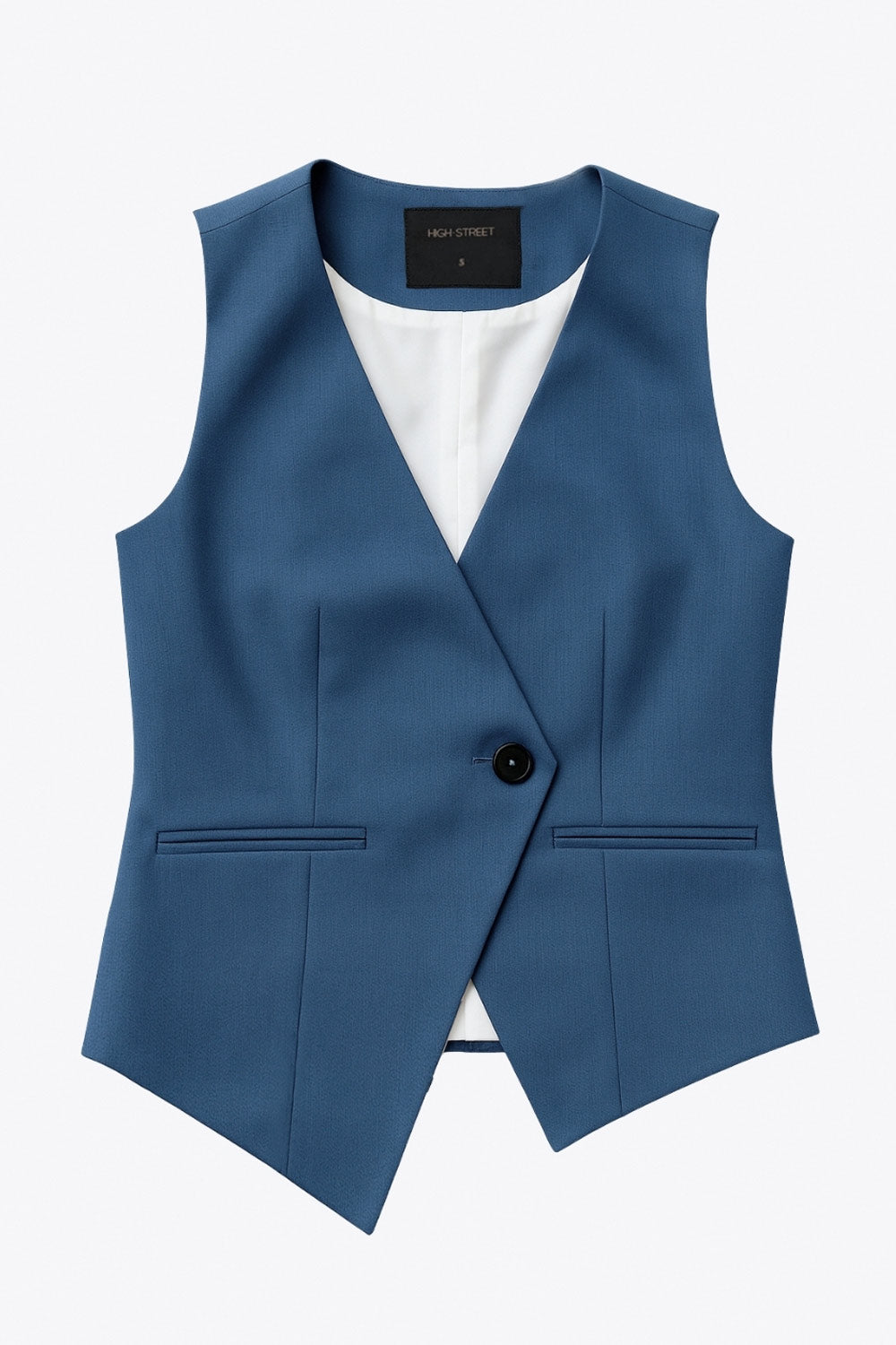 Chaleco asimétrico de fit ajustado, escote v, vivos decorativos frontales y cierre frontal con botón en contraste y bajo asimétrico.