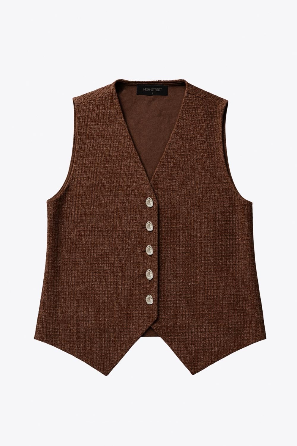 Chaleco de bouclé, fit recto, escote v, cierre con hilera de botones en contraste y abertura frontal v en bajo.