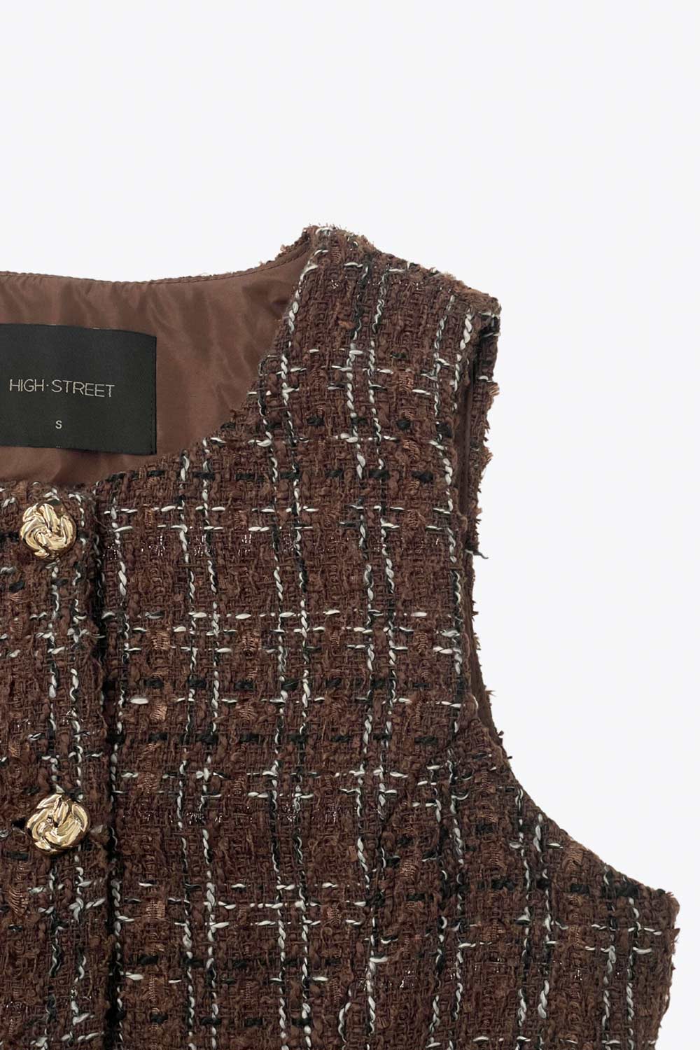 Chaleco de bouclé fit ajustado, cuello redondo, vivos decorativos frontales, cierre con hilera de botones en contraste y abertura frontal en bajo.