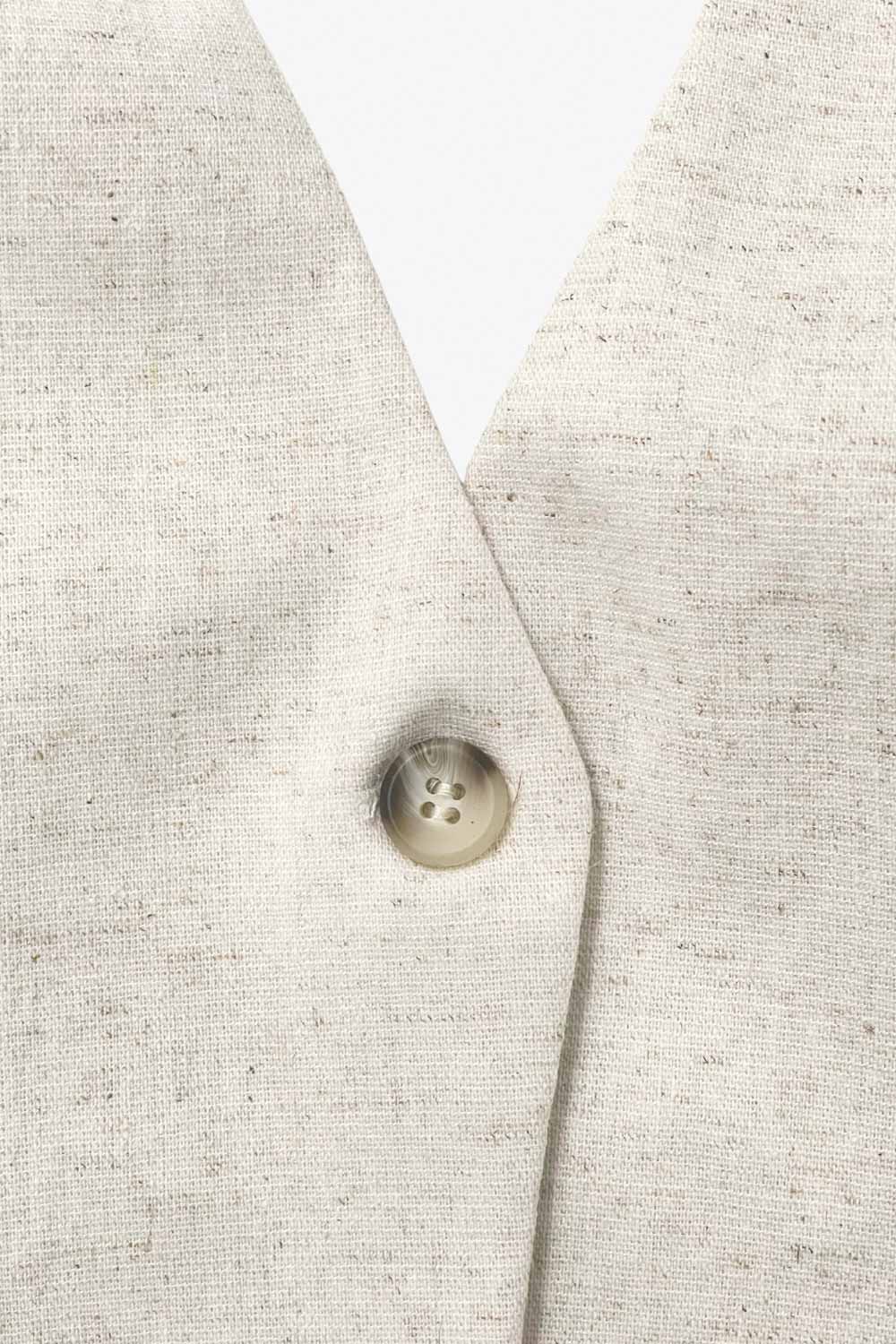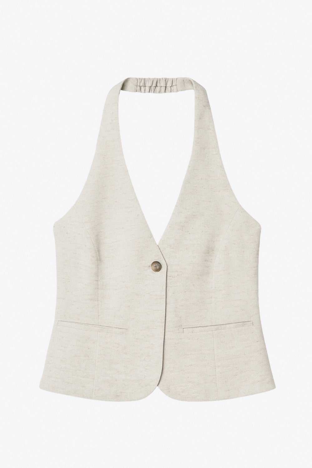 Chaleco corto de cuello halter con elástico posterior, fit ajustado, escote v, pinzas frontales, vivos decorativos frontales y bajo curveado. Cierre frontal con botón en contraste.