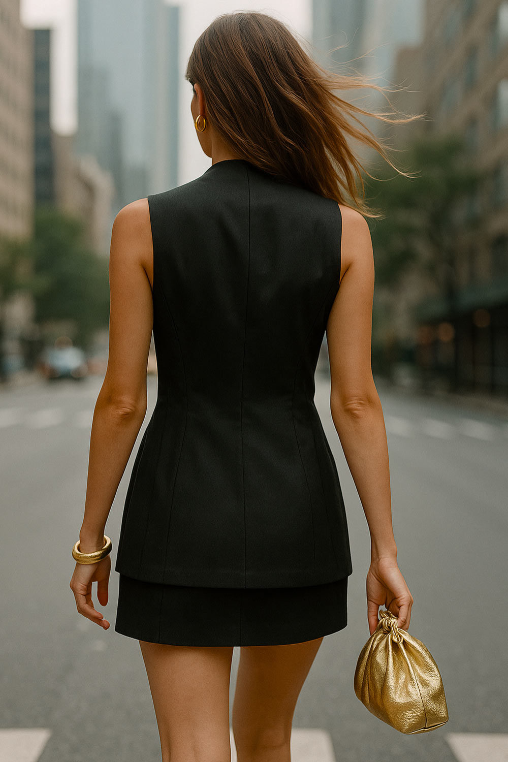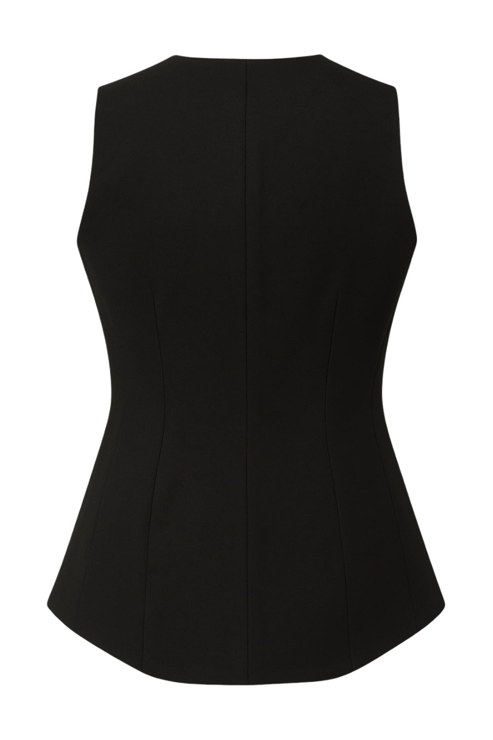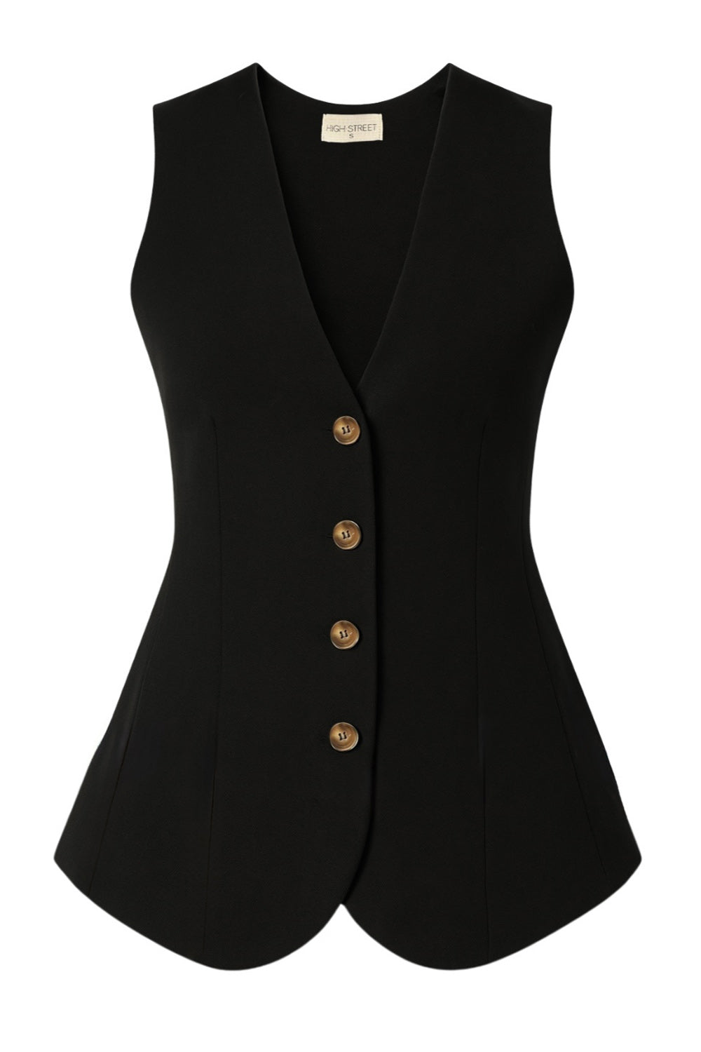 Chaleco de fit ajustado, cuello v, bajo curveado frontal, cortes frontales y cierre con hilera de botones en contraste.
