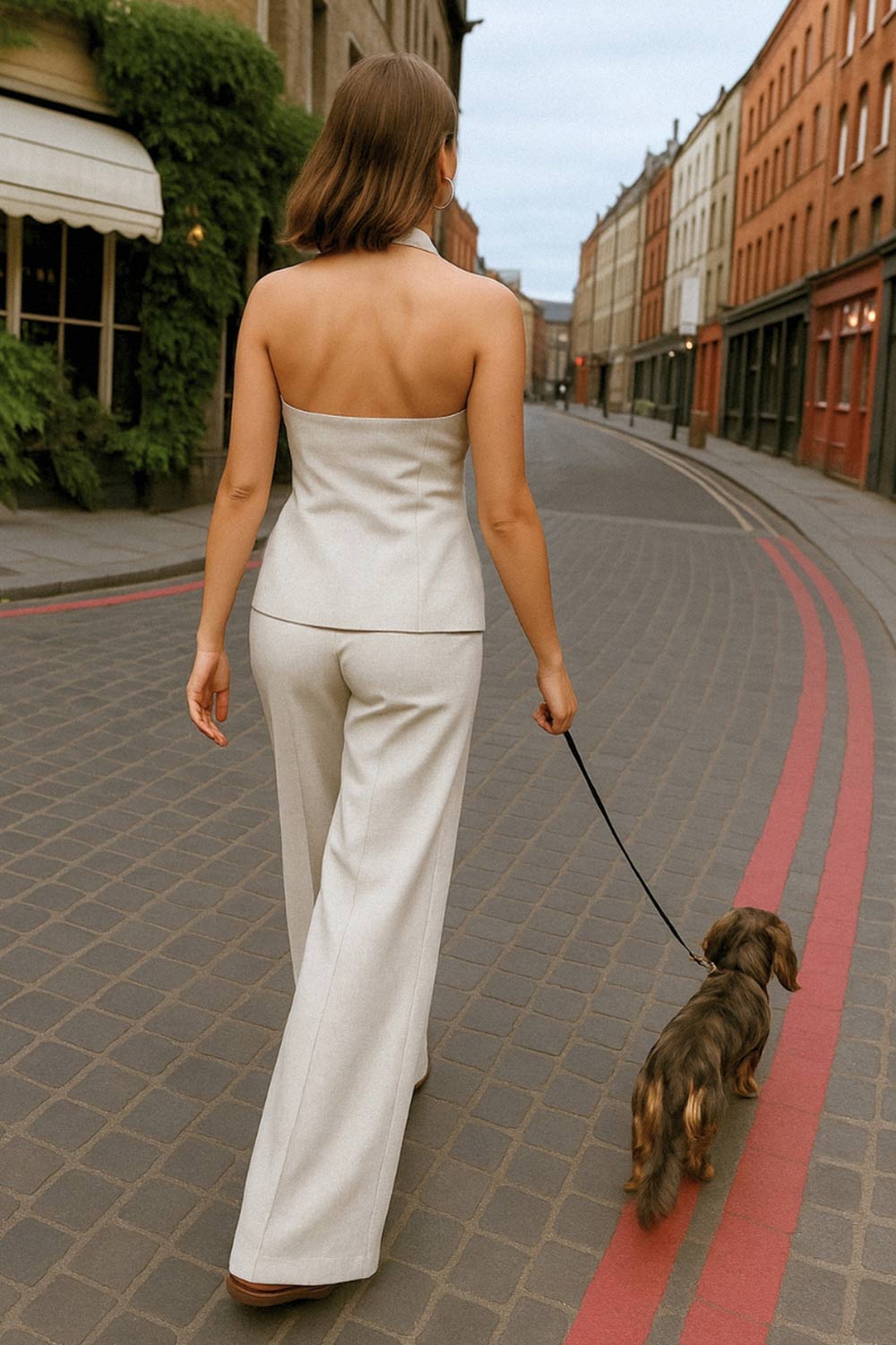Pantalón de lino, fit wide leg, cintura alta con pretina y trabillas, pinzas frontales, bolsillos delanteros, detalle de raya frontal y posterior . Cierre frontal con botón y cremallera oculta.