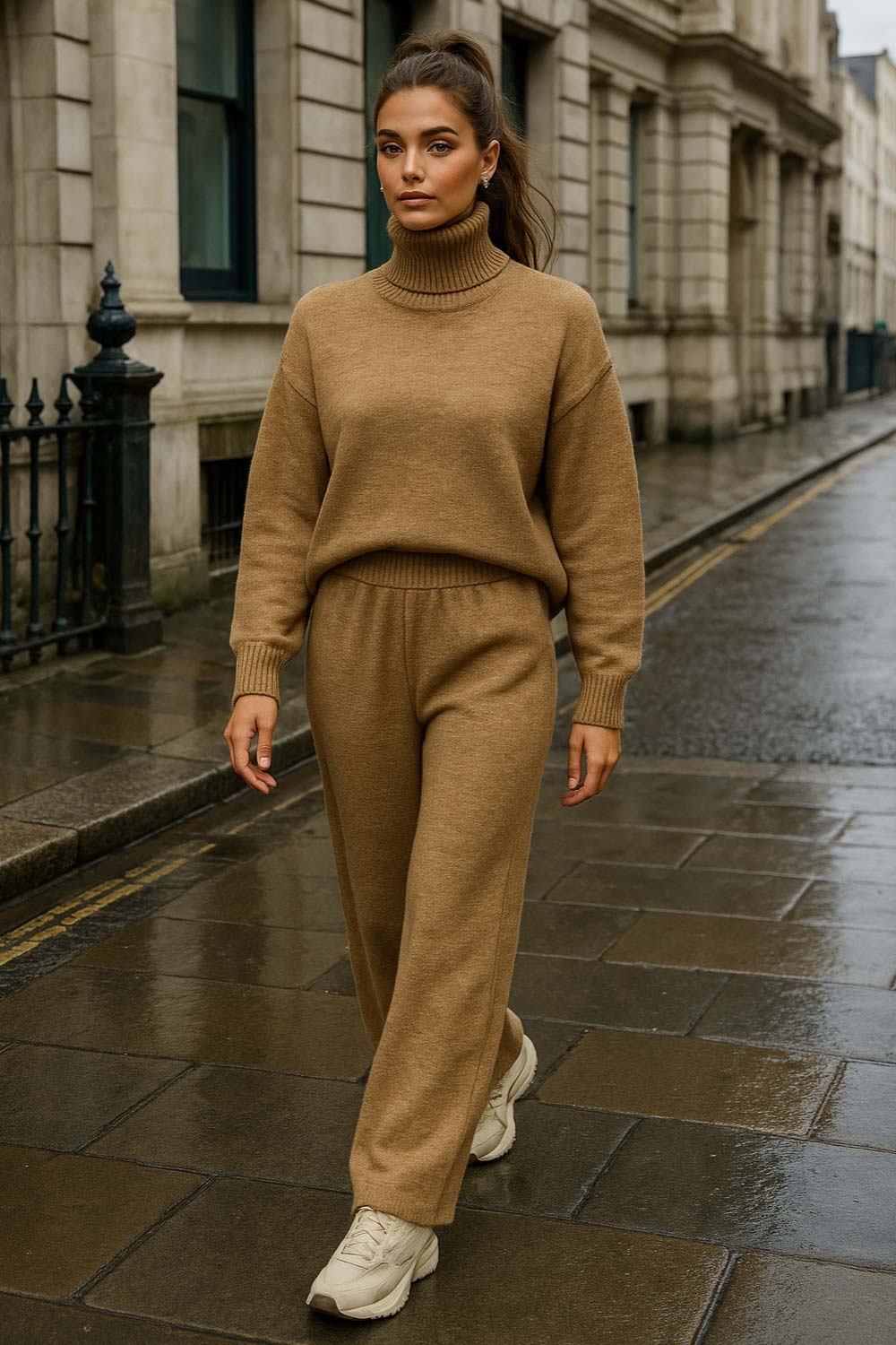Pantalón de punto fit recto, cintura media con pretina elástica y rib en bajo.