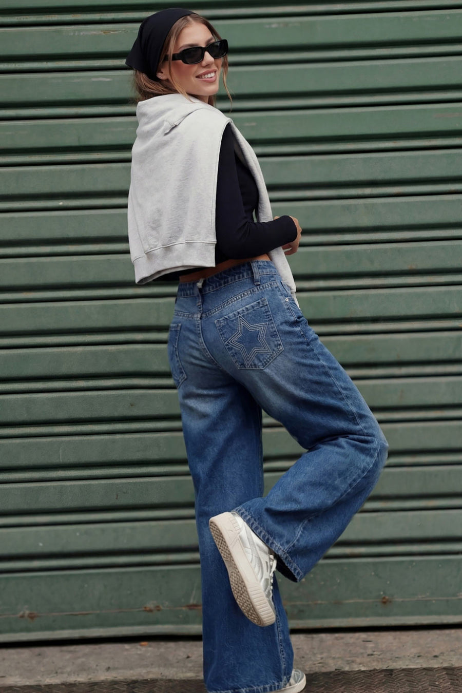 Pantalón wide leg de denim, cintura media con pretina y trabillas, bolsillos delanteros y traseros de parche con bordado de estrella. Cierre frontal con botón y cremallera oculta.