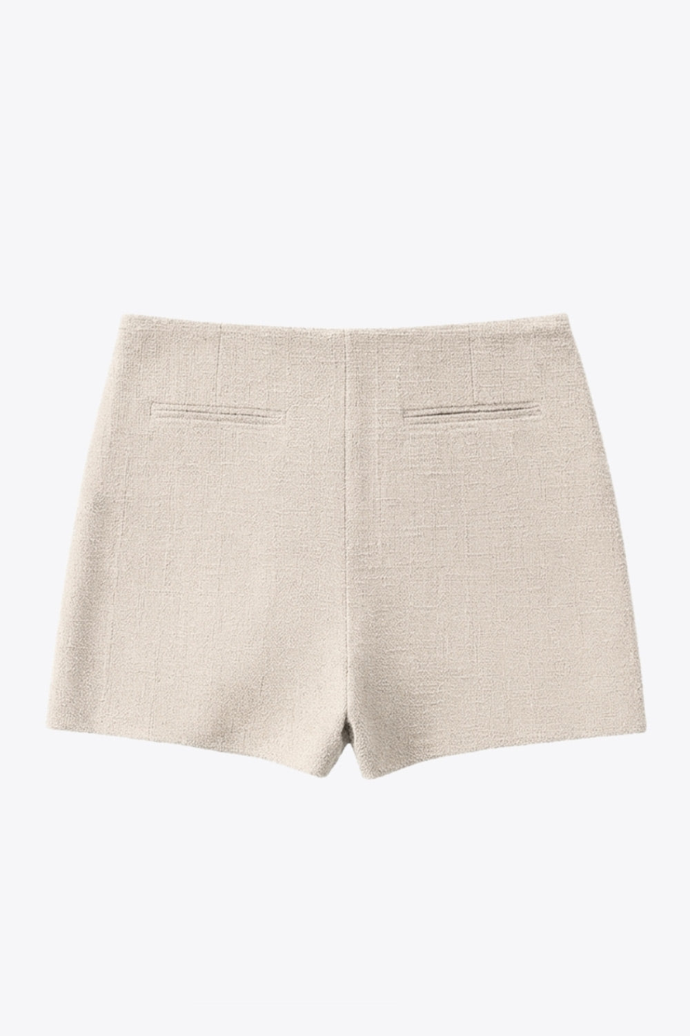 Falda short corto de bouclé, fit ajustado, cintura alta, vivos decorativos posteriores y cierre lateral con cremallera oculta.