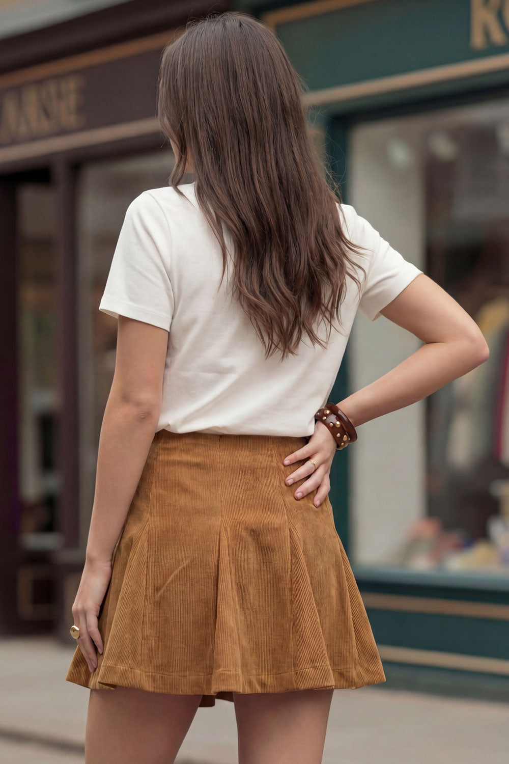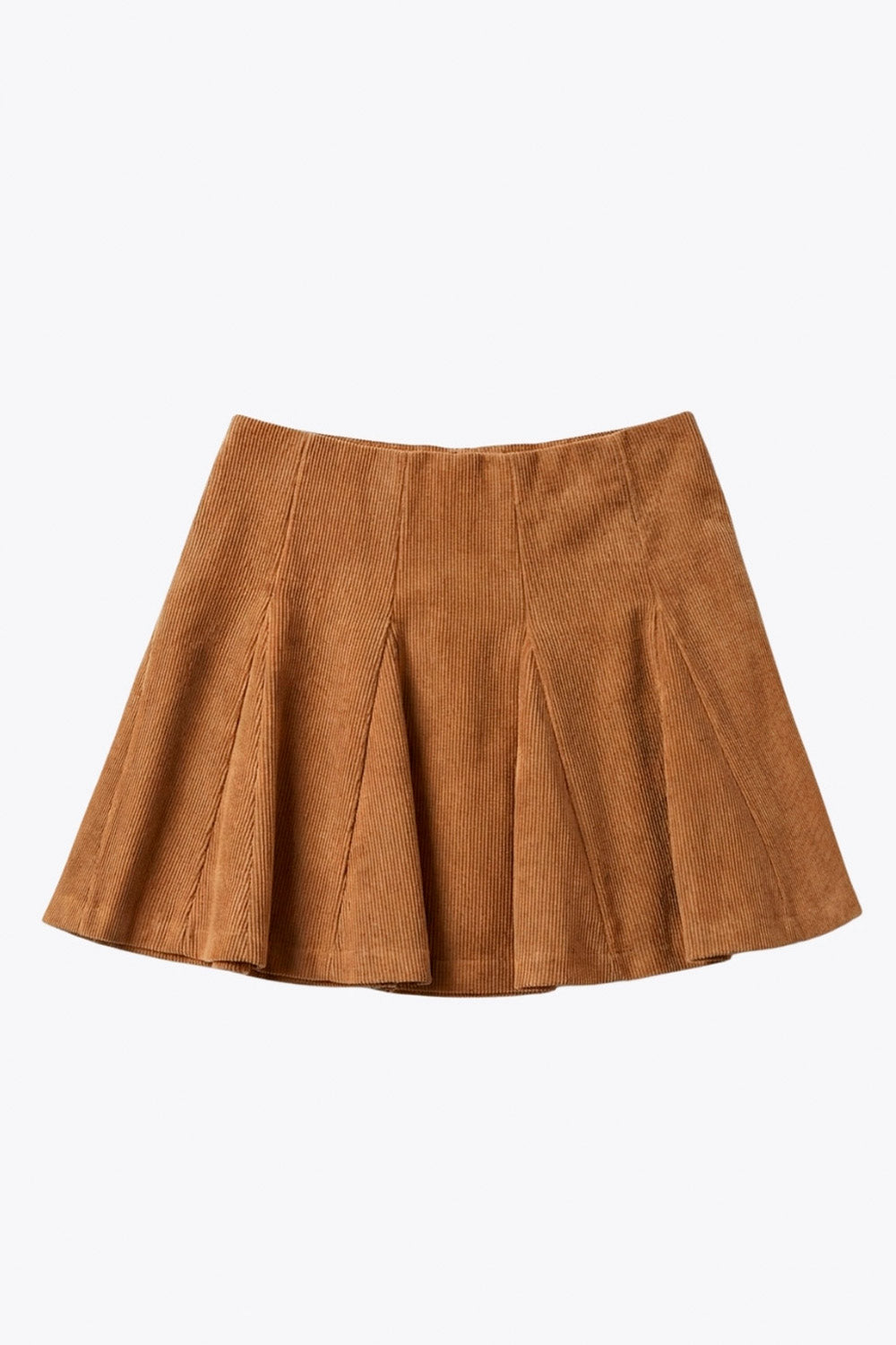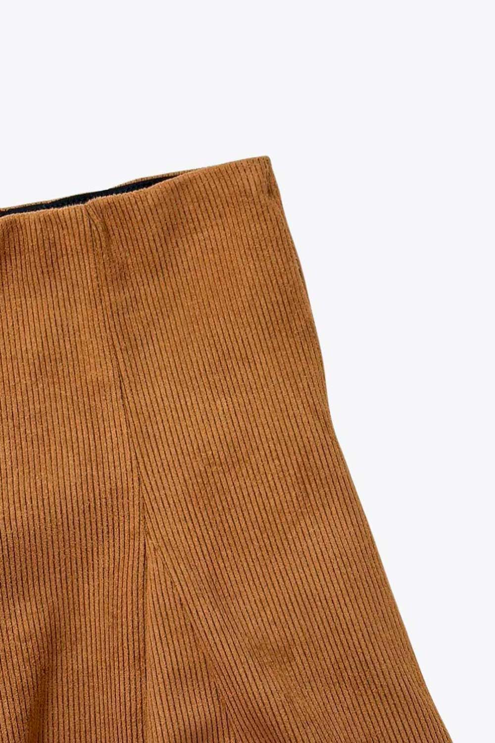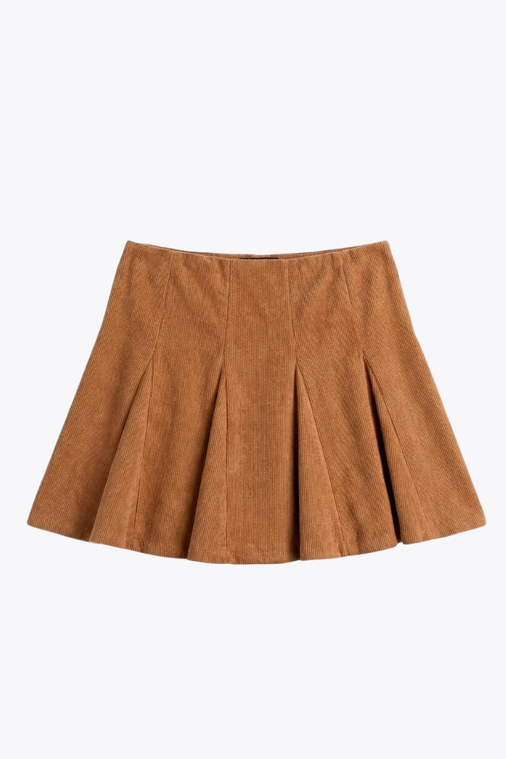 Falda short corto de pana, cintura alta elástica, corte en a con tableado en bajo.