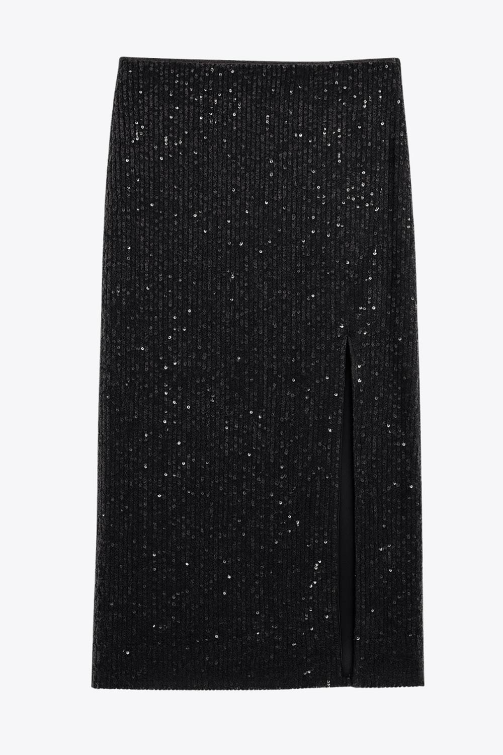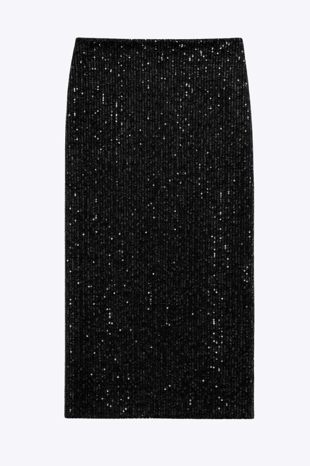 Falda midi de lentejuelas, fit ajustado y cintura alta elástica. Detalle frontal de abertura en bajo.