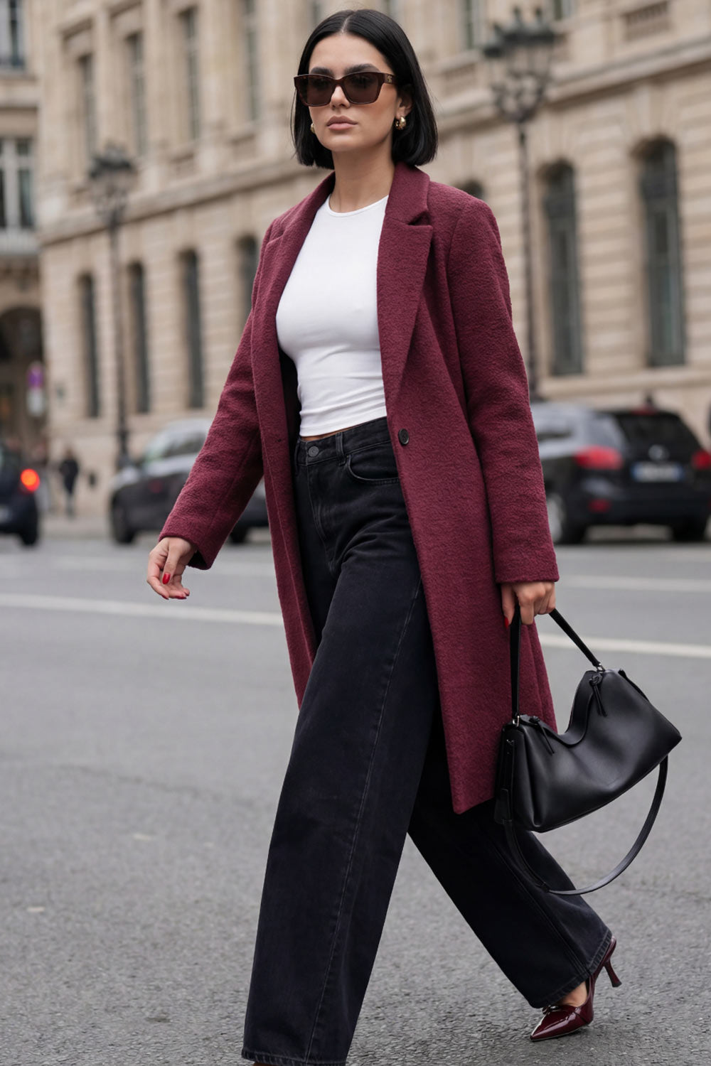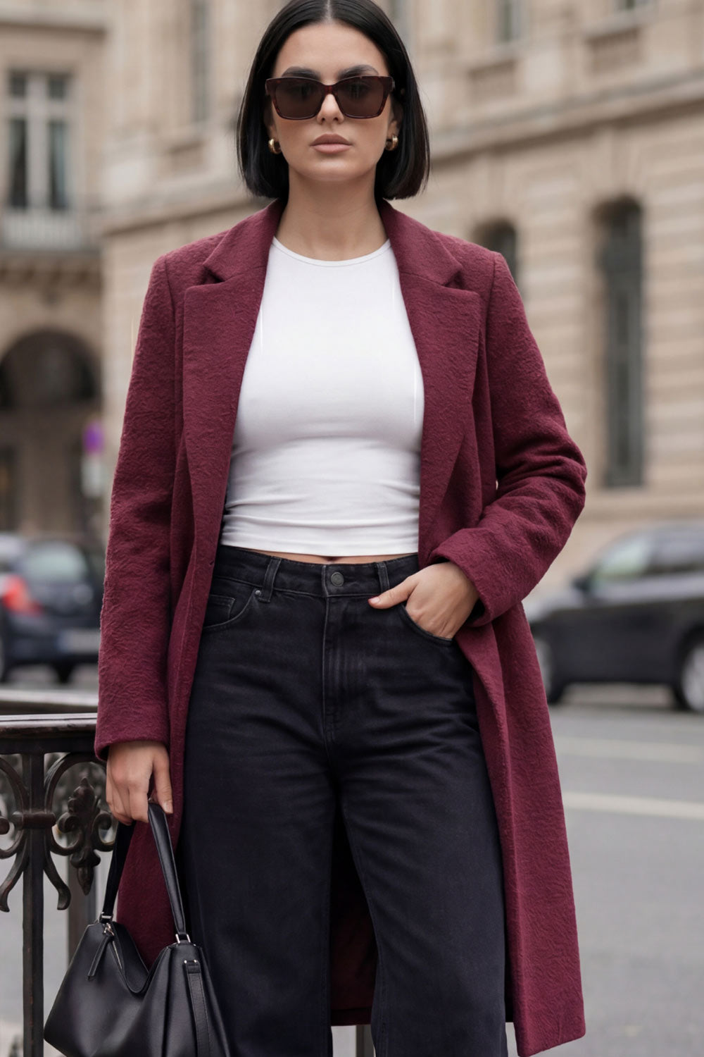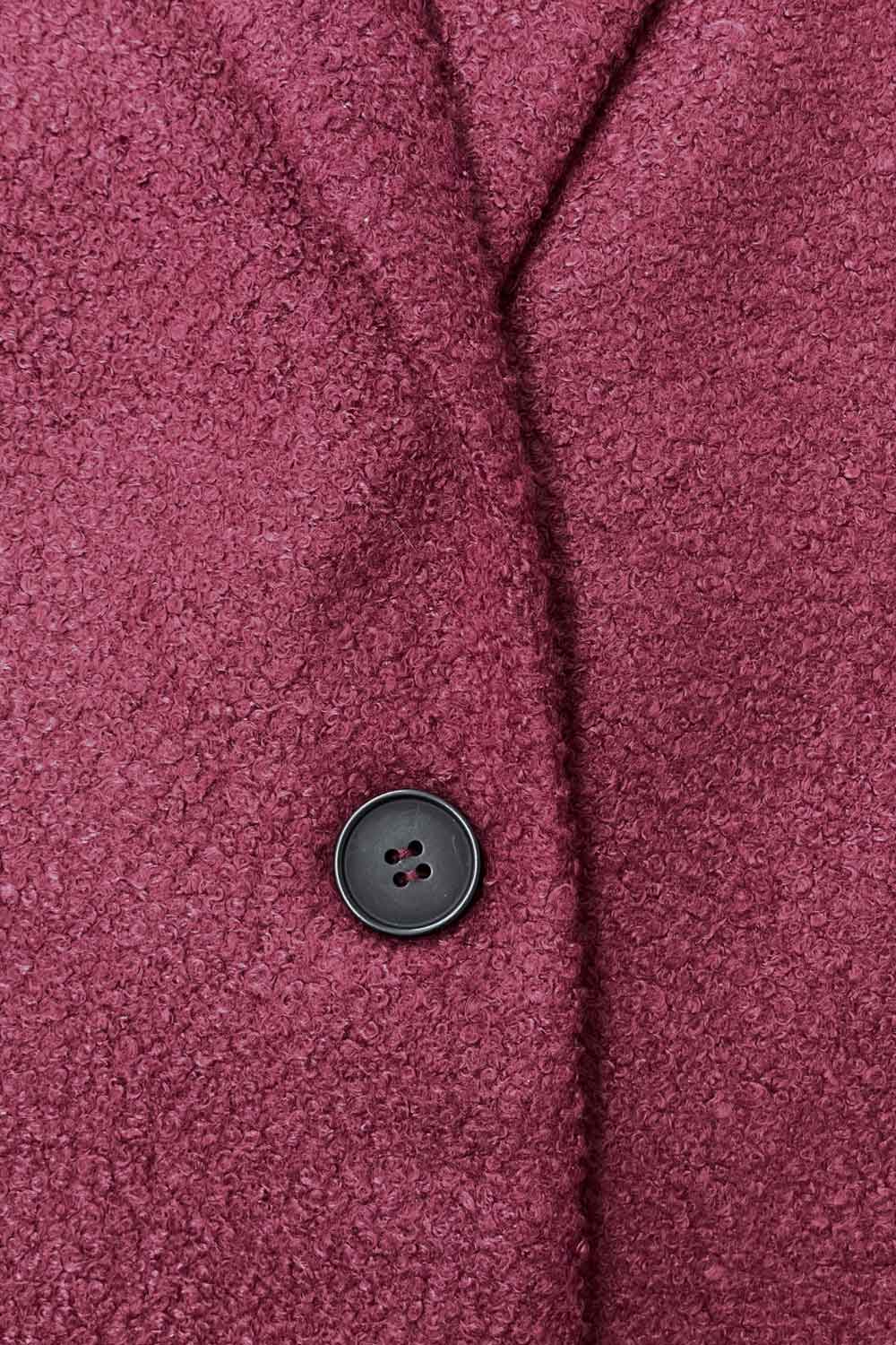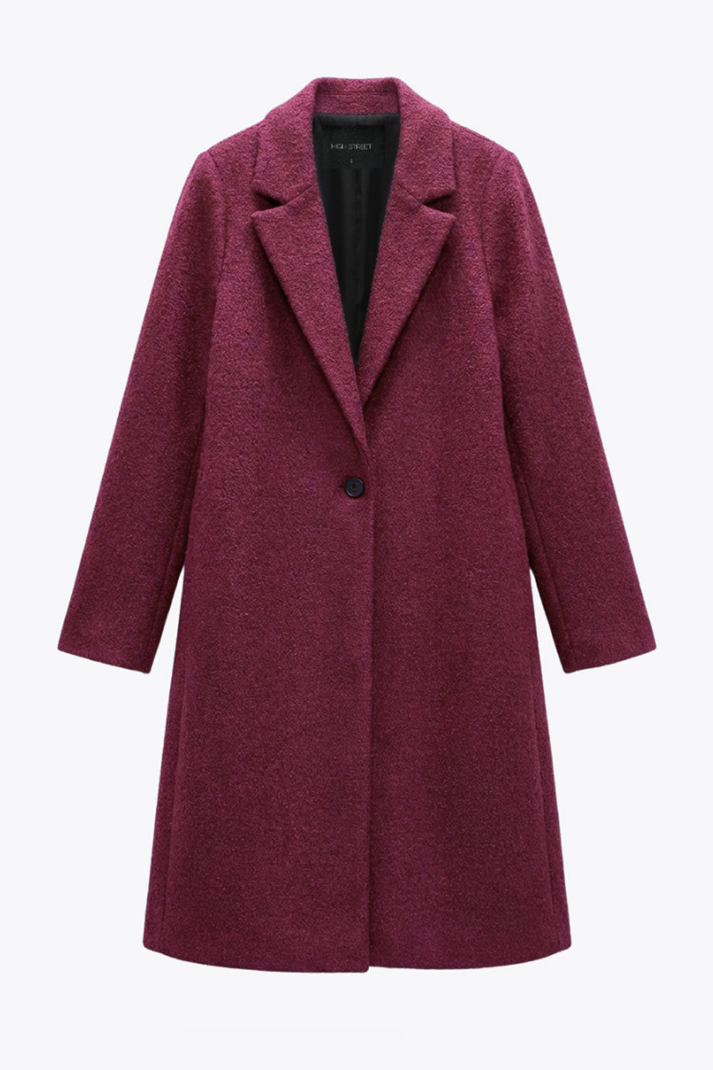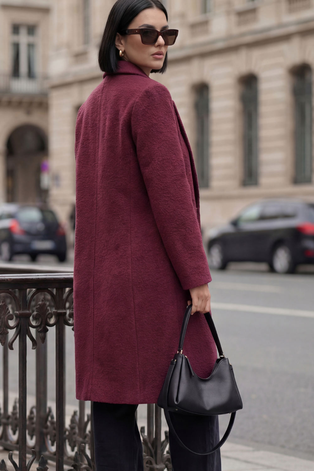 Abrigo largo de borreguillo, fit recto, con solapa y hombreras, manga larga y cierre frontal con botones en contraste.