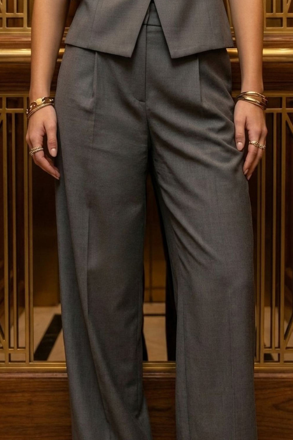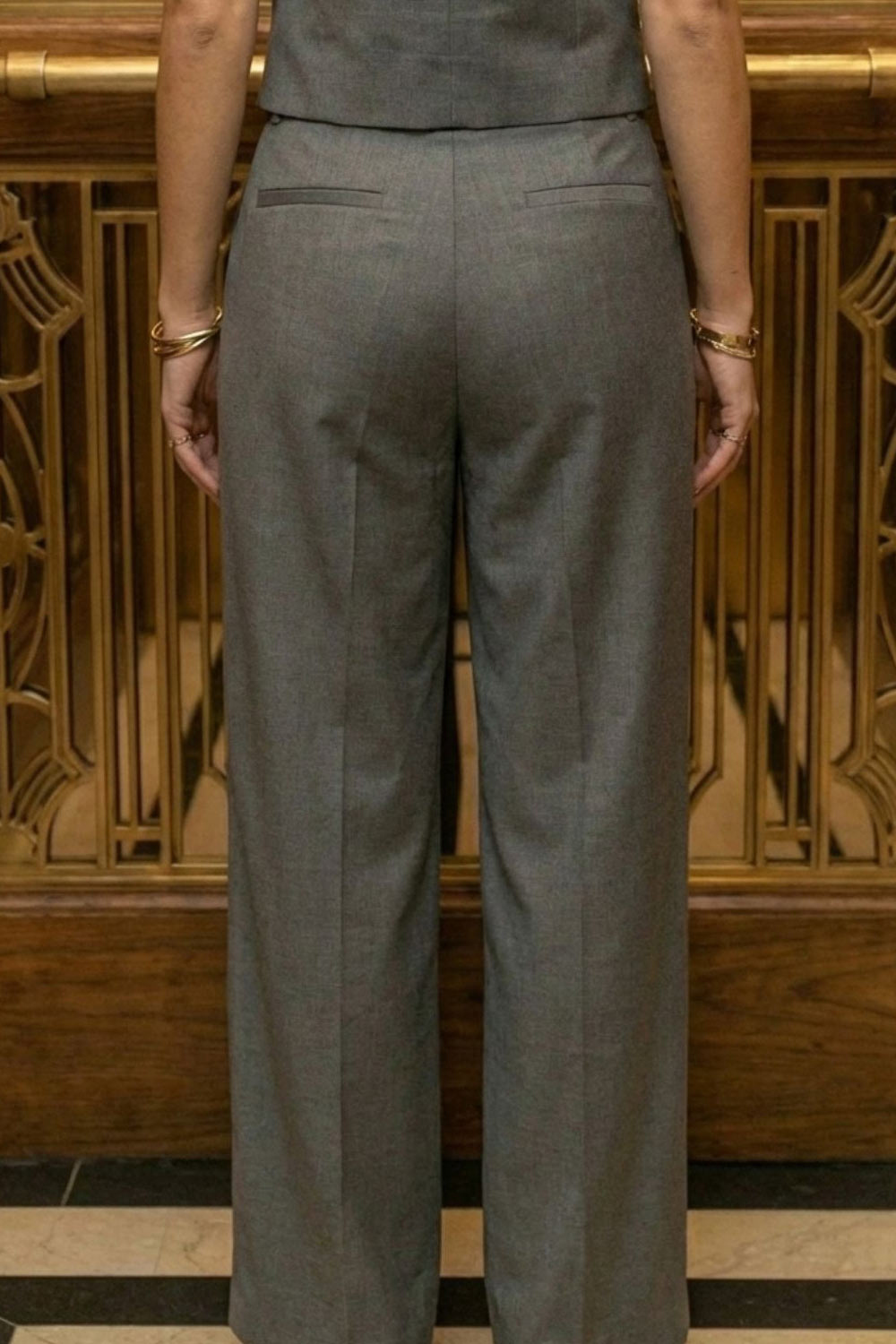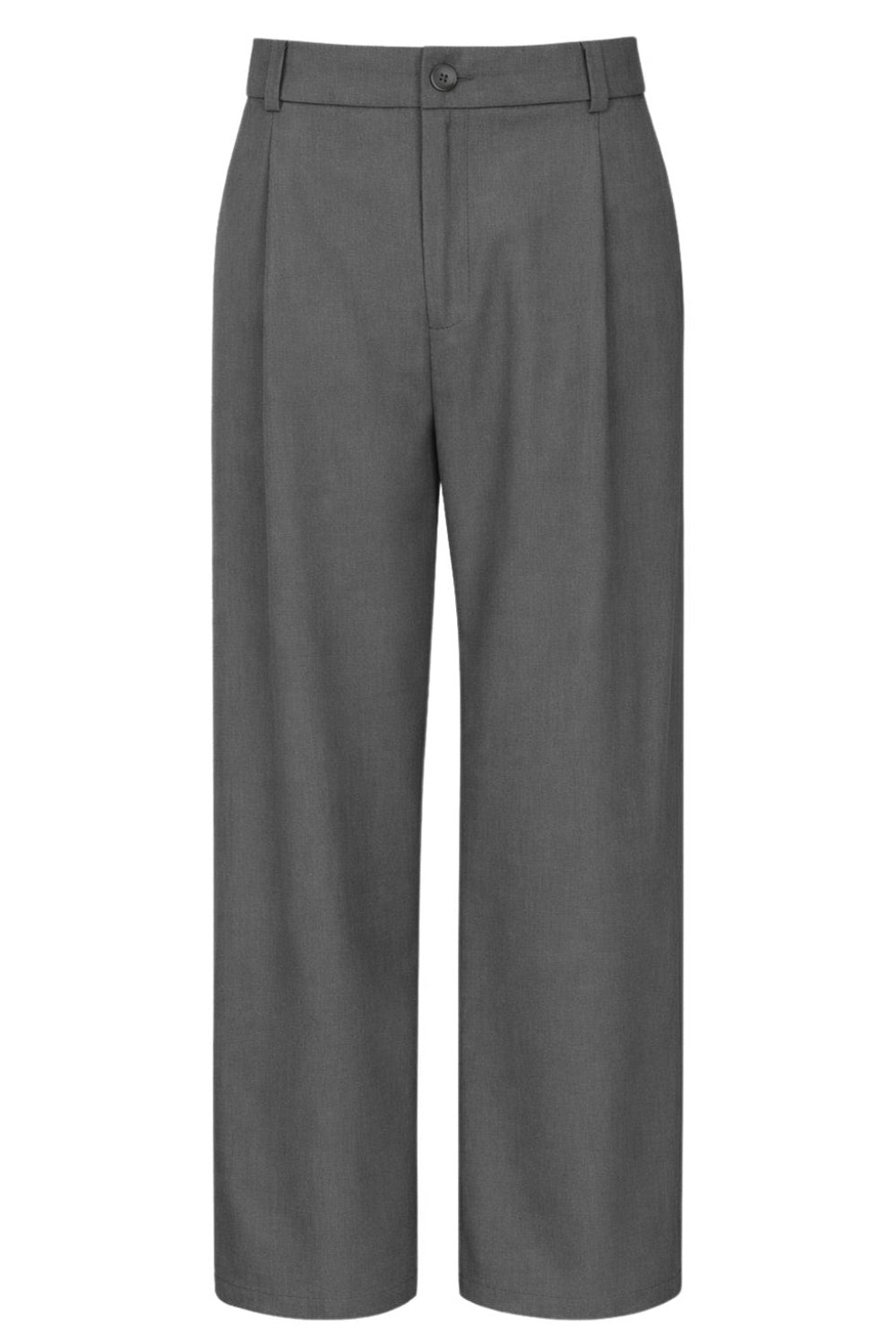 Pantalón de fit wide leg, pinzas frontales, cintura alta con pretina y trabillas, bolsillos delanteros y posteriores con vivos. Cierre frontal con botón y cremallera oculta.