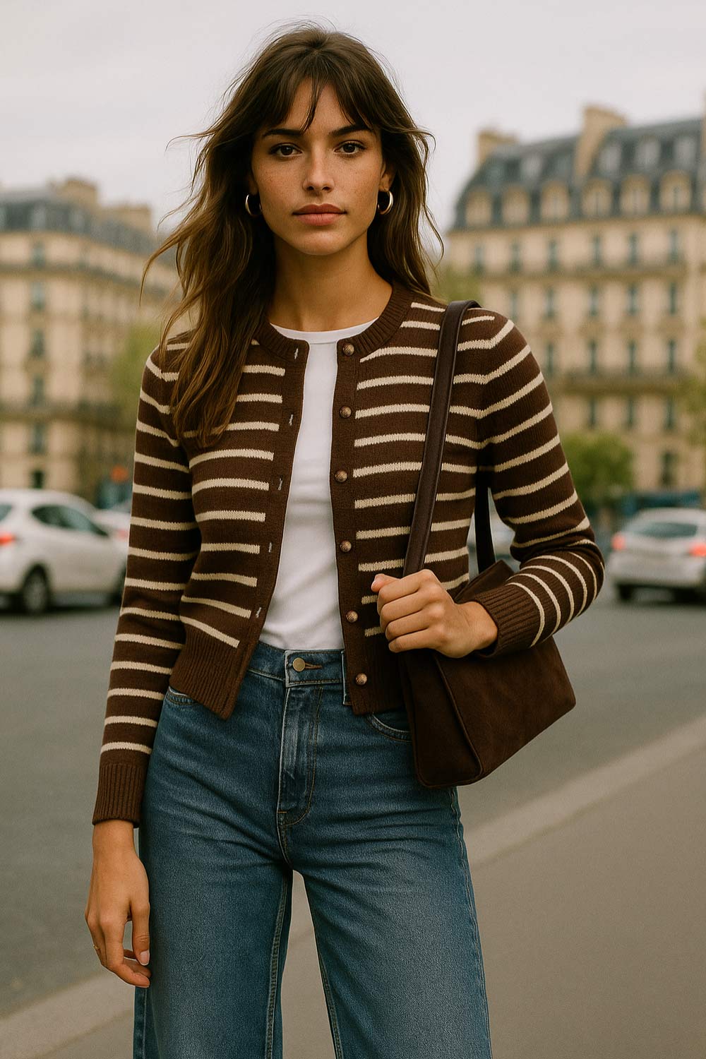 Cardigan de punto, estampado rayas, fit recto, manga larga con rib en puños, bajo y cuello redondo. Cierre frontal con hilera de botones en contraste.