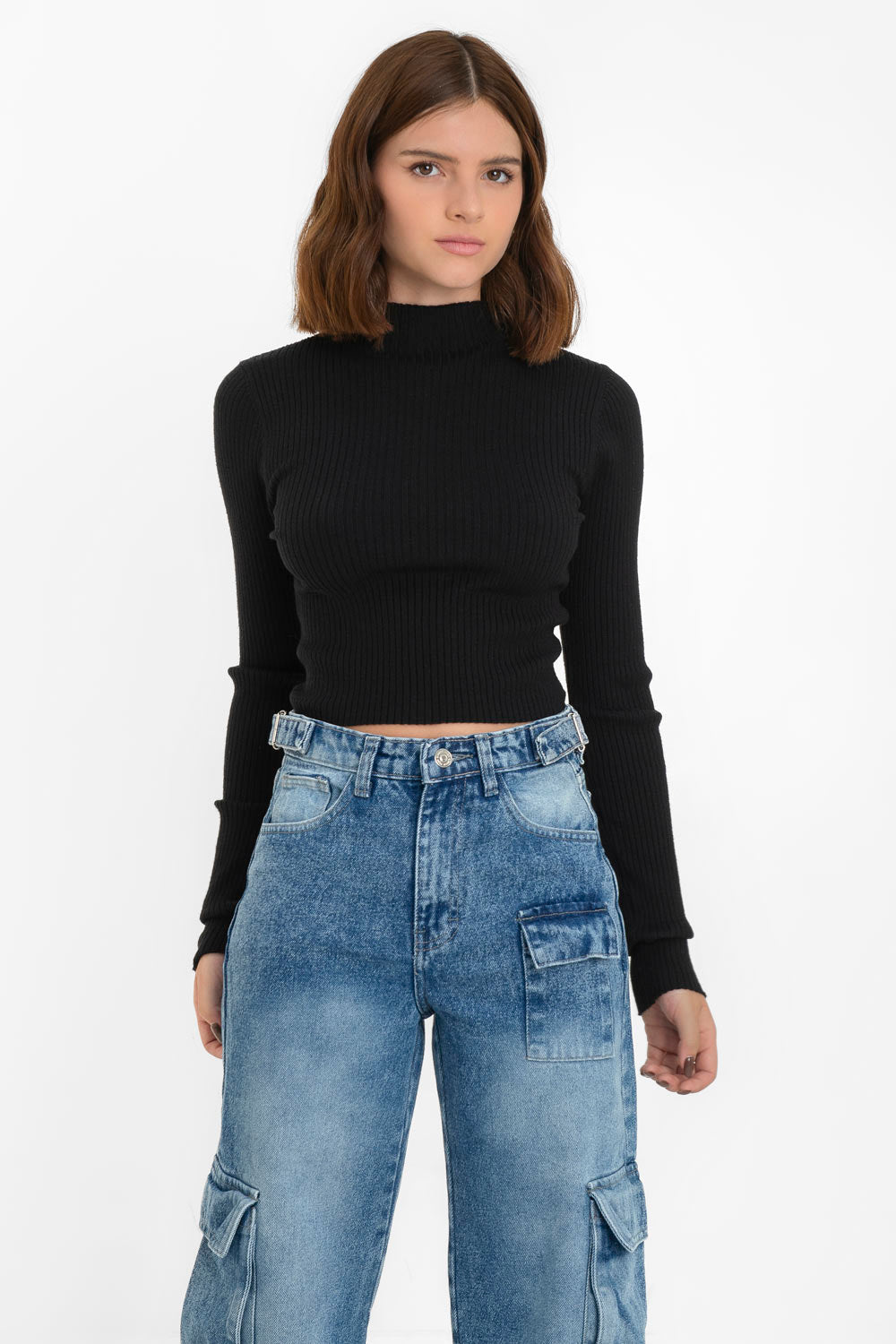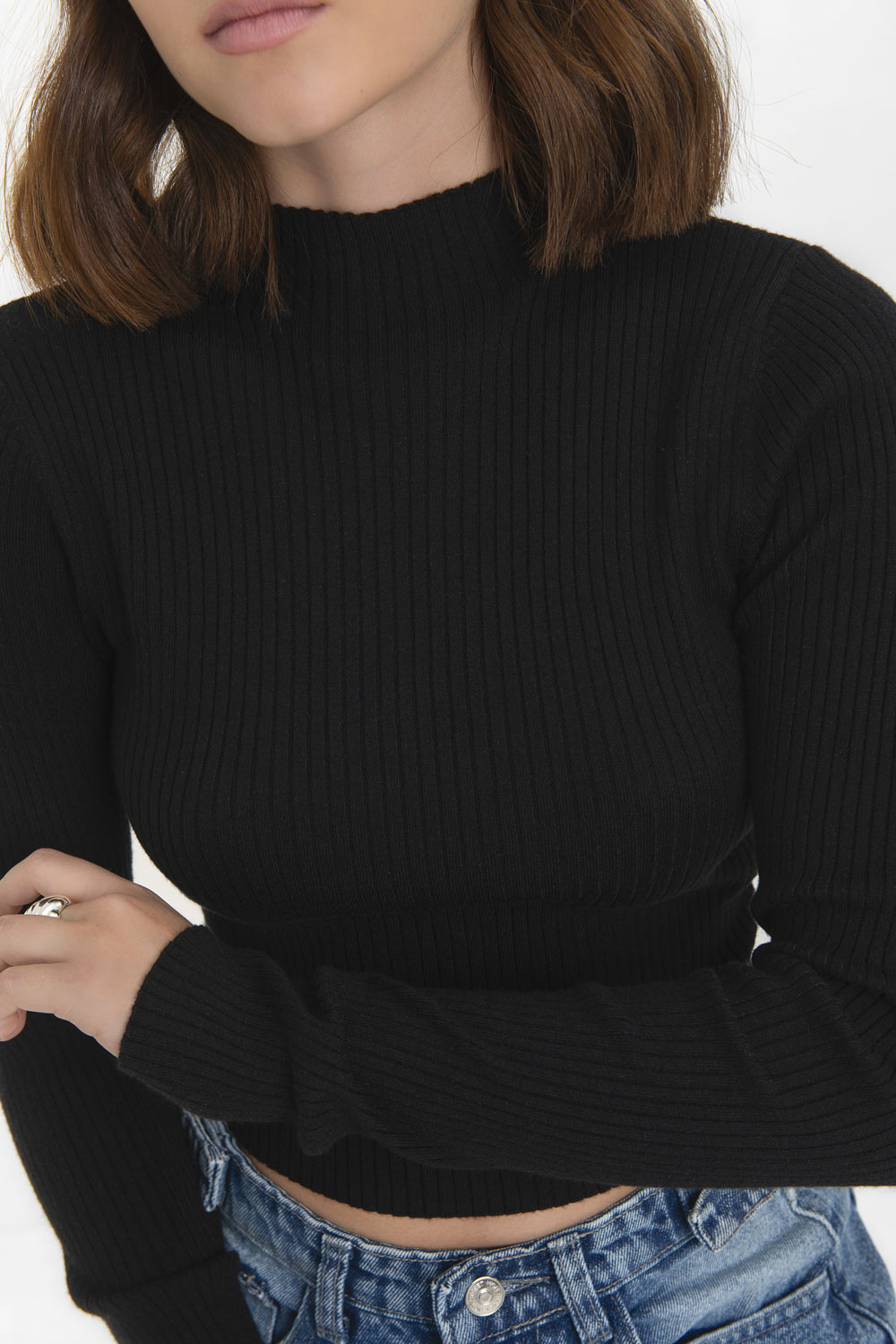 Jersey corto canalé de punto, fit ajustado, cuello mock con rib en borde y manga larga.