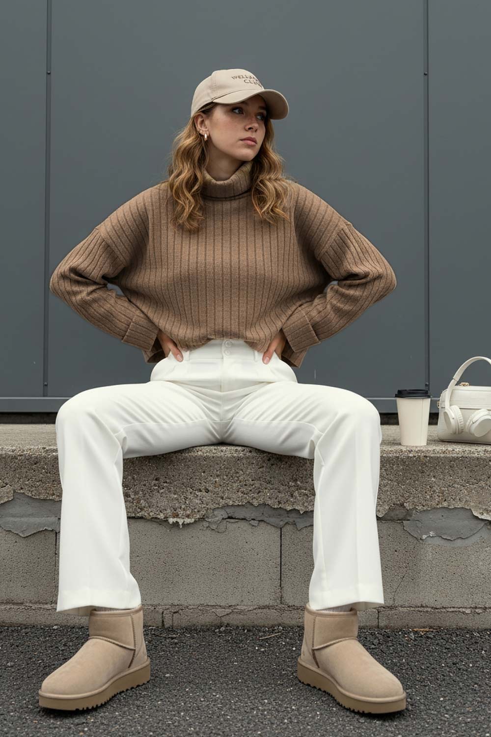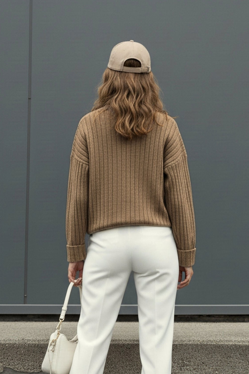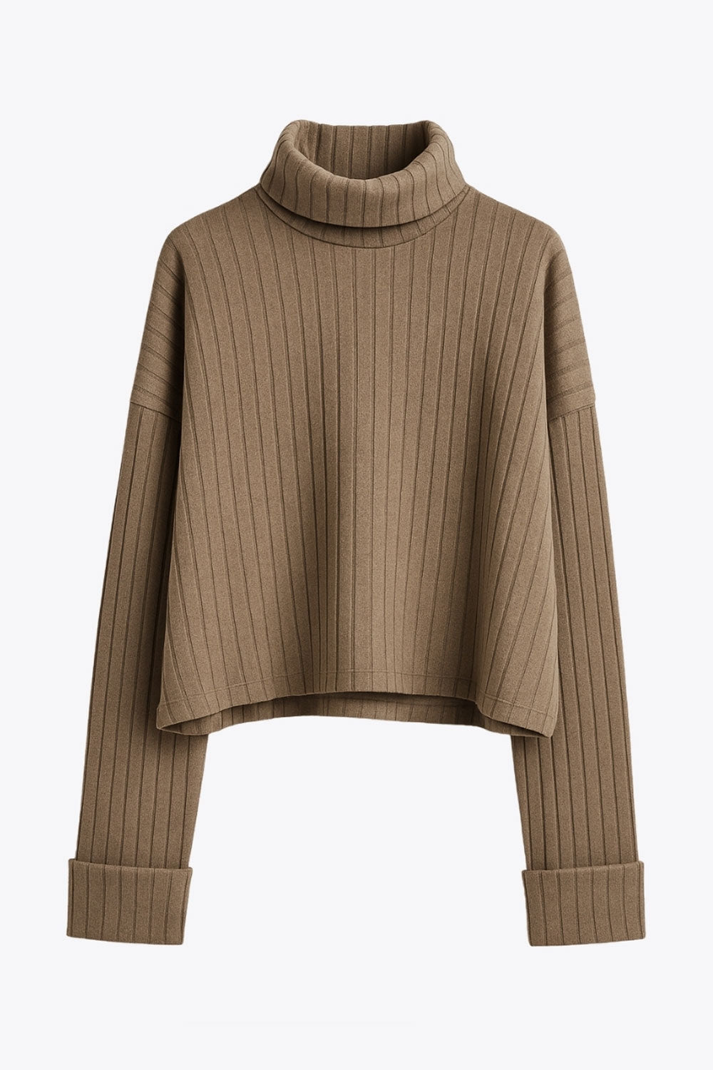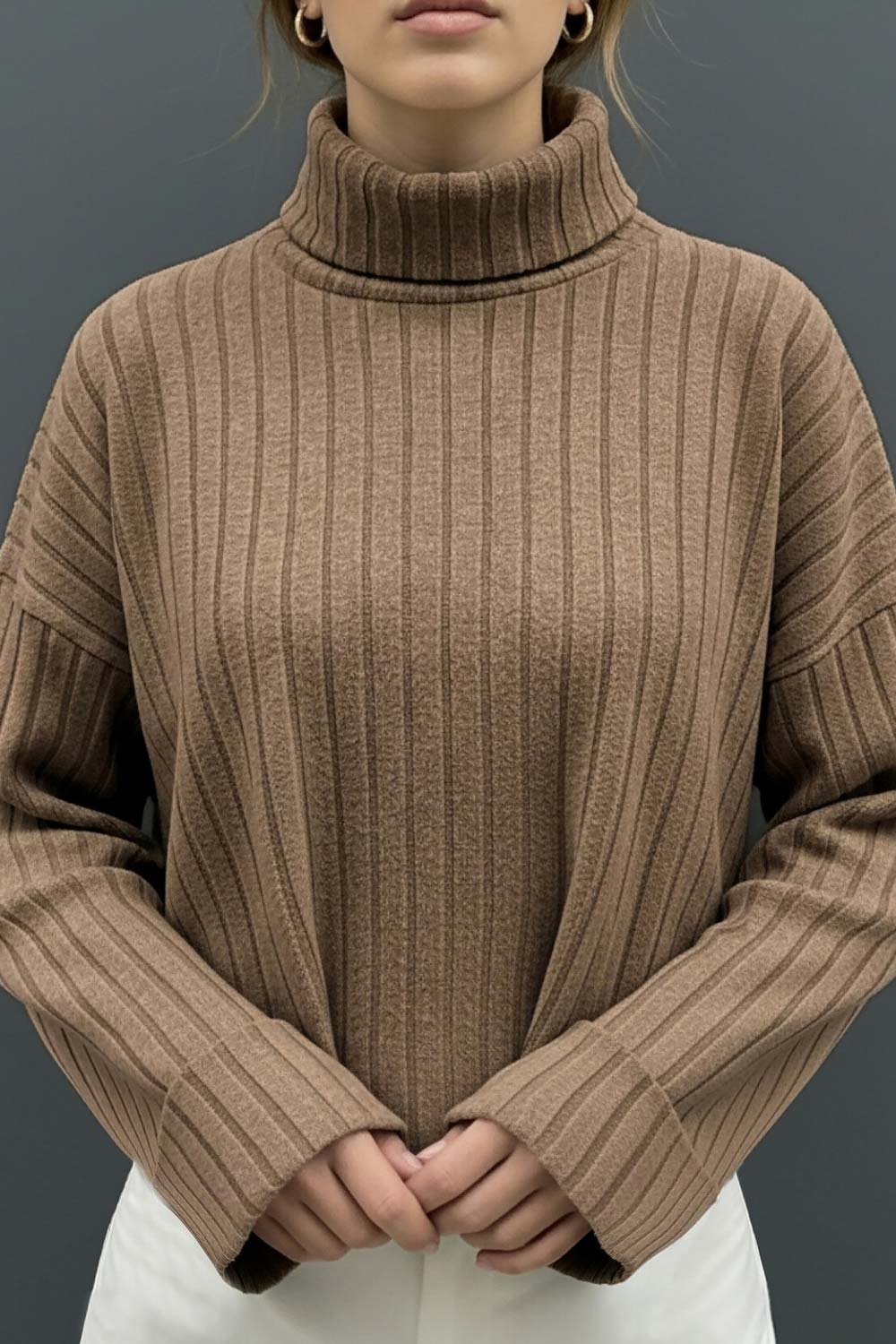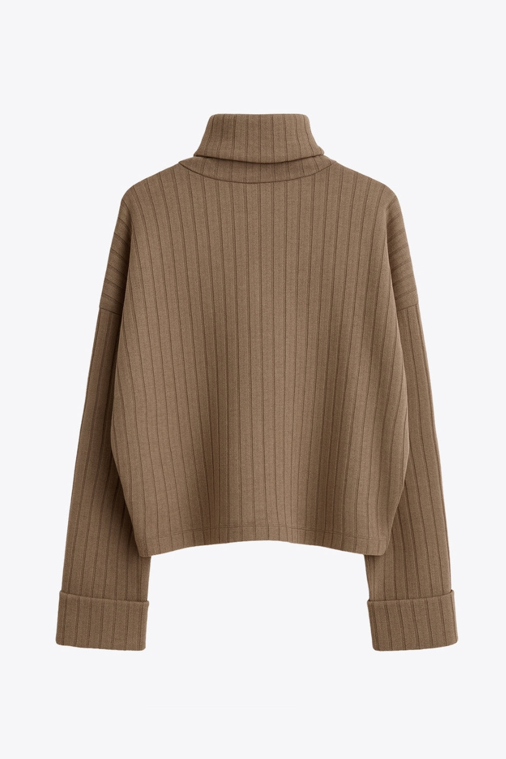 Jersey canalé de fit fluido, cuello alto con doblez, manga larga con hombro caído y doblez en puños.