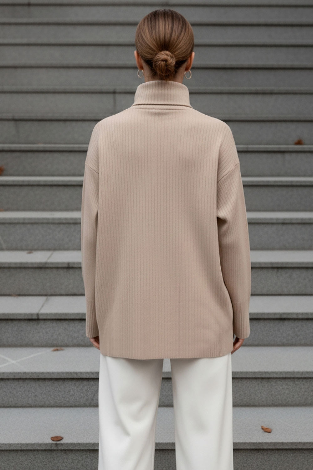 Jersey canalé de punto, fit oversized, cuello alto con doblez y manga larga.