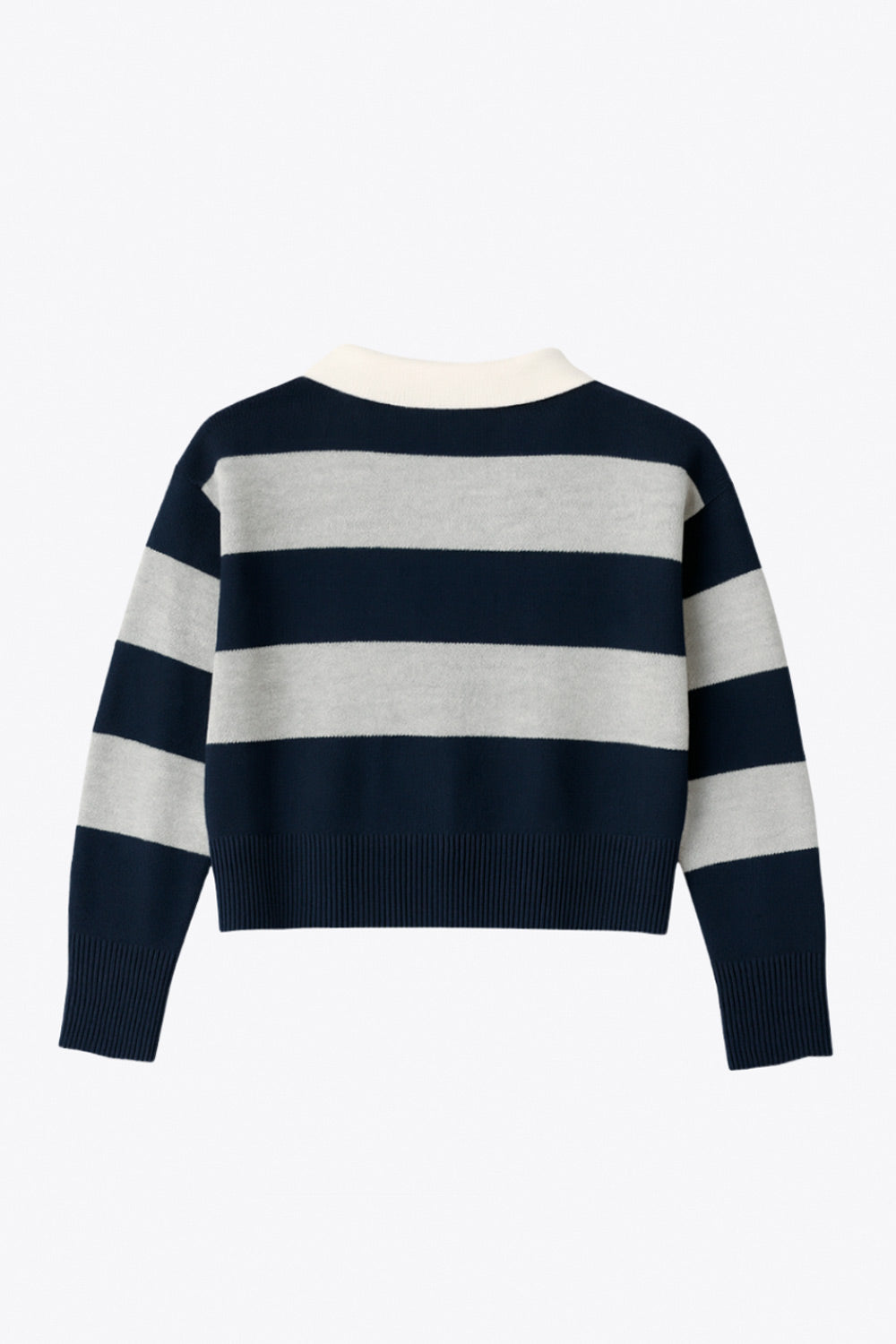 Jersey corto de punto, estampado rayas, fit recto, manga larga con rib en puño y escote v con cuello polo en contraste.