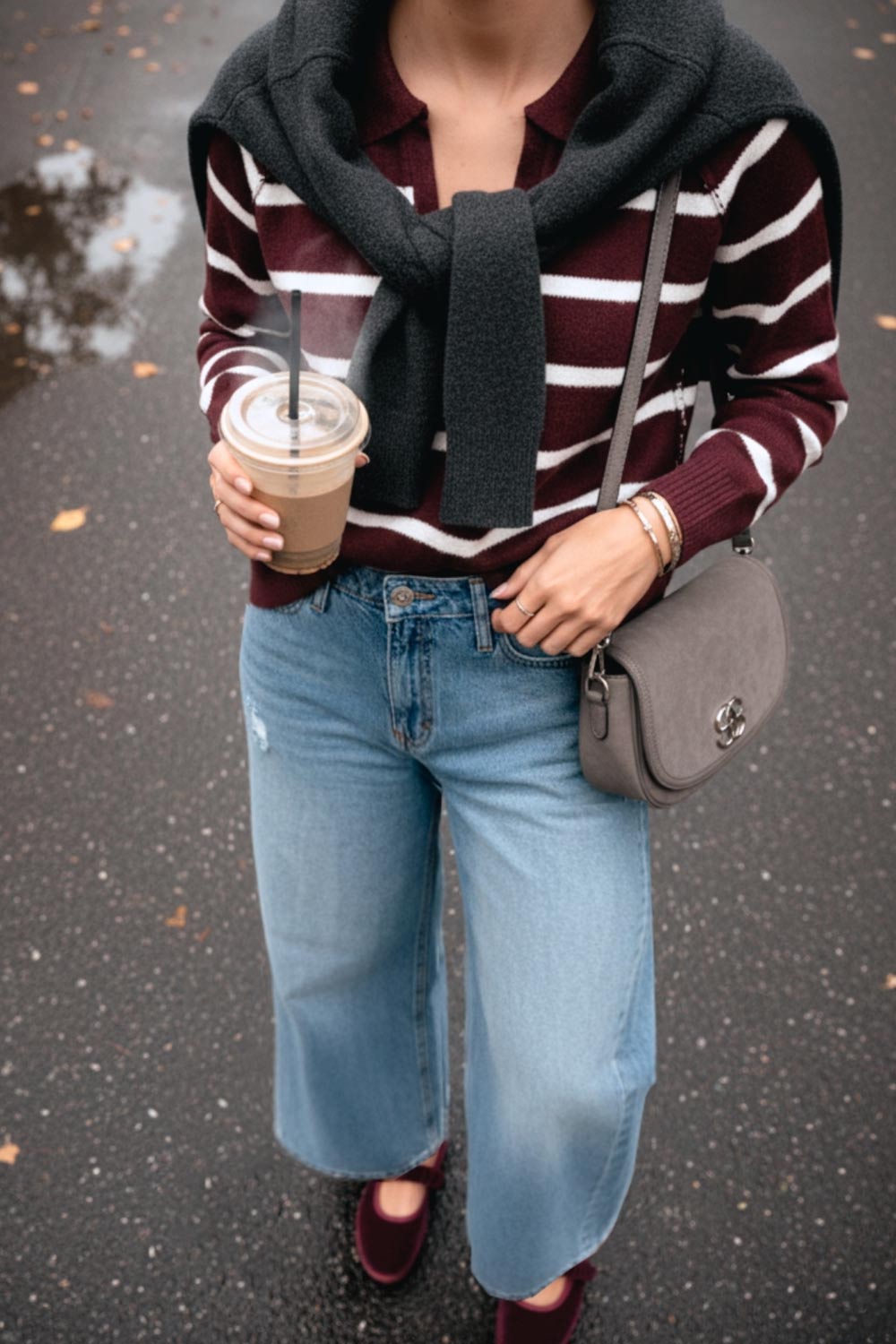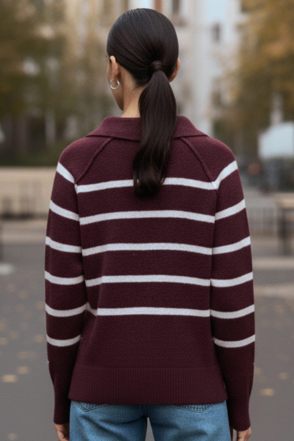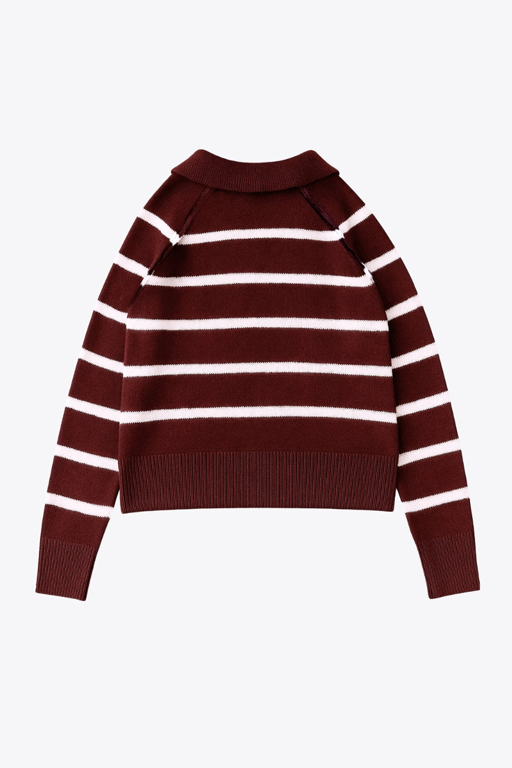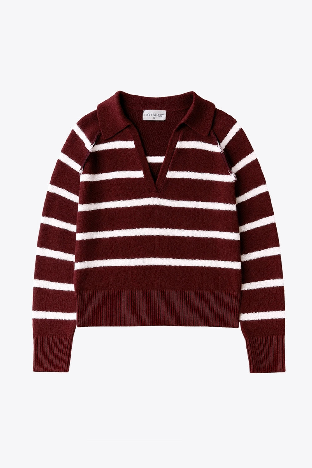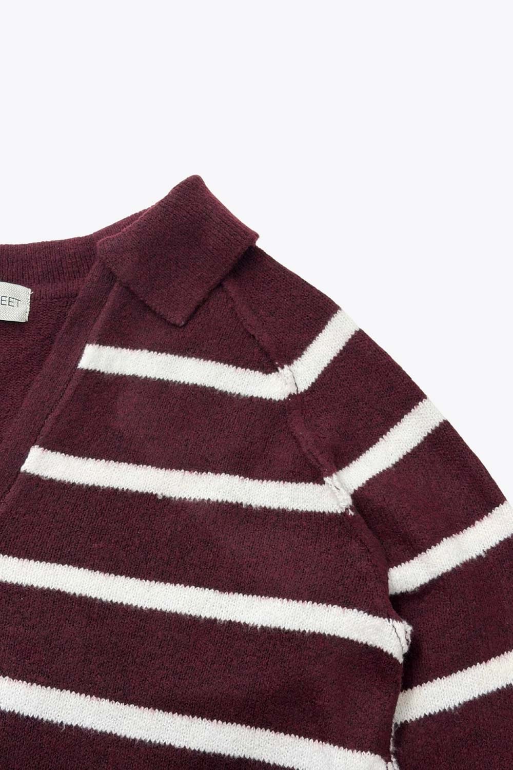 Jersey de punto, estampado rayas, fit recto, manga larga con rib en puños y escote v con cuello polo.