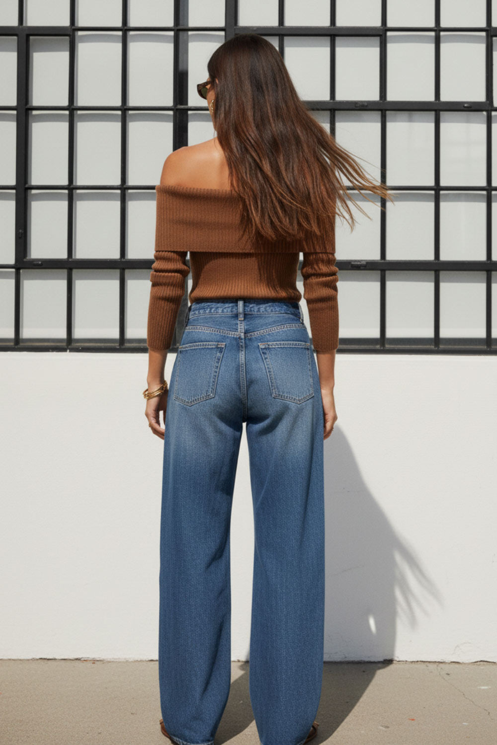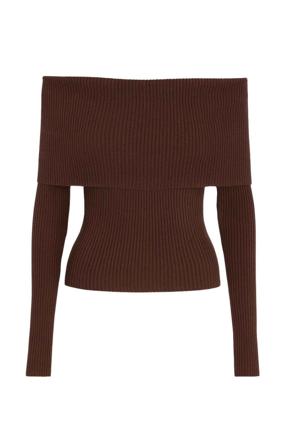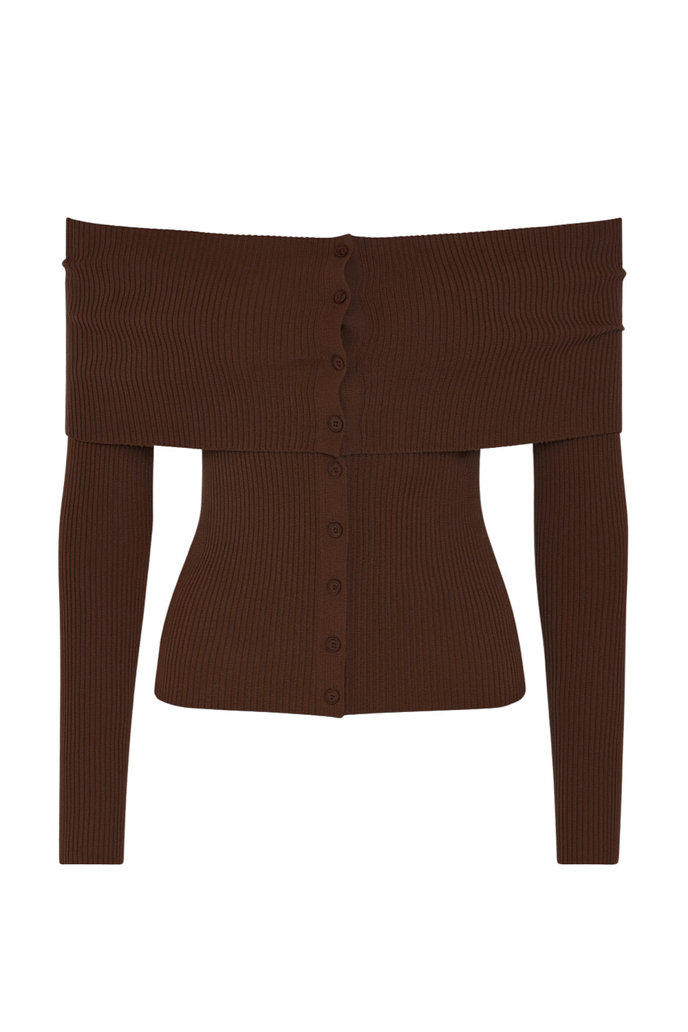 Top canalé de fit ajustado, manga larga, hombros descubiertos, escote recto con doblez en borde y cierre frontal con hilera de botones.
