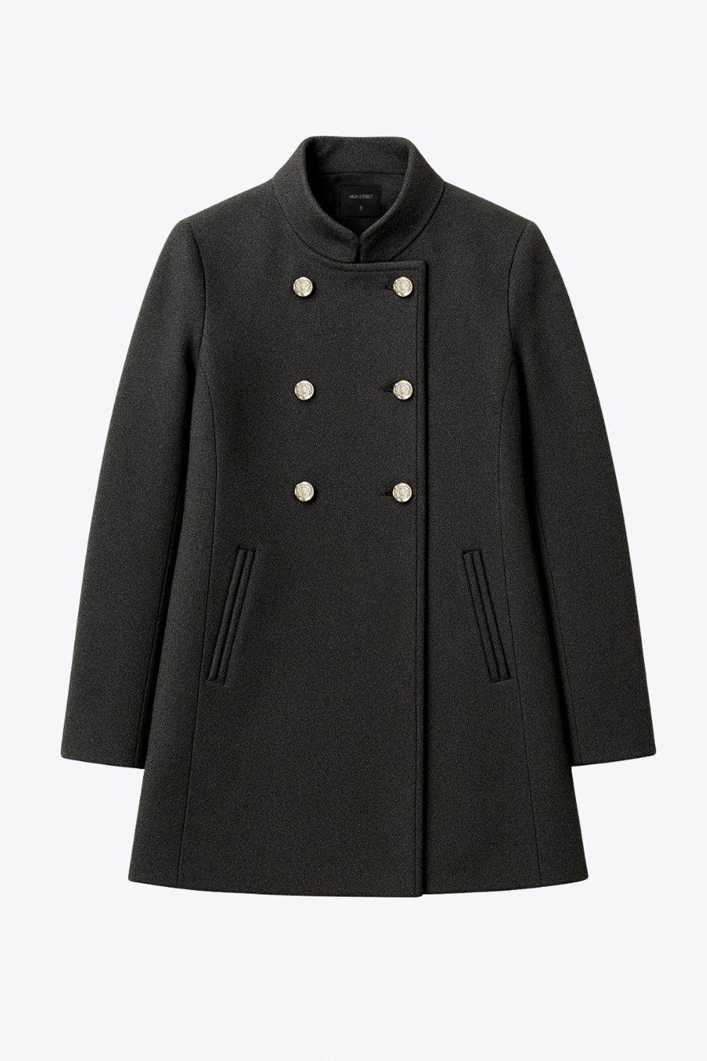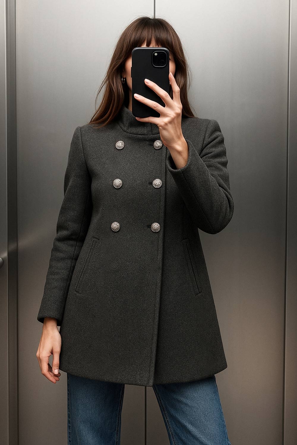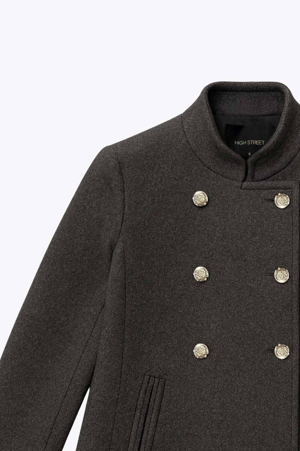 Abrigo cruzado de cuello alto, bolsillos delanteros y manga larga. Cierre frontal con doble cruce de botones en contraste.