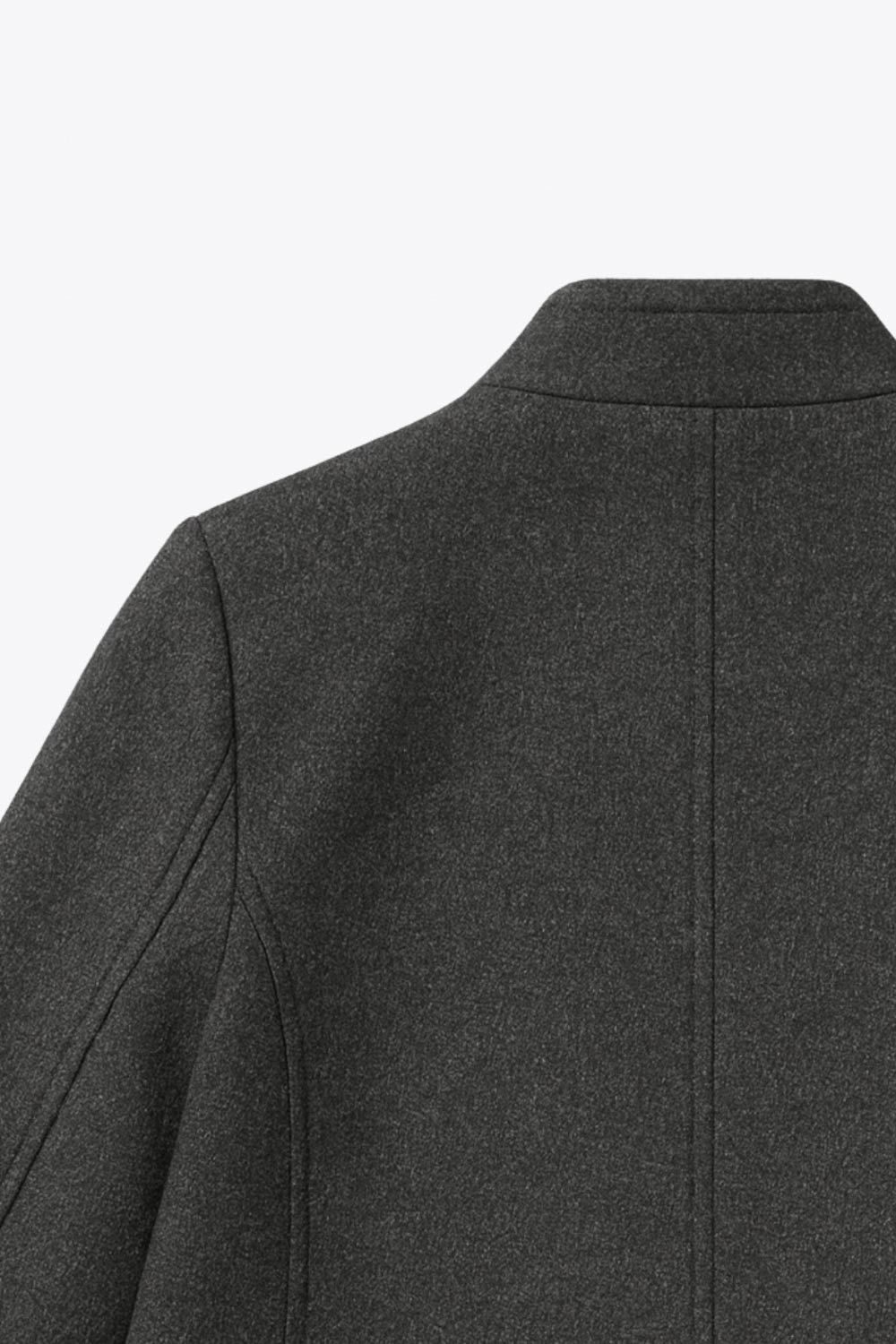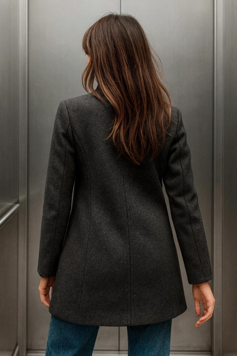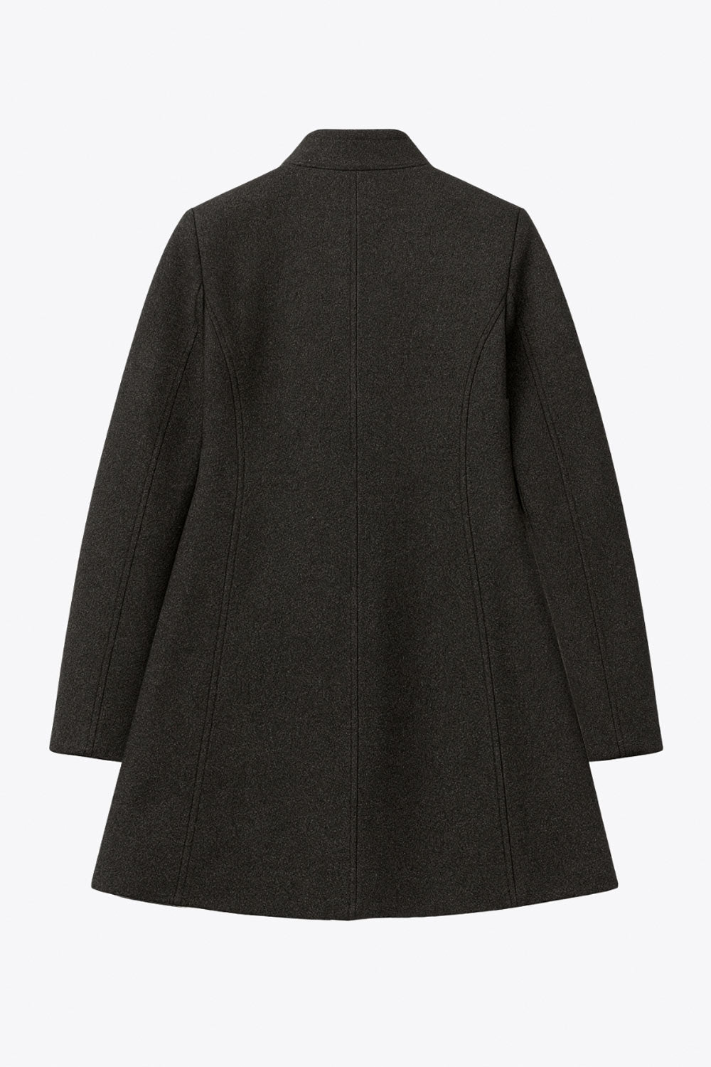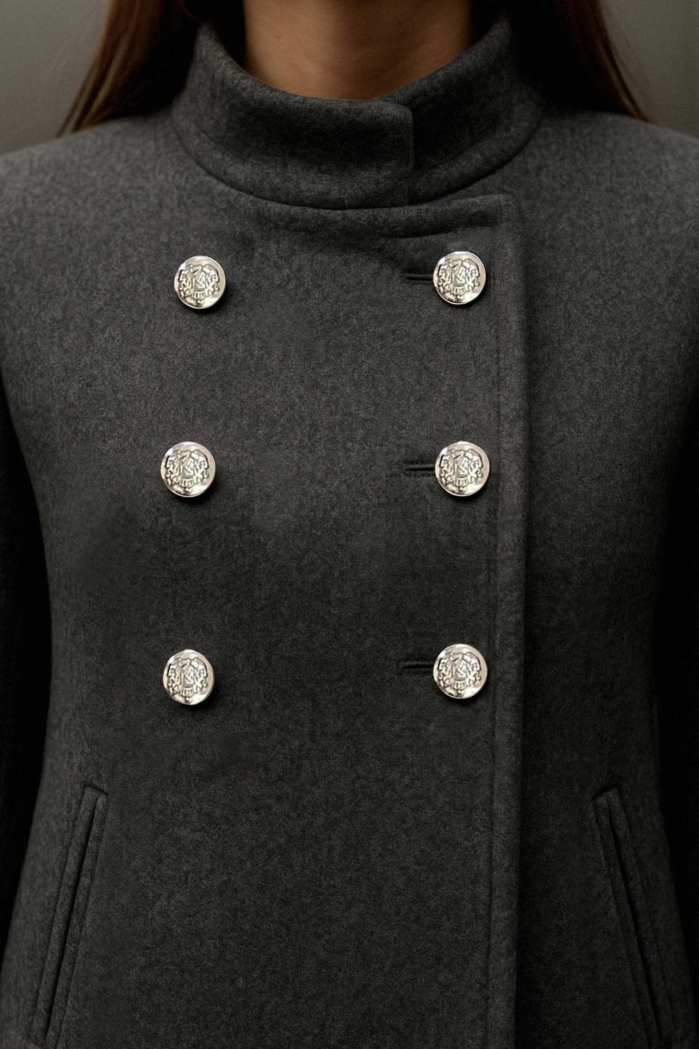 Abrigo cruzado de cuello alto, bolsillos delanteros y manga larga. Cierre frontal con doble cruce de botones en contraste.