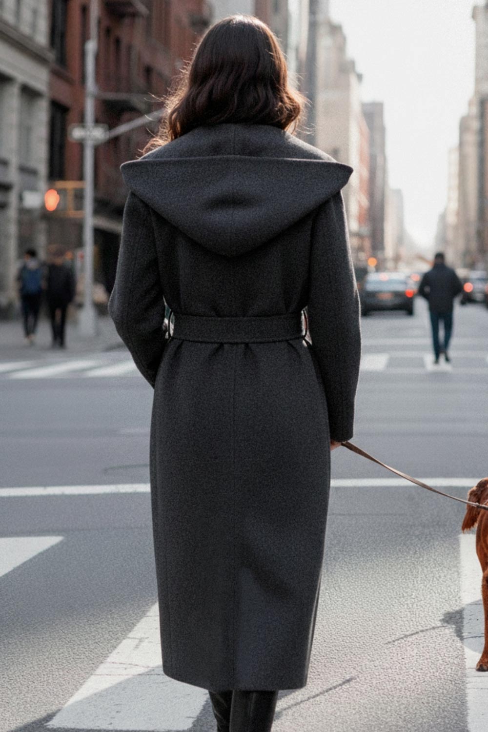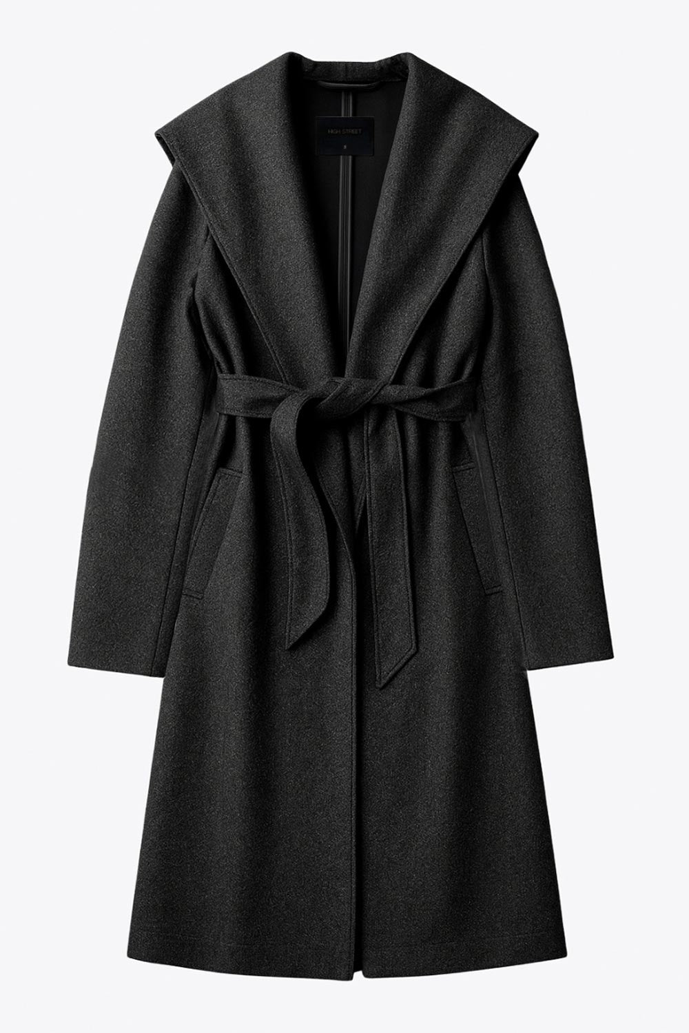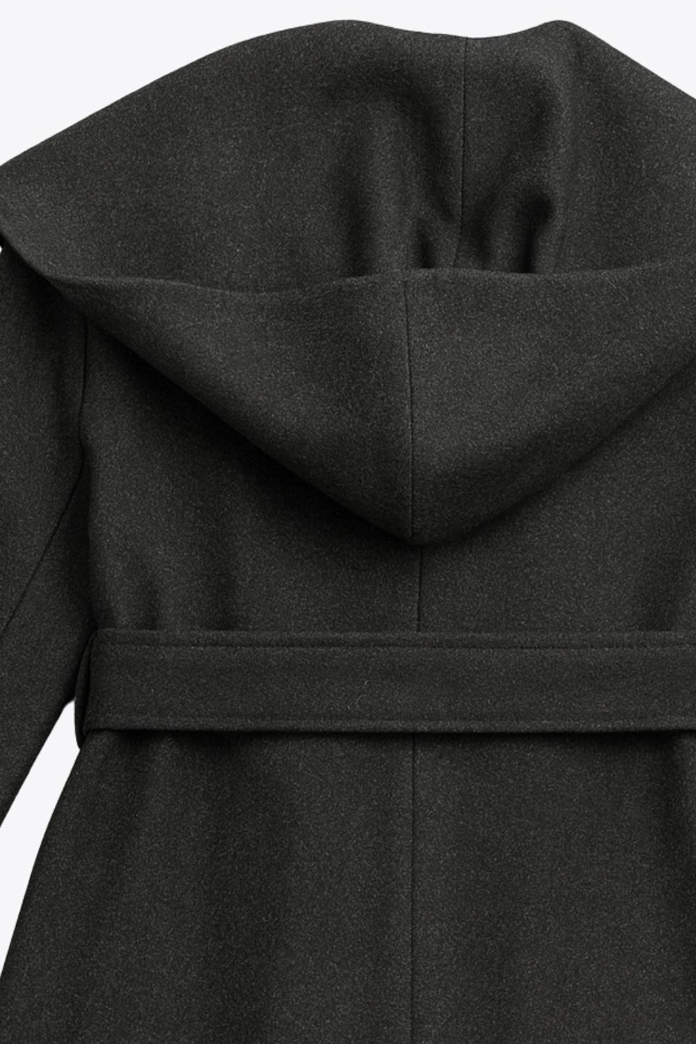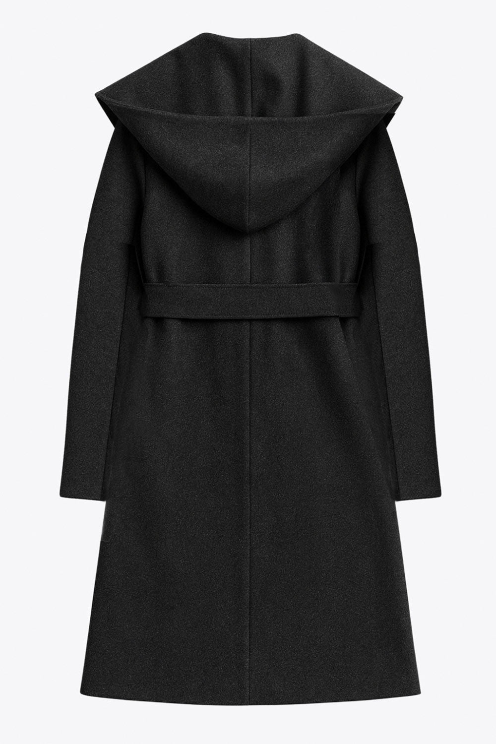 Abrigo largo de fit recto con capucha, manga larga y bolsillos delanteros. Detalle de trabillas y cinturón amarrable del mismo tejido.