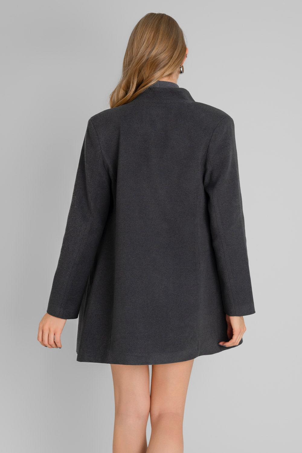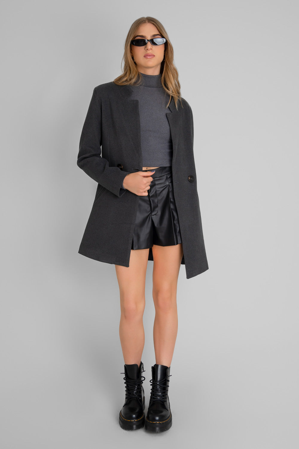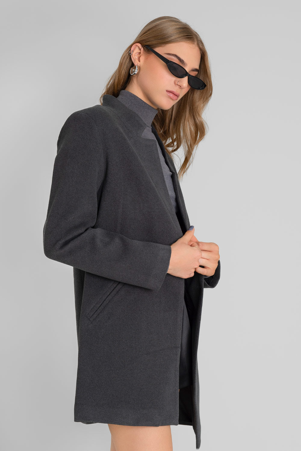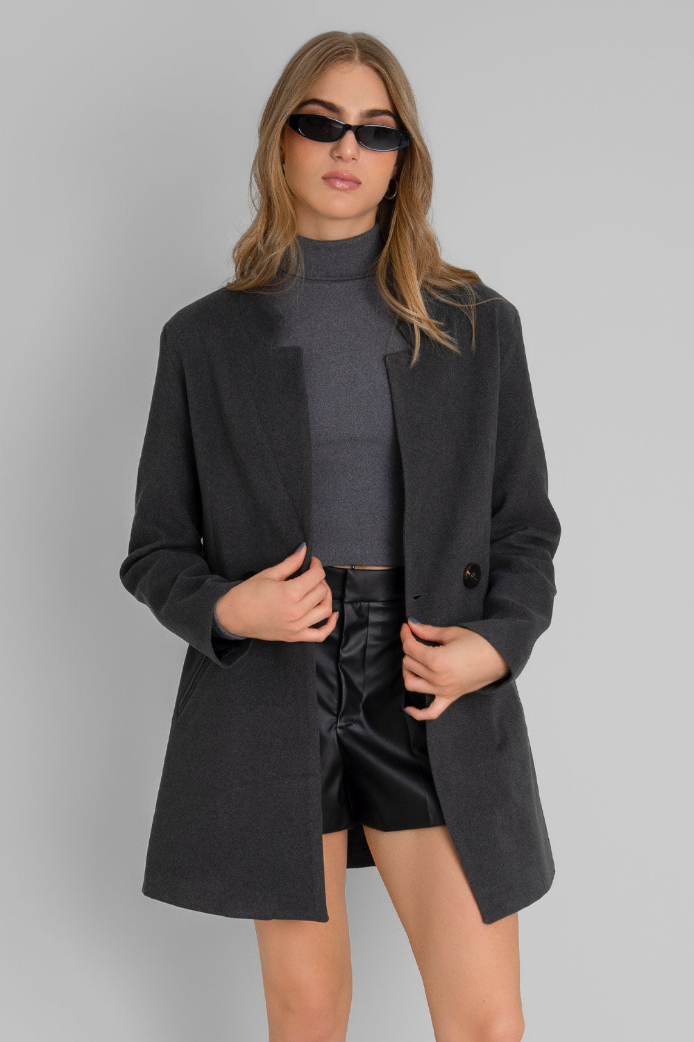 Abrigo largo de fit recto, con solapa y hombreras, manga larga y bolsillos frontales con vivos. Cierre frontal con botón en contraste.