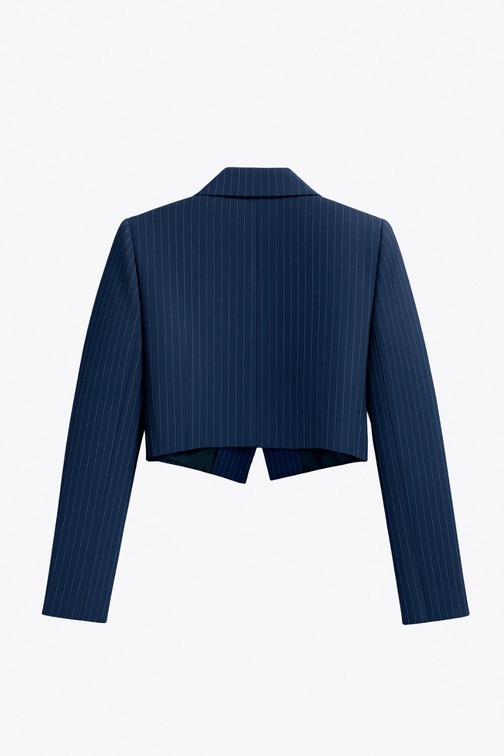Blazer corto cruzado de fit ajustado, estampado rayas, manga larga, solapa, hombreras y cierre frontal con doble cruce de botones en contraste.