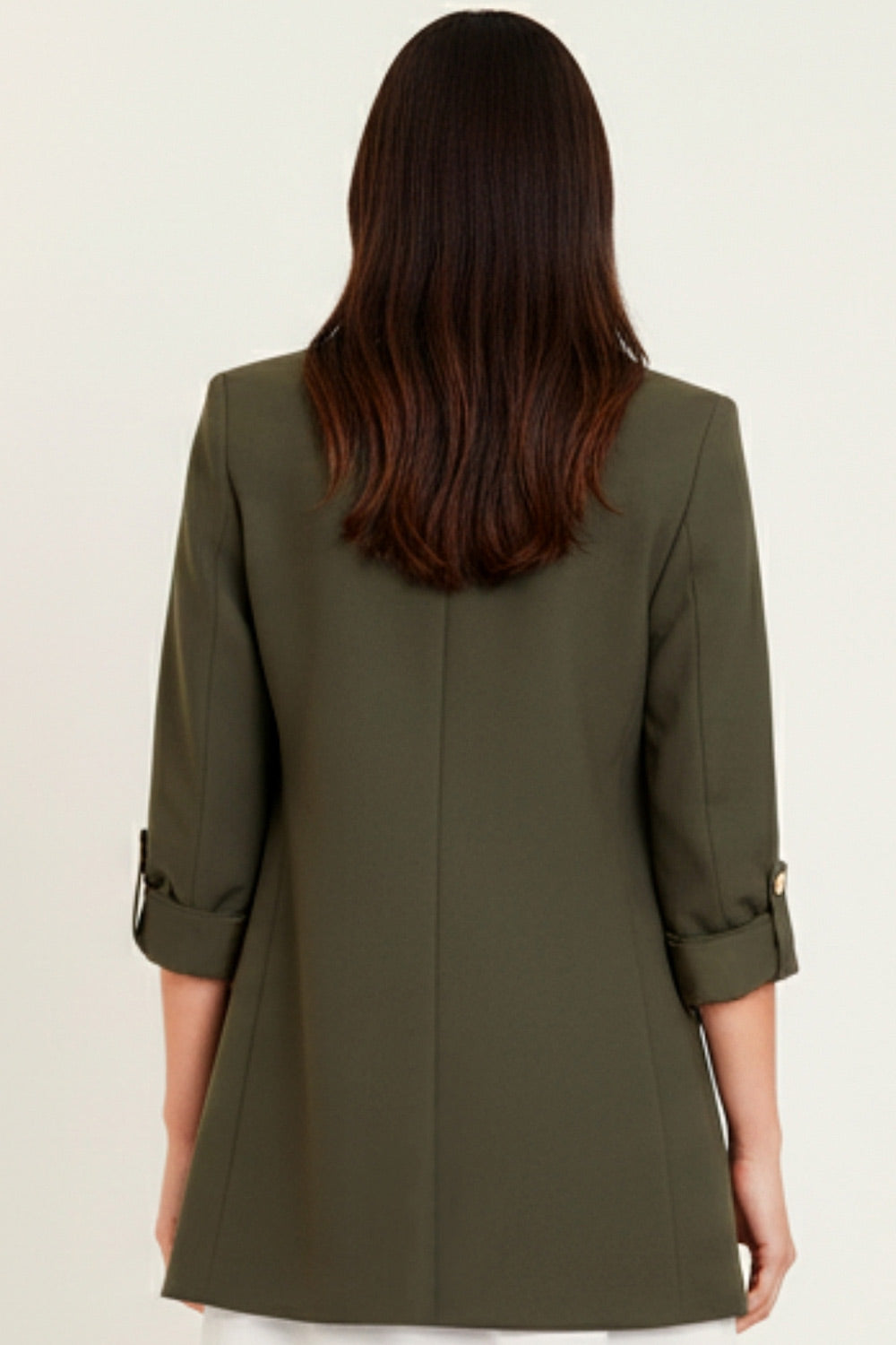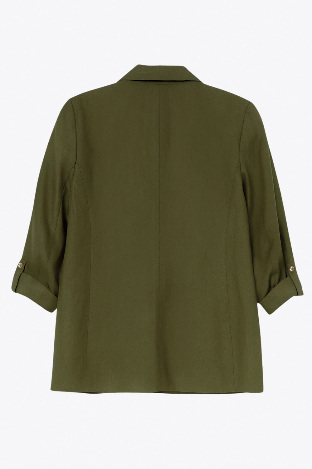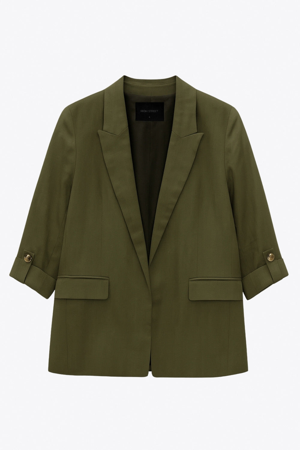 Blazer abierto de fit ligeramente oversized, manga 3/4 rolled up con trabilla decorativa y botón en contraste. Detalle de bolsillos delanteros con cartera.