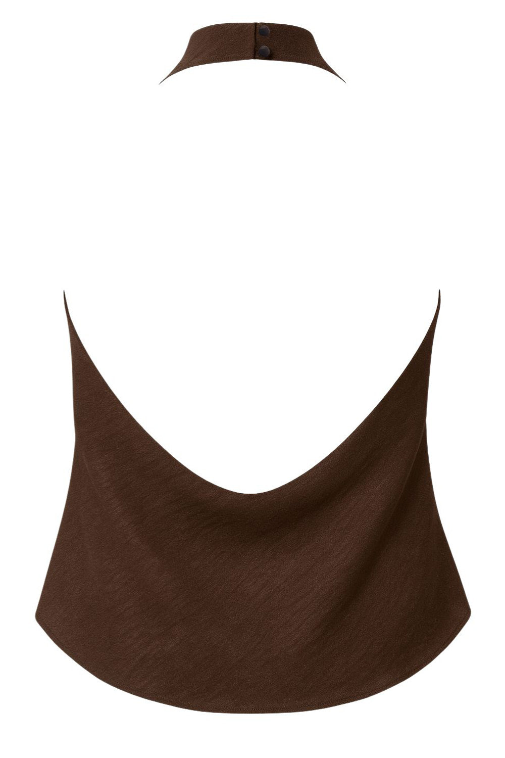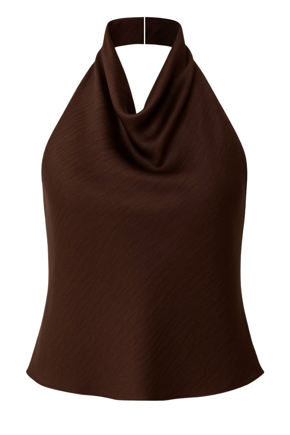 Blusa corta fluida, de cuello alto halter con plisados, sin mangas, escote en espalda, cierre posterior con botón y ojal.