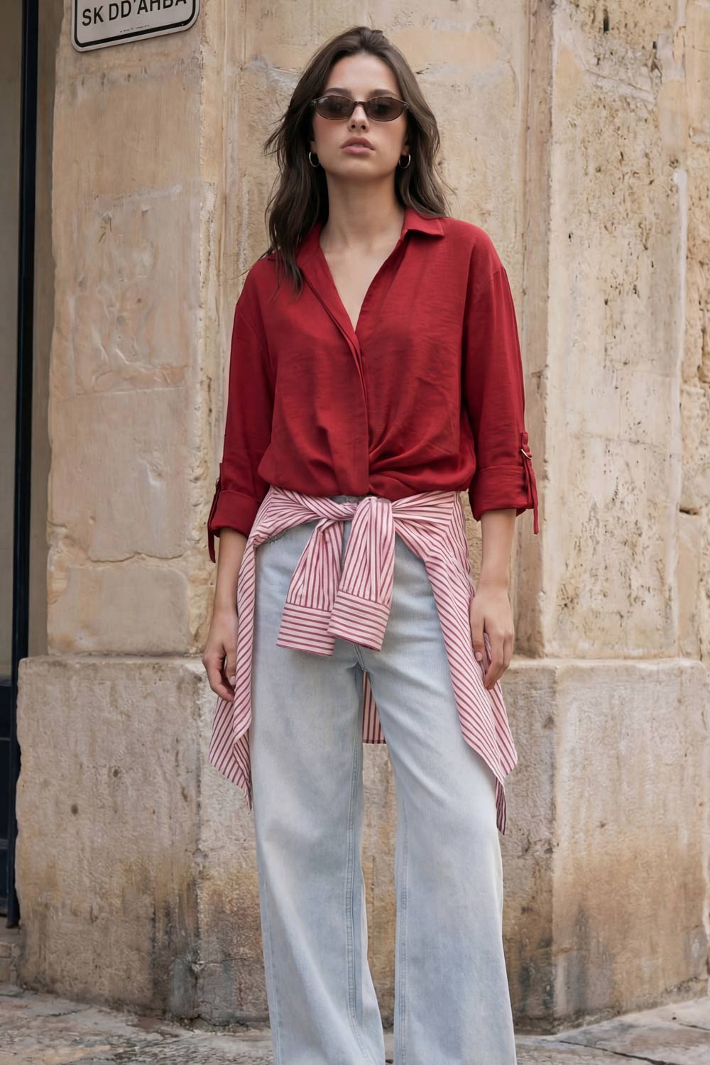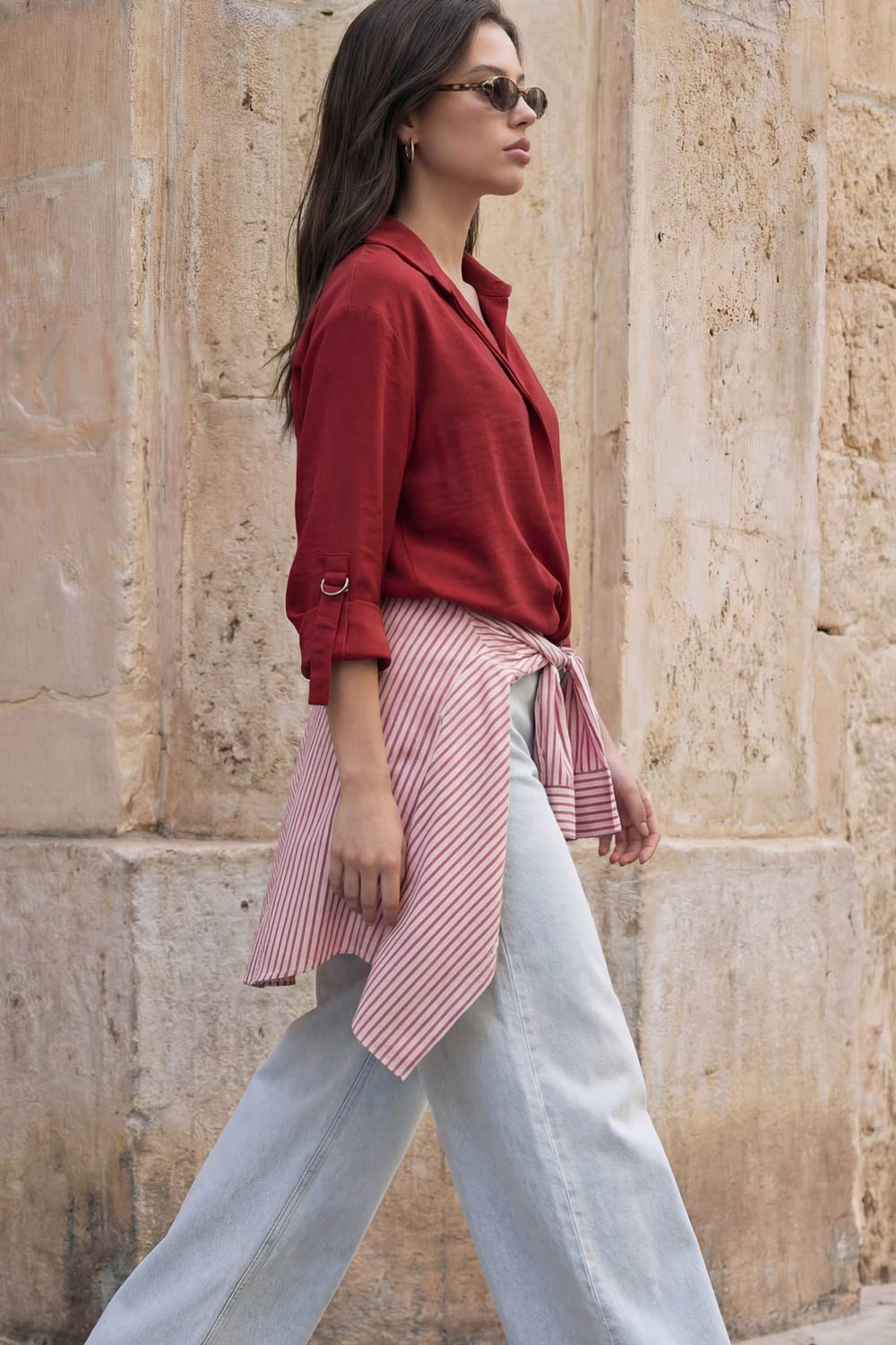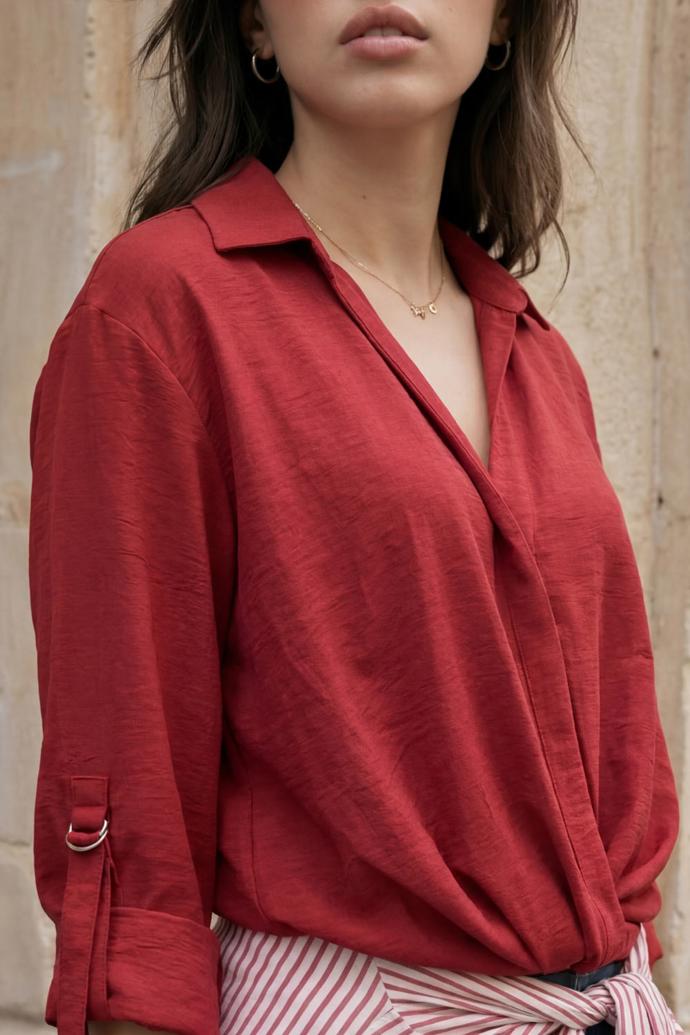 Camisa corta de fit recto, manga larga rolled up con trabilla ajustable, cuello camisero, cruce frontal con escote v y nudo decorativo en bajo. Detalle de bajo curveado y pinza de amplitud en espalda.